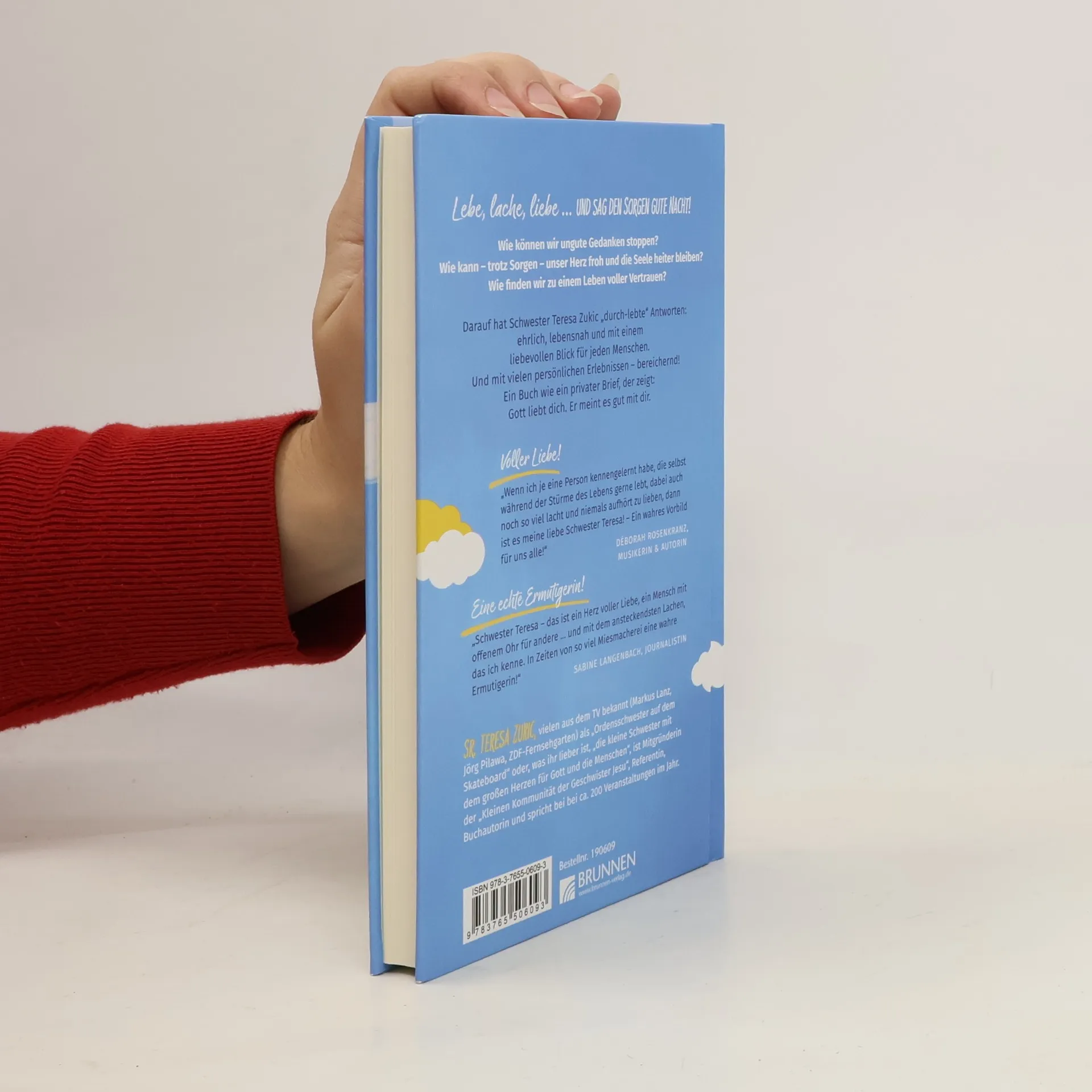 "Schwester Teresa macht sich Sorgen um die Sorgen. Zum Glück. Die meisten Menschen sorgen sich viel zu viel. Höchste Zeit, sich mit dem leidigen Phänomen des Sorgens mal ein bisschen intensiver zu beschäftigen. Und da ist Schwester Teresa genau die Richtige. Eine fromme Tausendsassa, die mit beiden Beinen auf dem Boden steht und dabei den Blick immer fest in den Himmel gerichtet hält. Vor allem aber schafft sie es auf eindrückliche Weise, dass einem bei so einem Thema das Lachen nicht vergeht, sondern die Seele heiter und das Herz froh wird.", so der Schriftsteller, Musiker, Kabarettist und Pfarrer Fabian Vogt über Teresa Zukics neues Buch. In "Lebe, lache, liebe ... und sag den Sorgen Gute Nacht!" beschreibt Teresa Zukic, wie es gelingen kann, die Macht unguter Gedanken zu stoppen, damit die Seele trotz aller Sorgen wieder heiter und das Herz froh wird. Und es geht um das Licht Gottes, das unsere Tage hell machen will.