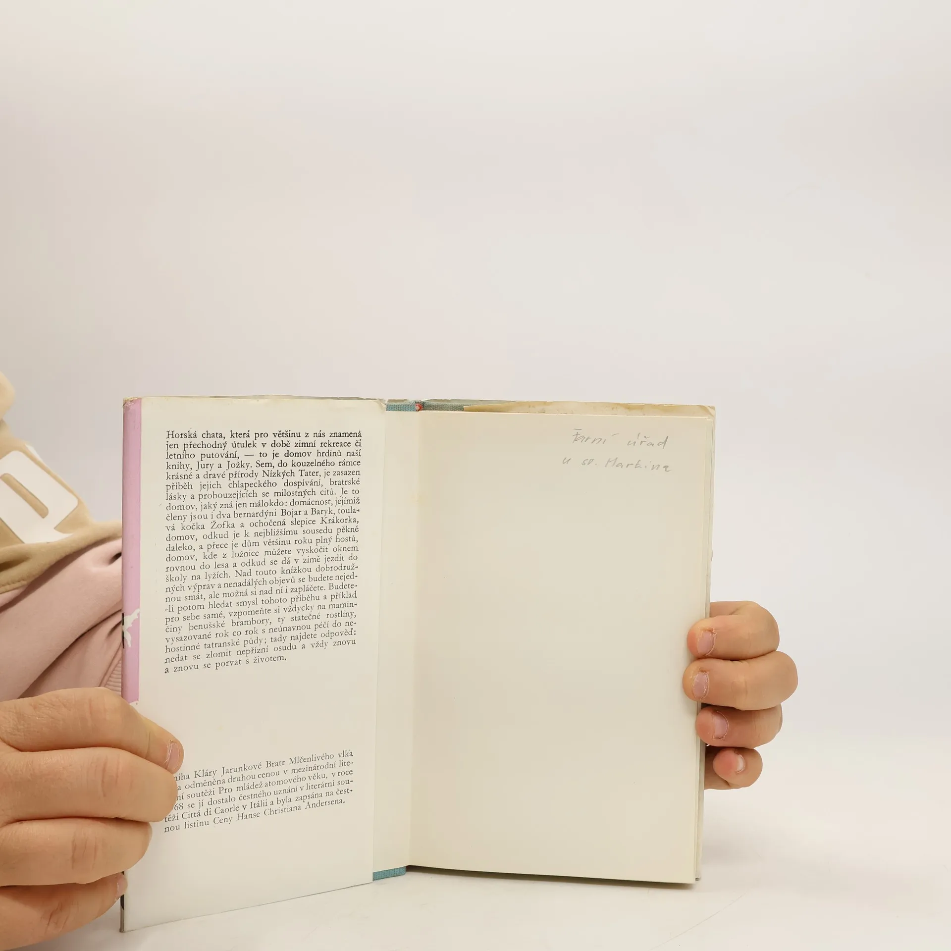Horská chata,která pro většinu z nás znamená jen přechodný útulek v době zimní rekreace či letního putování-to je domov hrdinů naší knihy,Jury a Jožky.Sem,do kouzelného rámce krásné a dravé přírody Nízkých Tater je zasazen příběh jejich chlapeckého dospívání,bratrské lásky a probouzejících se milostných citů. Je to domov,jaký zná jen málokdo:domácnost,jejímiž členy jsou i dva bernardýni Bojar a Baryk,toulavá kočka Žofka a ochočená slepice Krákorka, domov, odkud je i k nejbližšímu sousedu pěkně daleko,a přece je dům většinu roku plný hostů, domov,kde z ložnice můžete vyskočit oknem rovnou do lesa a odkud se dá v zimě jezdit do školy na lyžích. Nad touto knížkou dobrodružných výprav a nenadálých objevů budete se jistě často smát a možná si nad ní i zapláčete,a budete-li potom hledat smysl tohoto příběhu a příklad pro sebe samé,vzpomeňte si vždycky na maminčiny benušské brambory,ty statečné rostliny,vysazované rok co rok s neúnavnou péčí do nehostinné tatranské půdy,tady najdete odpověd´:nedat se zlomit nepřízní osudu a vždy znovu a znovu se porvat s životem. Třetí vydání. 13-720-87