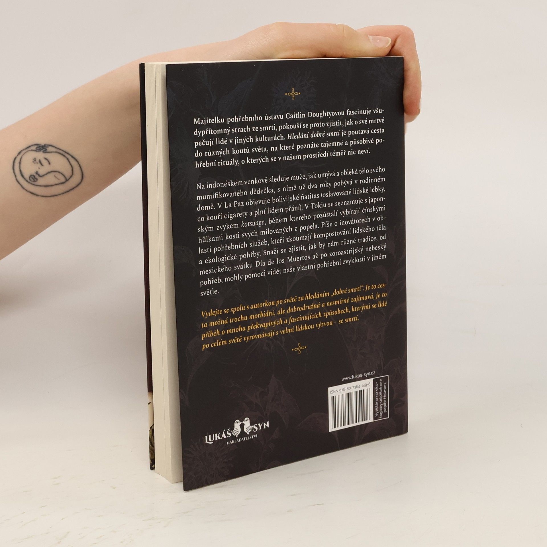 Majitelku pohřebního ústavu Caitlin Doughtyovou fascinuje všudypřítomný strach ze smrti, pokouší se proto zjistit, jak o své mrtvé pečují lidé v jiných kulturách. Hledání dobré smrti je poutavá cesta do různých koutů světa, na které poznáte tajemné a působivé pohřební rituály, o kterých se v našem prostředí téměř nic neví.Na indonéském venkově sleduje muže, jak umývá a obléká tělo svého mumifikovaného dědečka, s nímž už dva roky pobývá v rodinném domě. V La Paz objevuje bolivijské natitas (oslavované lidské lebky, co kouří cigarety a plní lidem přání). V Tokiu se seznamuje s japonským zvykem kotsuage, během kterého pozůstalí vybírají čínskými hůlkami kosti svých milovaných z popela. Píše o inovátorech v oblasti pohřebních služeb, kteří zkoumají kompostování lidského těla a ekologické pohřby. Snaží se zjistit, jak by nám různé tradice, od mexického svátku Día de los Muertos až po zoroastrijský nebeský pohřeb, mohly pomoci vidět naše vlastní pohřební zvyklosti v jiném světle.Vydejte se spolu s autorkou po světě za hledáním „dobré smrti“. Je to cesta možná trochu morbidní, ale dobrodružná a nesmírně zajímavá, je to příběh o mnoha překvapivých a fascinujících způsobech, kterými se lidé po celém světě vyrovnávají s velmi lidskou výzvou – se smrtí.