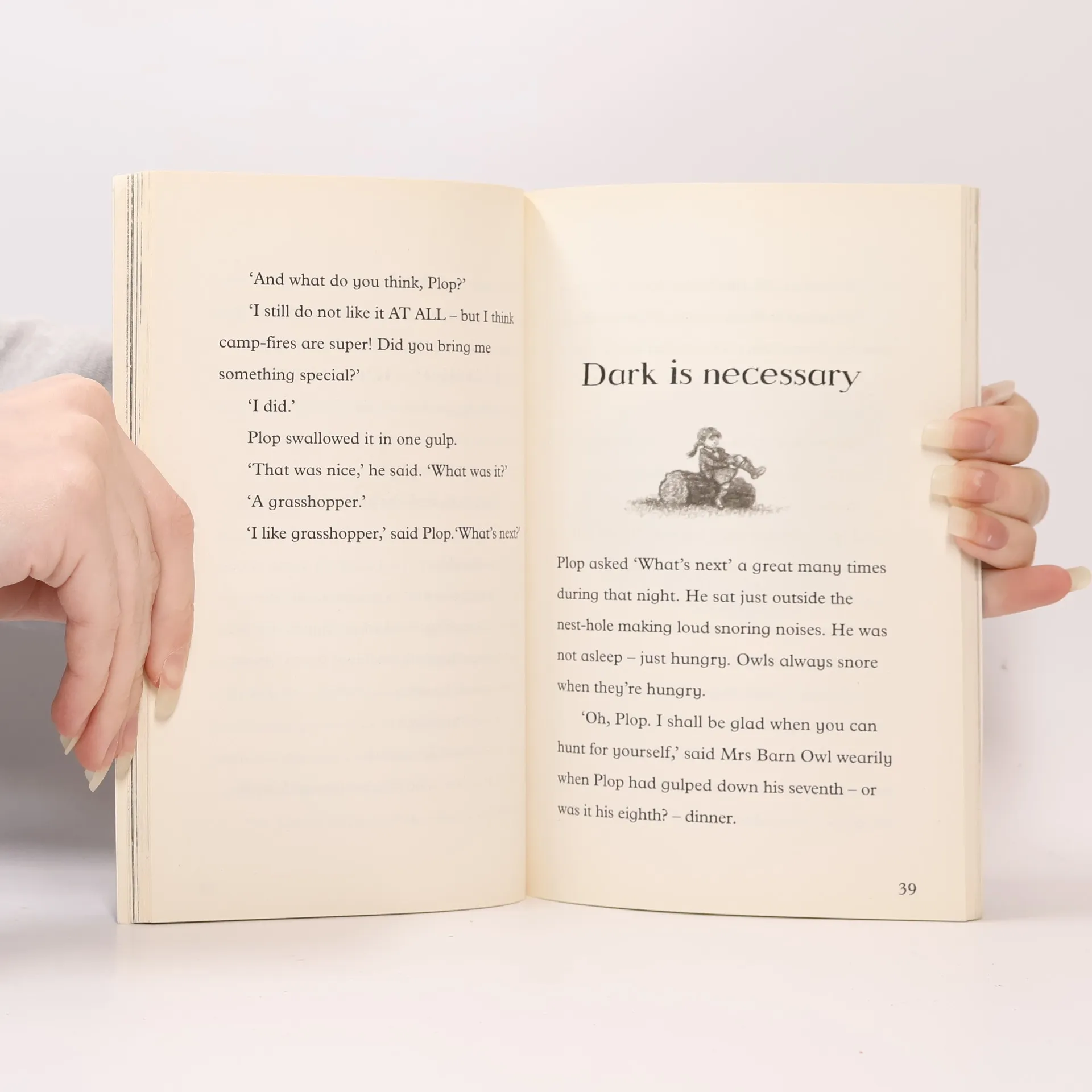 Plop, the Baby Barn Owl, is like every Barn Owl there ever was, except for one thing—he is afraid of the dark. "Dark is nasty" he says, and so he won't go hunting with his parents. Mrs. Barn Owl sends him down from his nest-hole to ask about the dark and he meets a little boy waiting for the fireworks to begin, an old lady, a scout out camping, a girl who tells him about Father Christmas, a man with a telescope, and a black cat who takes him exploring. He realizes through these encounters that dark is super after all.