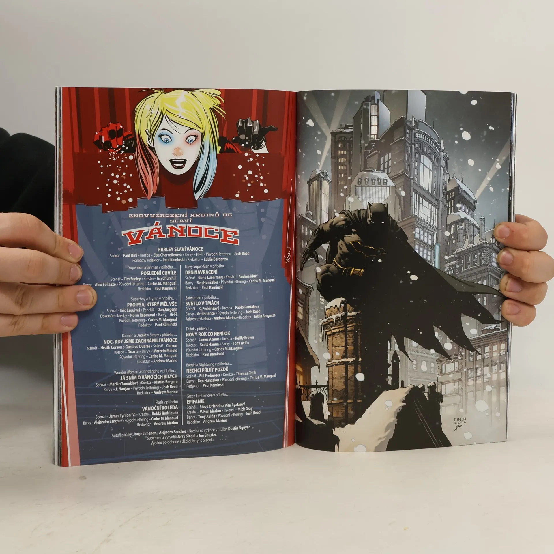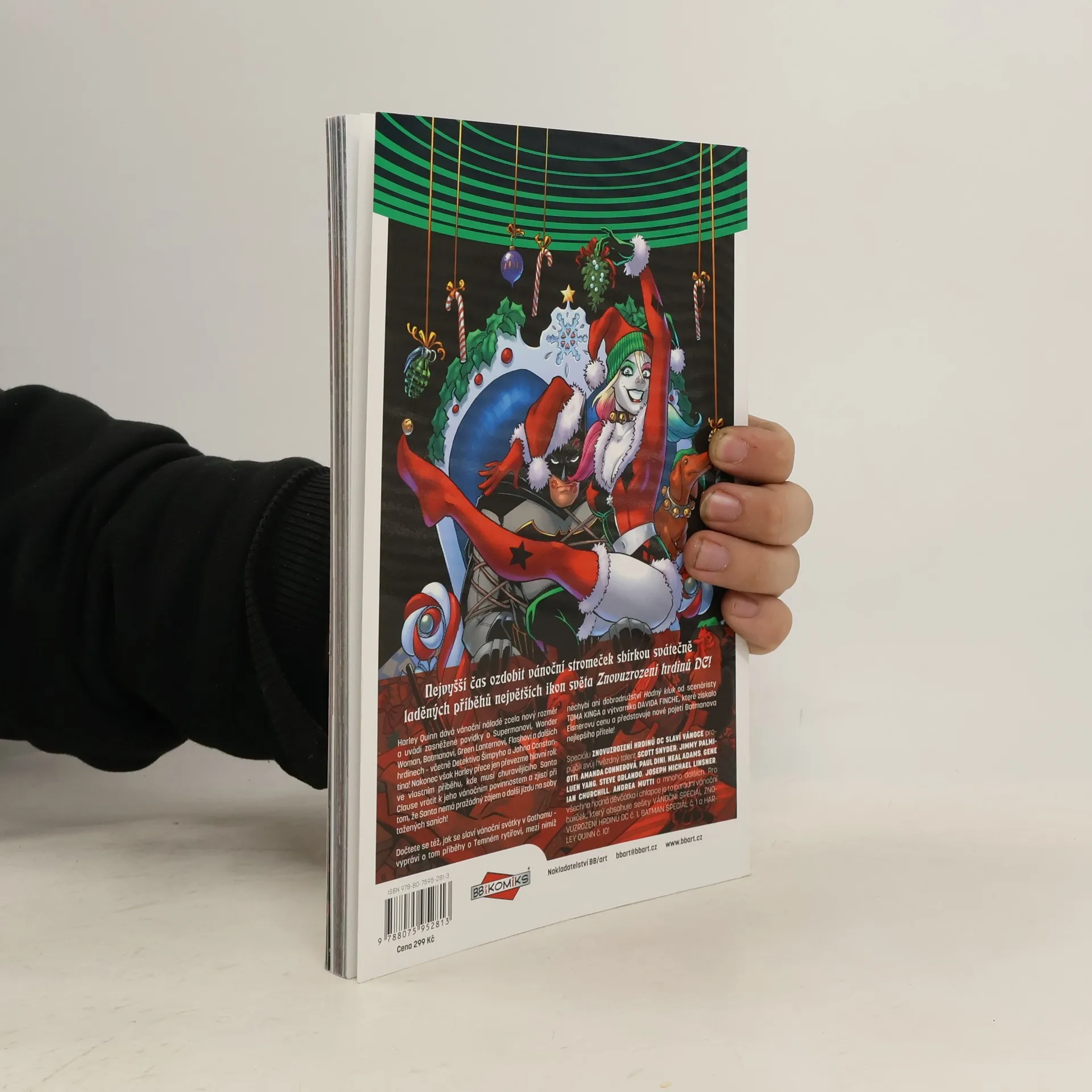 Harley Quinn dává vánoční náladě zcela nový rozměr a uvádí zasněžené povídky o Supermanovi, Wonder Woman, Batmanovi, Green Lanternovi, Flashovi a dalších hrdinech – včetně Detektiva Šimpyho a Johna Constantina! Nakonec však Harley přece jen převezme hlavní roli: ve vlastním příběhu, kde musí churavějícího Santa Clausovi vrátit k jeho vánočním povinnostem a zjistí přitom, že Santa nemá pražádný zájem o další jízdu na saních tažených soby! Dočtete se též, jak se slaví vánoční svátky v Gothamu – vypráví o tom příběhy o Temném rytířovi, mezi nimiž nechybí ani dobrodružství „Pašák“ („Good Boy“ od scenáristy TOMA KINGA a výtvarníka DAVIDA FINCHE), které získalo Eisnerovu cenu – a představuje nové pojetí Batmanova nejlepšího přítele! Speciálu ZNOVUZROZENÍ HRDINŮ DC SLAVÍ VÁNOCE propůjčili svůj hvězdný talent SCOTT SNYDER, JIMMY PALMIOTTI, AMANDA CONNEROVÁ, PAUL DINI, NEAL ADAMS, GENE LUEN YANG, STEVE ORLANDO, JOSEPH MICHAEL LINSNER, IAN CHURCHILL, ANDREA MUTTIOVÁ a mnoho dalších. Pro všechny hodná děvčátka i chlapce je to parádní vánoční balíček, který obsahuje sešity DC REBIRTH HOLIDAY SPECIAL č. 1, HARLEY QUINN č. 10 a BATMAN ANNUAL č. 1!