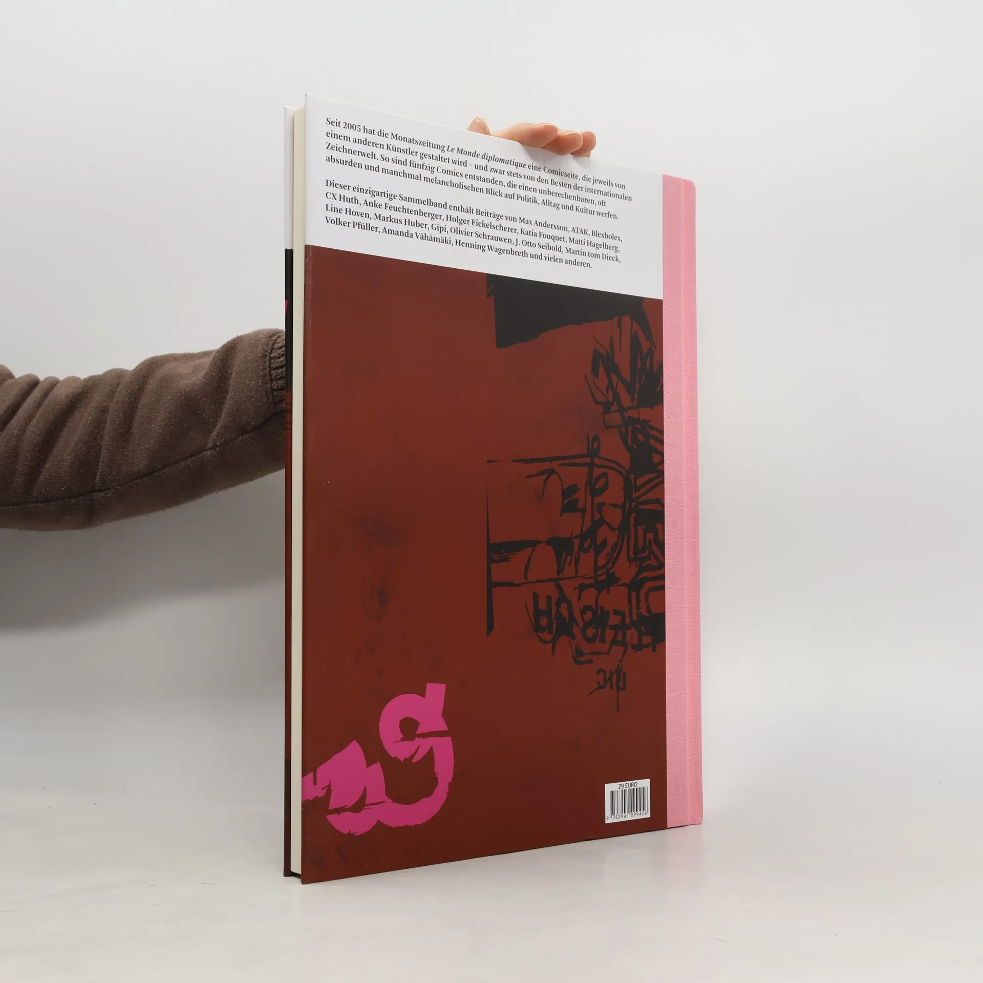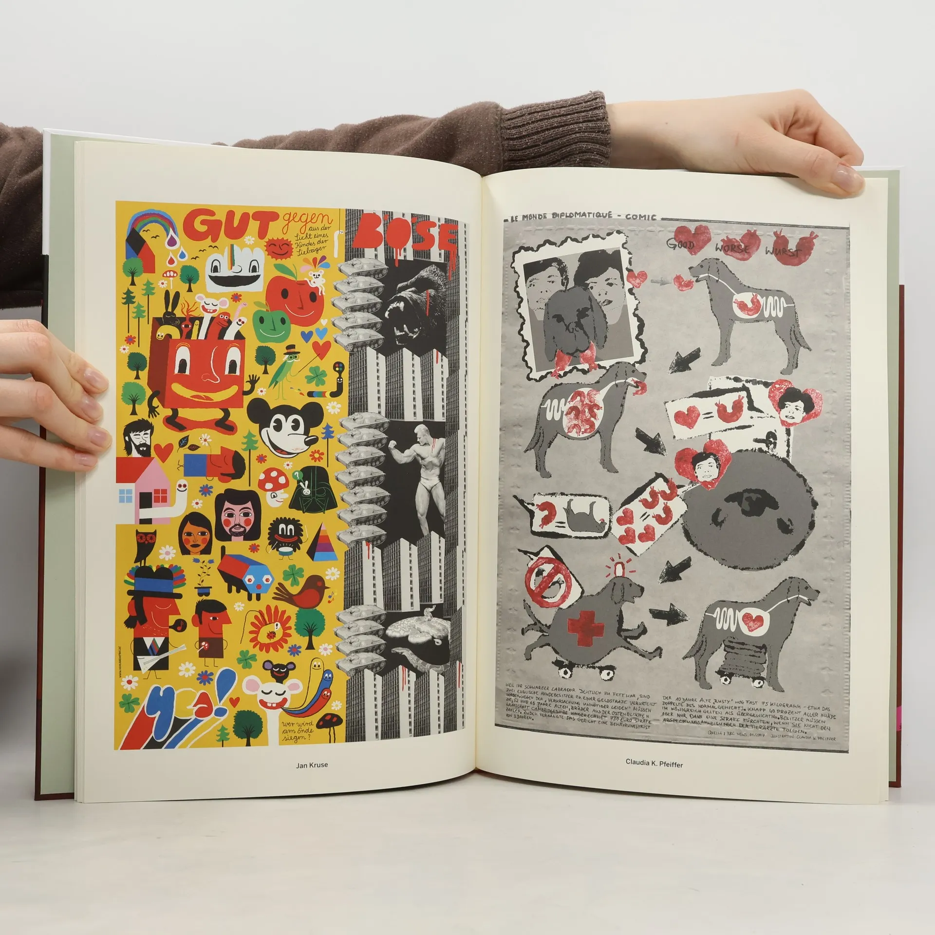 Karoline Bofinger, Herausgeberin des Bandes und verantwortlich für die Comicseite von „Le Monde diplomatique“, hat über die Jahre die Creme der internationalen Comicschaffenden gewinnen können, jeweils die letzte Seite von „Le Monde diplomatique“ zu gestalten. Entstanden sind so fünfzig Comics, die einen unberechenbar frechen, oft absurden und manchmal melancholischen Blick auf Politik, Alltag und Kultur werfen.