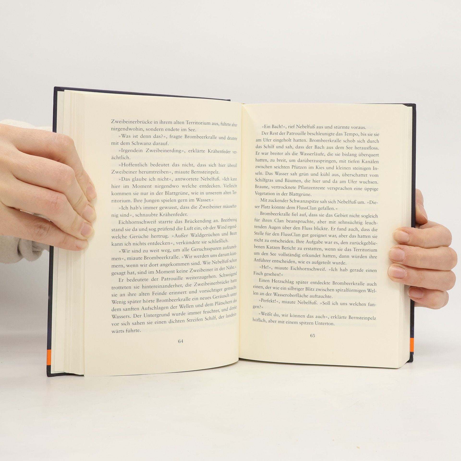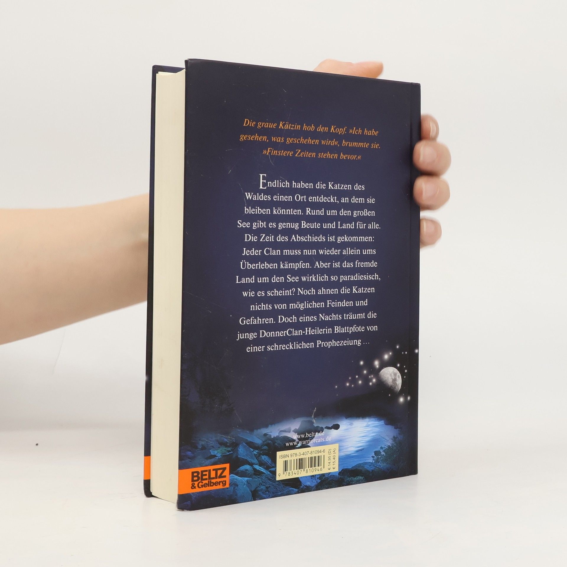 Die graue Kätzin hob den Kopf. 'Ich habe gesehen, was geschehen wird. Finstere Zeiten stehen bevor.' Endlich, nach langer Reise, haben die Katzen des Waldes einen Ort entdeckt, an dem sie bleiben könnten! Rund um den großen See gibt es genug Beute und Land für alle. Die Zeit des Abschieds für die große Reisegemeinschaft scheint gekommen. Jeder Clan muss nun wieder allein für sich selbst und das eigene Überleben kämpfen. Aber ist dies auch wirklich das Ziel ihrer Reise, die neue Heimat? Der SternenClan schweigt – ohne Zeichen der Kriegerahnen bleibt die Zukunft der Katzen ungewiss. Doch dann träumt die junge DonnerClan-Heilerin Blattpfote von einer schrecklichen Prophezeiung: 'Blut wird Blut vergießen und das Wasser des Sees rot färben, erst dann kehrt Frieden ein.'