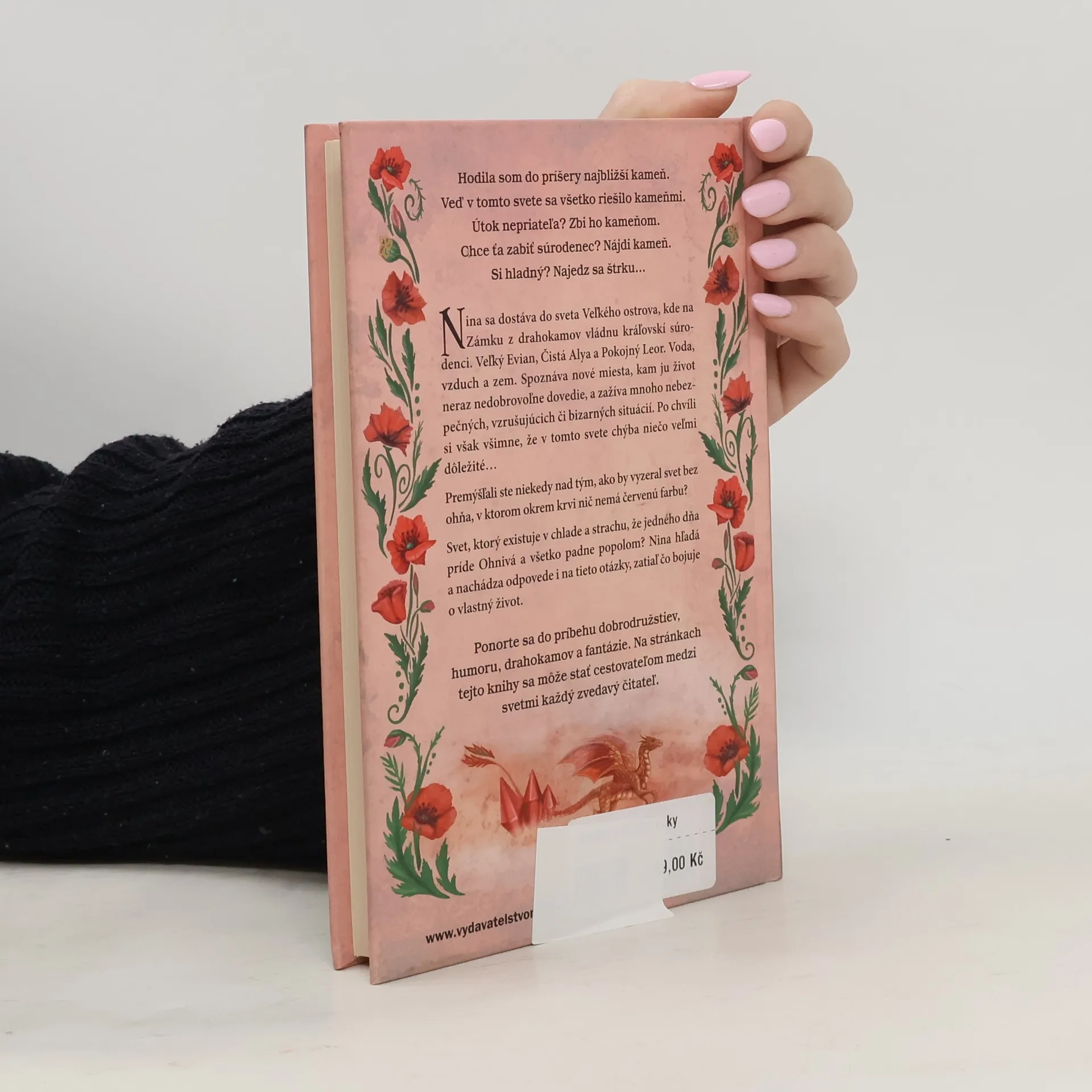 Hodila som do príšery najbližší kameň. Veď v tomto svete sa všetko riešilo kameňmi. Útok nepriateľa? Zbi ho kameňom. Chce ťa zabiť súrodenec? Nájdi kameň. Si hladný? Najedz sa štrku…Nina sa dostáva do sveta Veľkého ostrova, kde na Zámku z drahokamov vládnu kráľovskí súrodenci. Veľký Evian, Čistá Alya a Pokojný Leor. Voda, vzduch a zem. Spoznáva nové miesta, kam ju život (často nedobrovoľne) dovedie, a zažíva mnoho nebezpečných, vzrušujúcich či bizarných situácií. Po chvíli si však všimne, že v tomto svete chýba niečo veľmi dôležité…Premýšľali ste niekedy nad tým, ako by vyzeral svet bez ohňa, v ktorom okrem krvi nič nemá červenú farbu? Svet, ktorý existuje v chlade a strachu, že jedného dňa príde Ohnivá a všetko padne popolom? Nina hľadá a nachádza odpovede i na tieto otázky, zatiaľ čo bojuje o vlastný život.Ponorte sa do príbehu dobrodružstiev, humoru, drahokamov a fantázie. Na stránkach tejto knihy sa môže stať cestovateľom medzi svetmi každý zvedavý čitateľ.