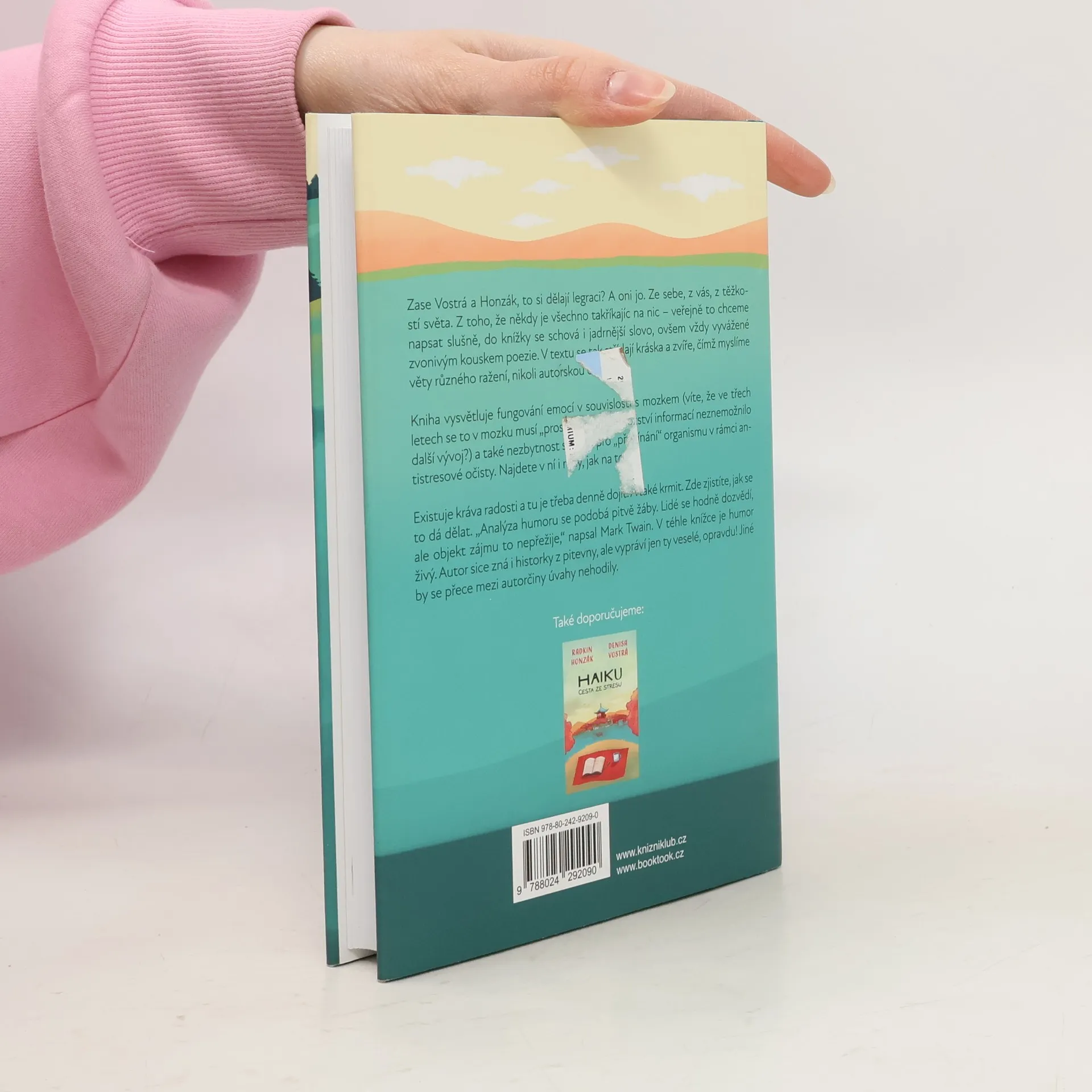 Zase Vostrá a Honzák, to si dělají legraci? A oni jo. Ze sebe, z vás, z těžkostí světa. Z toho, že někdy je všechno takříkajíc na nic – veřejně to chceme napsat slušně. Do knížky se schová i jadrnější slovo, ovšem vždy vyvážené zvonivým kouskem poezie. V textu se tak střídají kráska a zvíře, čímž myslíme věty různého ražení, nikoli autorskou dvojici.Kniha vysvětluje fungování emocí v souvislosti s mozkem (víte, že ve třech letech se to v mozku musí „prostříhat“, aby množství informací neznemožnilo další vývoj?) a také nezbytnost smíchu pro „přepínání“ organismu v rámci antistresové očisty. Najdete v ní i rady, jak na to. Existuje kráva radosti a tu je třeba denně dojit. A také krmit. V knížce zjistíte, jak se to dá dělat. „Analýza humoru se podobá pitvě žáby. Lidé se hodně dozvědí, ale objekt zájmu to nepřežije,“ napsal Mark Twain. V téhle knížce je humor živý. Autor sice zná i historky z pitevny, ale vypráví jen ty veselé, opravdu! Jiné by se přece mezi autorčiny úvahy nehodily.