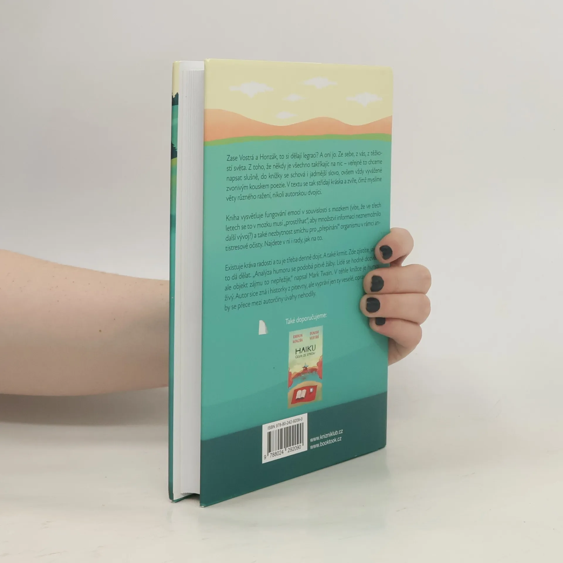Zase Vostrá a Honzák, to si dělají legraci? A oni jo. Ze sebe, z vás, z těžkostí světa. Z toho, že někdy je všechno takříkajíc na nic – veřejně to chceme napsat slušně. Do knížky se schová i jadrnější slovo, ovšem vždy vyvážené zvonivým kouskem poezie. V textu se tak střídají kráska a zvíře, čímž myslíme věty různého ražení, nikoli autorskou dvojici.Kniha vysvětluje fungování emocí v souvislosti s mozkem (víte, že ve třech letech se to v mozku musí „prostříhat“, aby množství informací neznemožnilo další vývoj?) a také nezbytnost smíchu pro „přepínání“ organismu v rámci antistresové očisty. Najdete v ní i rady, jak na to. Existuje kráva radosti a tu je třeba denně dojit. A také krmit. V knížce zjistíte, jak se to dá dělat. „Analýza humoru se podobá pitvě žáby. Lidé se hodně dozvědí, ale objekt zájmu to nepřežije,“ napsal Mark Twain. V téhle knížce je humor živý. Autor sice zná i historky z pitevny, ale vypráví jen ty veselé, opravdu! Jiné by se přece mezi autorčiny úvahy nehodily.