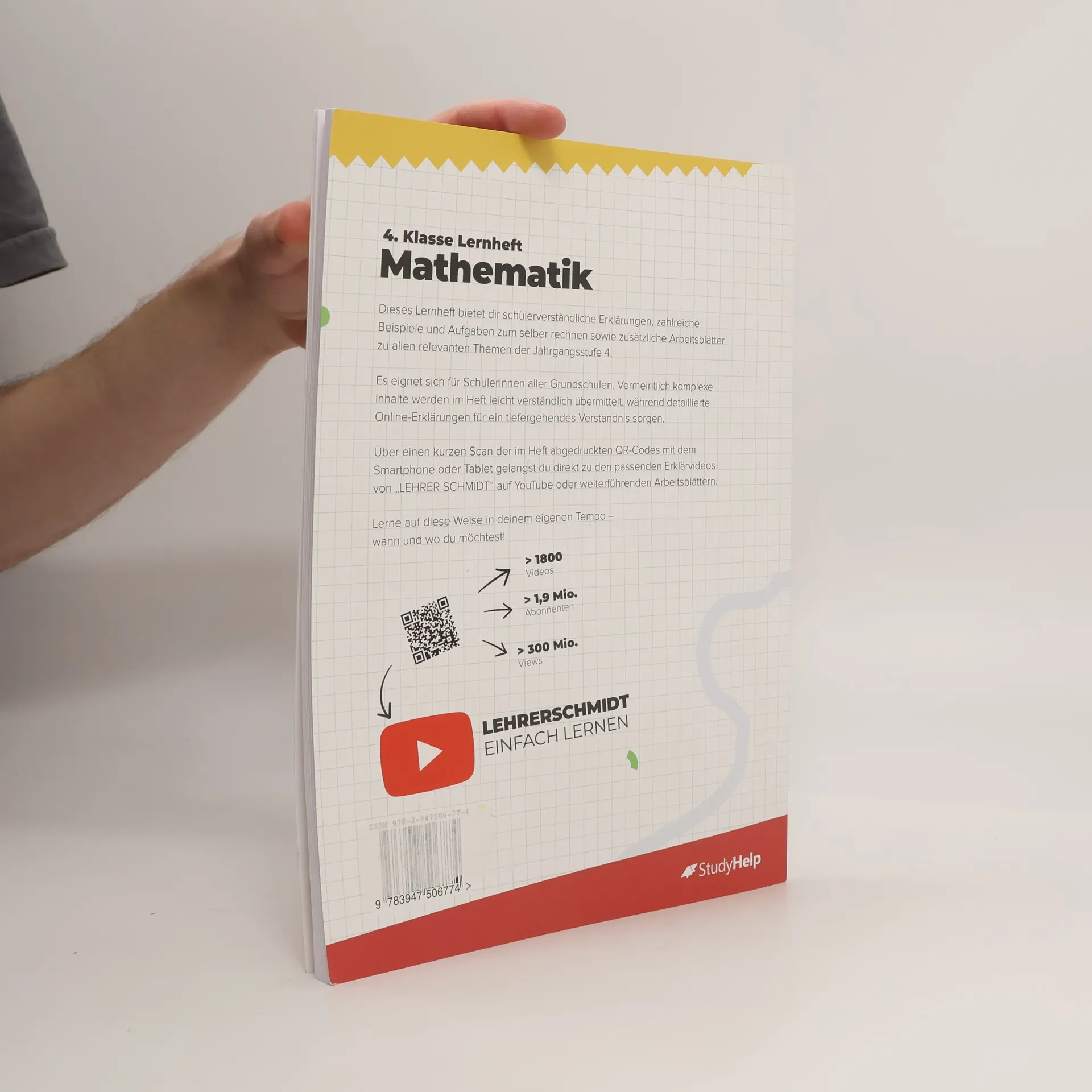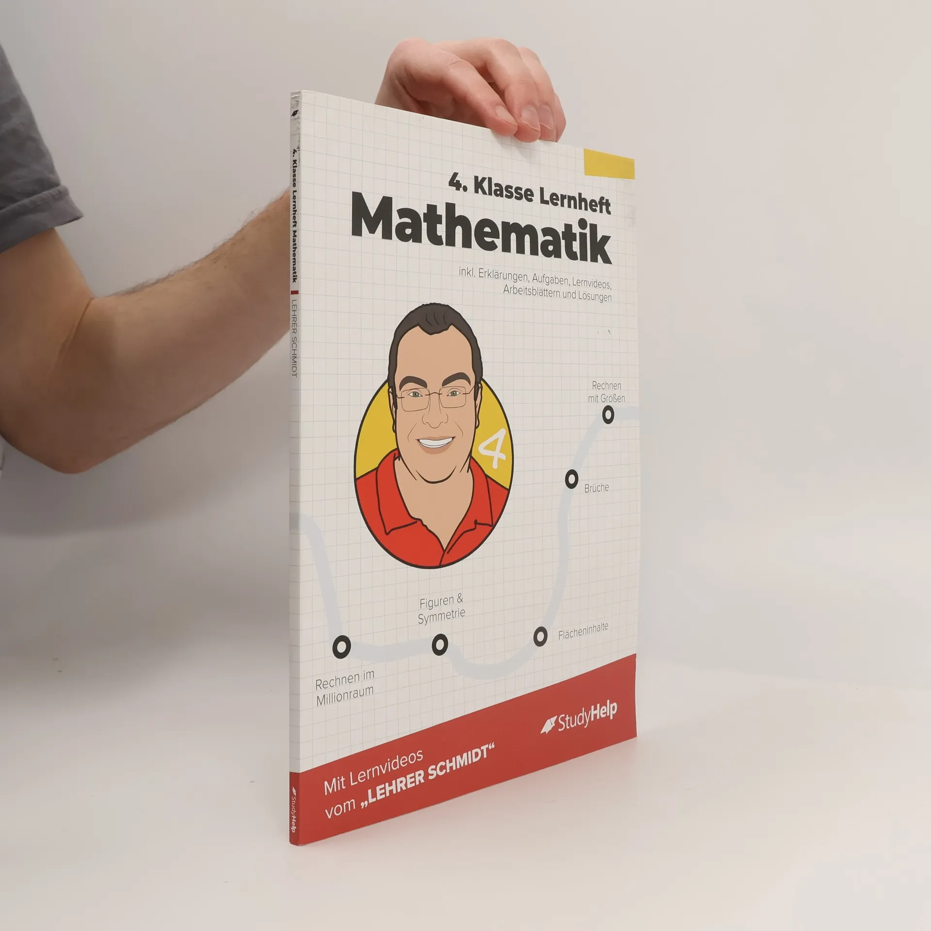 Unser Lernheft ist die ideale Ergänzung zu deinem Schulbuch und unterstützt dich mit Lernvideos von „Lehrer Schmidt“, damit du den Überblick behältst! Es umfasst 100 Seiten und bietet anschauliche Erklärungen zu Mathe für die 4. Klasse (Grundschule). Mit 49 Lernvideos (werbefrei) und über 30 Arbeitsblättern zum Download sowie 6 interaktiven Übungsaufgaben wird das Lernen abwechslungsreich gestaltet. Insgesamt findest du 58 Aufgaben mit Lösungen. Die Inhalte decken alle relevanten Themen der 4. Klasse ab, egal ob du den aktuellen Stoff vertiefen oder bereits Gelerntes wiederholen möchtest. Komplexe Zusammenhänge werden verständlich erklärt, ergänzt durch Merksätze, Skizzen und alles, was du zum Verstehen benötigst. Die Lernvideos und die didaktisch aufbereiteten Arbeitsblätter unterstützen dich zusätzlich. Die Themen sind in übersichtliche Kapitel gegliedert, die dich durch die 4. Klasse leiten. Für Eltern: Im 4. Schuljahr wird im Millionraum gerechnet, was eine Herausforderung darstellt. Das Millionbuch und die Stellentafel helfen, Struktur und Übersichtlichkeit in den großen Zahlenraum zu bringen. Schriftliche Multiplikation und Division werden im 2. Halbjahr eingeführt. Geometrische Körper werden analysiert, und der Umgang mit Zirkel und Geodreieck wird geübt. Themen im Überblick: Festigen des Rechnens im Tausenderraum, Orientierung im Millionraum, Zeichnen geometrischer Formen, Symmetrie, Brüche, Flächeninhalte, Rechne