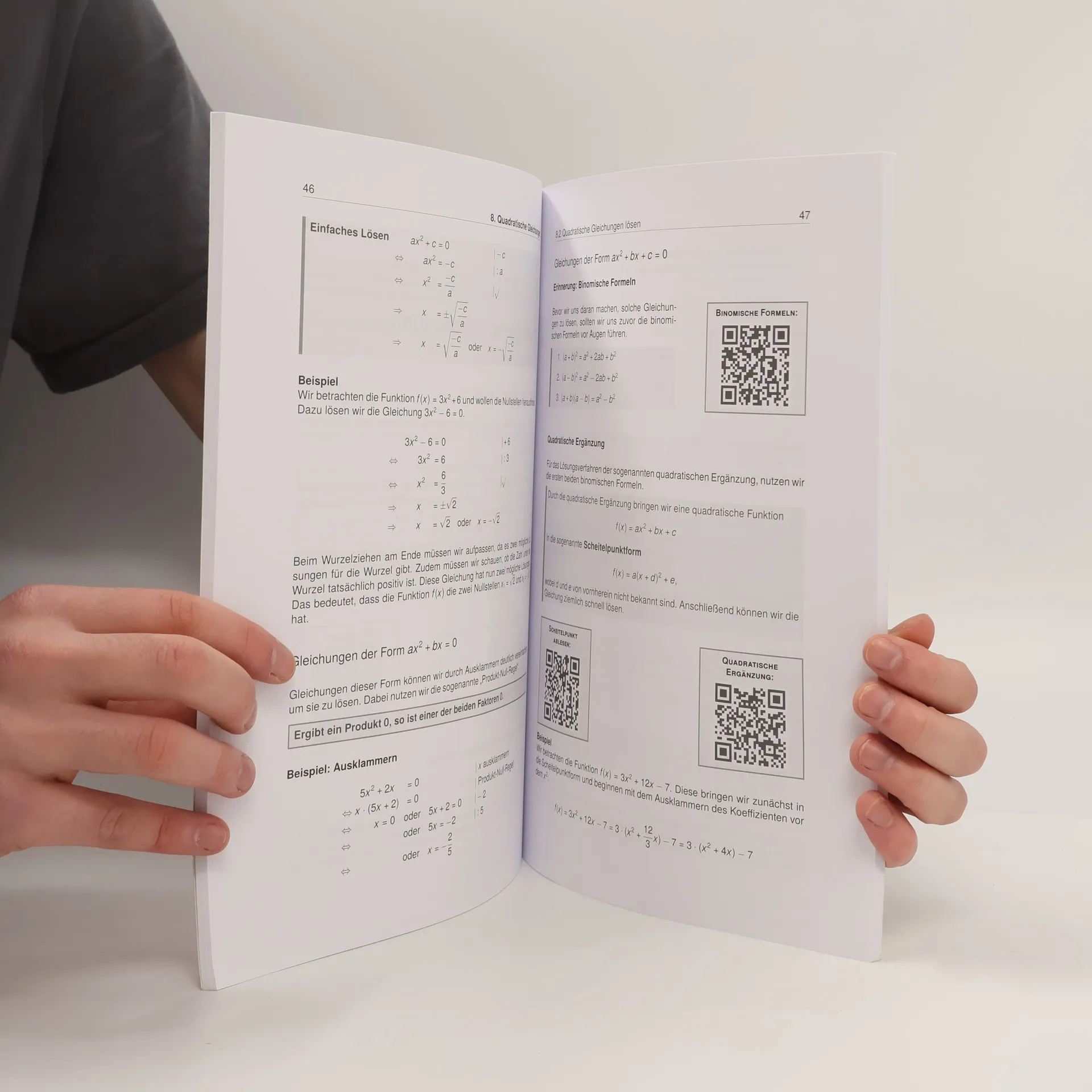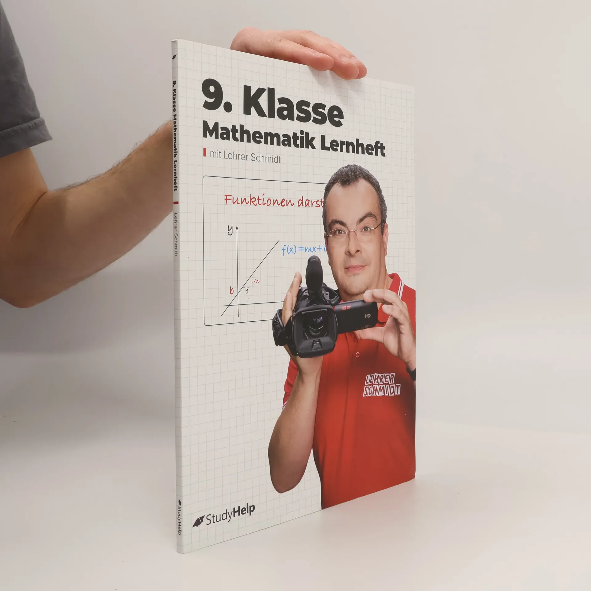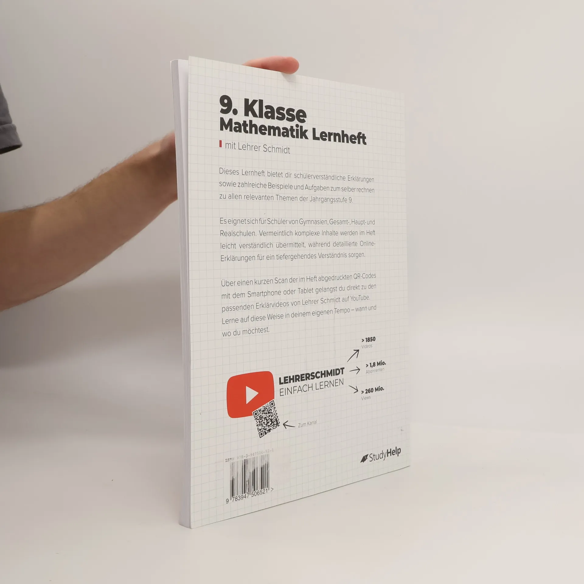 Unser Lernheft hilft dir mit Lernvideos von Lehrer Schmidt, auch in Zeiten von Home-Schooling, nicht den Überblick zu verlieren! 100 Seiten anschauliche Erklärungen 87 Lernvideos von Lehrer Schmidt 48 Aufgaben inkl. Lösungen Dieses Lernheft steckt voller Erklärungen, Beispielaufgaben, Aufgaben und Lösungen zu allen relevanten Themen der 9. Klasse für Gymnasien, Gesamt-, Haupt- und Realschulen. Ganz egal, ob du einfach nur den aktuellen Stoff vertiefen oder bereits in der Schule gelerntes wiederholen willst, hier wirst du fündig. Vermeintlich komplizierte Zusammenhänge sind in einer für Schüler vollkommen verständlichen Sprache dargestellt. Außerdem findest du zu den Themen alle Formeln, Skizzen und was sonst noch notwendig ist, um den Sachverhalt zu verstehen. Als ergänzendes Lernmaterial stehen dir dank der QR-Codes im Heft themenbasierte Erklärvideos von Lehrer Schmidt sofort zur Verfügung. Scanne hierzu mit deinem Smartphone oder Tablet den QR-Code ab und sieh dir ein auf dein Kapitel zugeschnittenes Video an. Auf diese Weise kannst du dich optimal auf mathematische Inhalte vorbereiten und wichtige Themen wiederholen Inhaltsverzeichnis Rationale Zahlen und Proportionalität Prozent- und Zinsrechnung Reelle Zahlen Potenzen Funktionen Flächensätze Geometrische Abbildungen Quadratische Gleichungen Lineare Gleichungssysteme Flächenberechnungen Körperberechnungen Daten und Zufall Lösungen