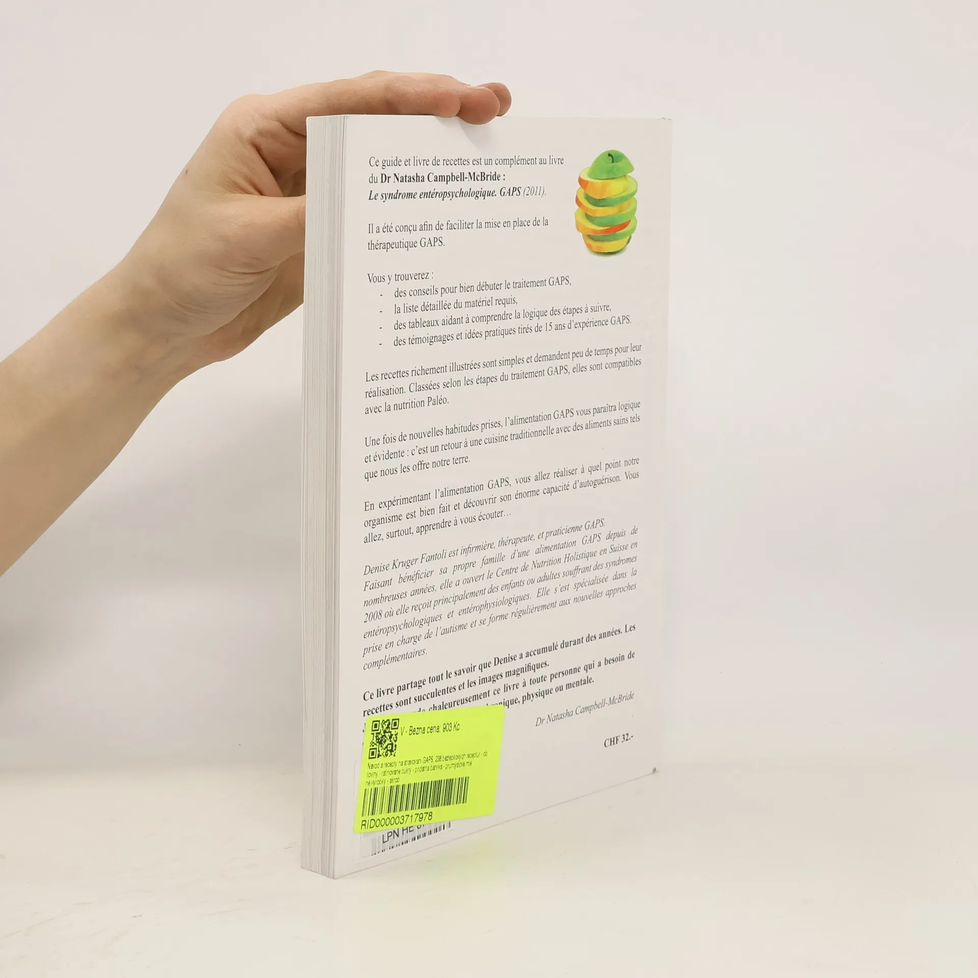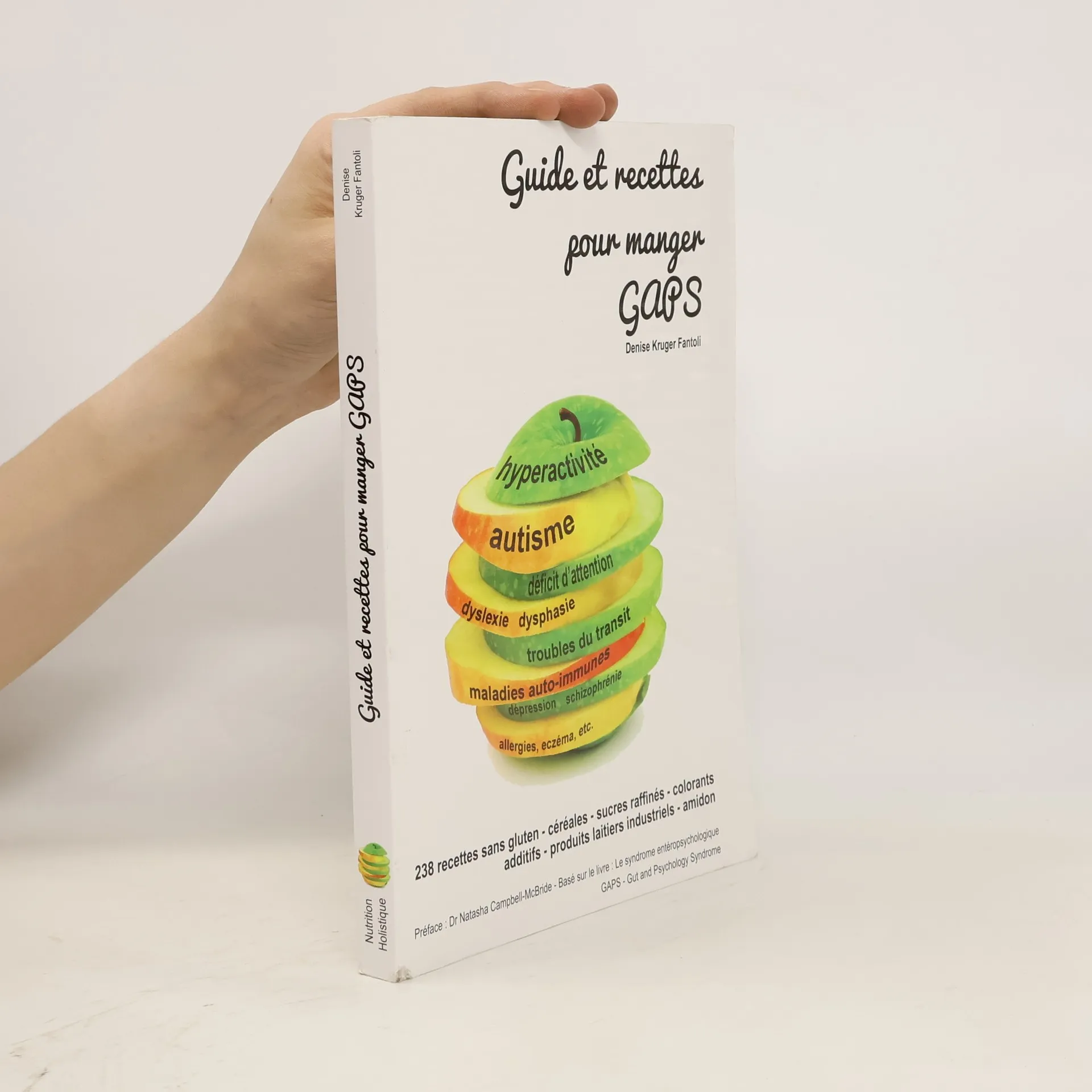 Ce guide et livre de recettes est un complément au livre du Dr Natasha Campbell-McBride: Le syndrome entéropsychologique. GAPS (2011). Il a été conçu afin de faciliter la mise en place de la thérapeutique GAPS. Vous y trouverez : - un résumé de la méthode et des conseils pour bien débuter le traitement, - 238 recettes richement illustrées et classées selon l'ordre de progression du traitement GAPS - la liste détaillée du matériel requis, - des tableaux aidant à comprendre la logique des étapes à suivre, - des témoignages et idées pratiques tirés de 15 ans d’expérience GAPS. Les recettes sont simples et demandent peu de temps pour leur réalisation, elles sont compatibles avec la nutrition Paléo. Une fois de nouvelles habitudes prises, l’alimentation GAPS vous paraîtra logique et évidente : c’est un retour à une cuisine traditionnelle avec des aliments sains tels que nous les offre notre terre. En expérimentant l’alimentation GAPS, vous allez réaliser à quel point notre organisme est bien fait et découvrir son énorme capacité d’autoguérison. Vous allez, surtout, apprendre à vous écouter… Ce livre partage tout le savoir que Denise Kruger Fantoli a accumulé durant des années. Les recettes sont succulentes et les images magnifiques. Je recommande chaleureusement ce livre à toute personne qui a besoin de guérir son corps d’une maladie chronique, physique ou mentale. Dr Natasha Campbell-McBride