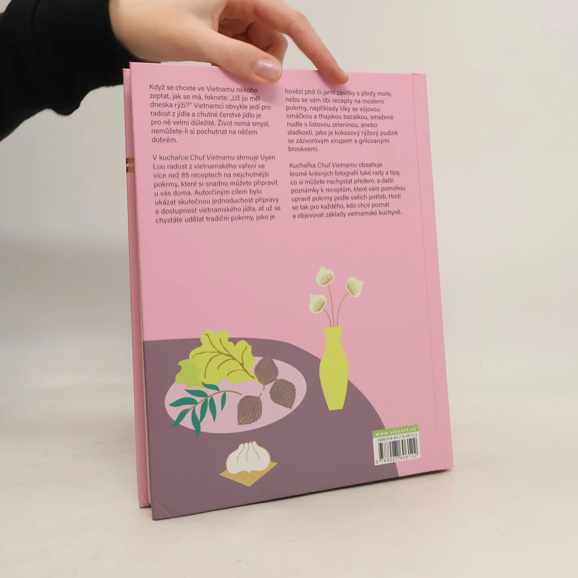 Udělejte si doma jednoduché vietnamské jídlo.Když začnete vařit podle této vietnamské kuchařky, zjistíte, že potřebujete jen hrstku surovin a pak se budete snažit vyvážit sladkou, kyselou, slanou, hořkou, ostrou a umami chuť. Mnoho receptů je pro každodenní vaření - od rychlých polévek po pokrmy sdílené členy rodiny z jedné mísy a zázraky z jednoho hrnce. V knize jsou jídla i na víkendy a svátky, kdy máte o něco více času na vaření. Říká se tomu jídlo pro zábavu. Pokrmy můžete upravovat podle toho, jaké suroviny máte po ruce, a pokud něco neseženete, nahradíte to, recepty slouží jako kostra z přísad a postupů. Přizpůsobujte recepty, spotřebovávejte všechno beze zbytků a vystačte si s tím, co máte. Snadno poznáte, jak lze dát jídlu pravou vietnamskou chuť. Čeká vás třeba tofu s rajčaty a výhonkovou brokolicí v rybí omáčce, houby a topinambury prudce opékané v pánvi, horká a ohnivá zelenina s ančovičkami, kuřecí salát s cukrovým hráškem, vietnamským koriandrem a šalotkami nebo čerstvé závitky se salátem.