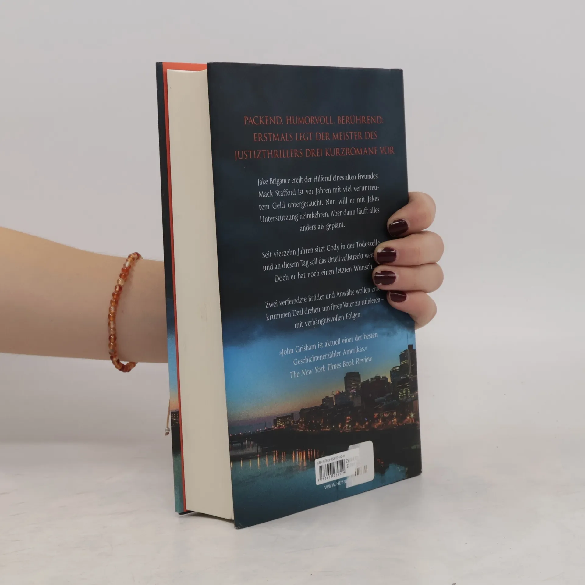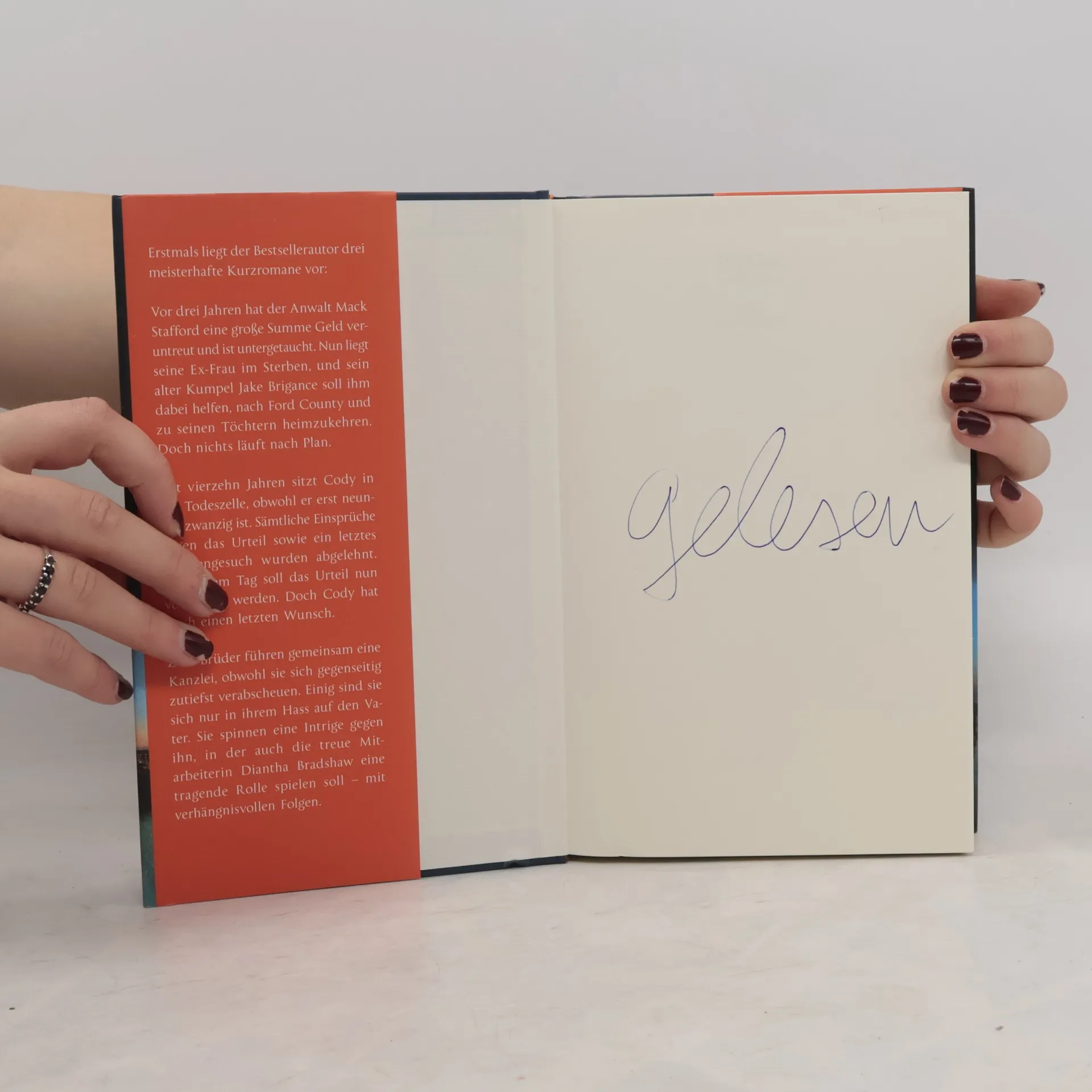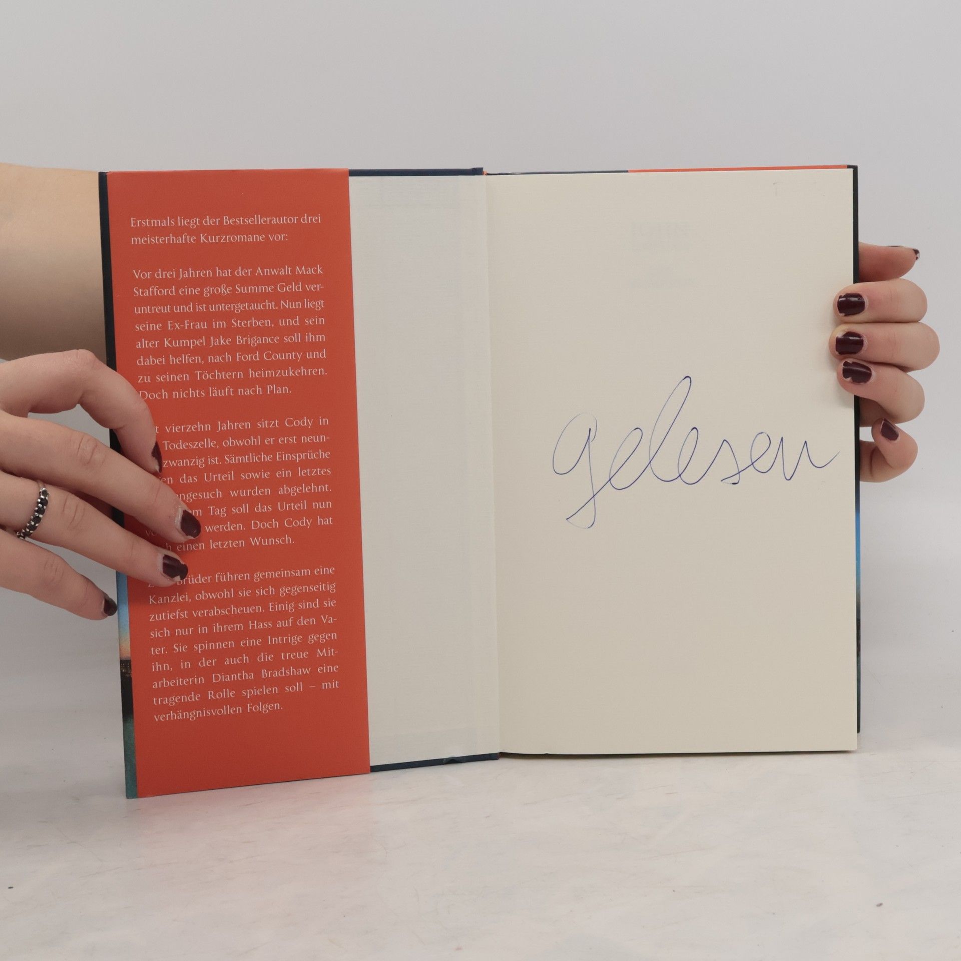 Erstmals legt der Meister des Justizthrillers drei Kurzromane vor: packend, humorvoll, berührend. Jake Brigance erreicht der Hilferuf eines alten Freundes: Mack Stafford ist vor Jahren mit viel veruntreutem Geld untergetaucht. Nun will er mit Jakes Unterstützung heimkehren. Aber dann läuft alles anders als geplant.Seit vierzehn Jahren sitzt Cody in der Todeszelle, und an diesem Tag soll das Urteil vollstreckt werden. Doch er hat noch einen letzten Wunsch. Zwei verfeindete Brüder und Anwälte wollen einen krummen Deal drehen, um ihren Vater zu ruinieren – mit verhängnisvollen Folgen.