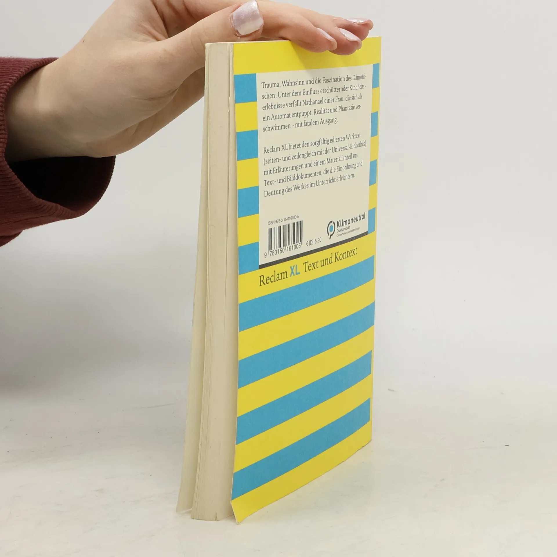 Trauma, Wahnsinn und die Faszination des Dämonischen: Unter dem Einfluss erschütternder Kindheitserlebnisse verfällt Nathanael einer Frau, die sich als ein Automat entpuppt. Realität und Phantasie verschwimmen – mit fatalem Ausgang. Klassenlektüre und Textarbeit einfach gemacht: Die Reihe »Reclam XL – Text und Kontext« erfüllt alle Anforderungen an Schullektüre und Bedürfnisse des Deutschunterrichts: * Reclam XL bietet den sorgfältig edierten Werktext – seiten- und zeilengleich mit der entsprechenden Ausgabe aus Reclams Universal-Bibliothek. * Das Format ist größer (12,2 x 20 cm) als die gelben Klassiker der Universal-Bibliothek, mit ausreichend Platz für Notizen am Seitenrand. * Schwierige Wörter werden am Fuß jeder Seite erklärt, ausführlichere Wort- und Sacherläuterungen stehen im Anhang. * Ein Materialienteil mit Text- und Bilddokumenten erleichtert die Einordnung und Deutung des Werkes im Unterricht. * Natürlich passen auch weiterhin alle Lektüreschlüssel, Erläuterungsbände und Interpretationen dazu!