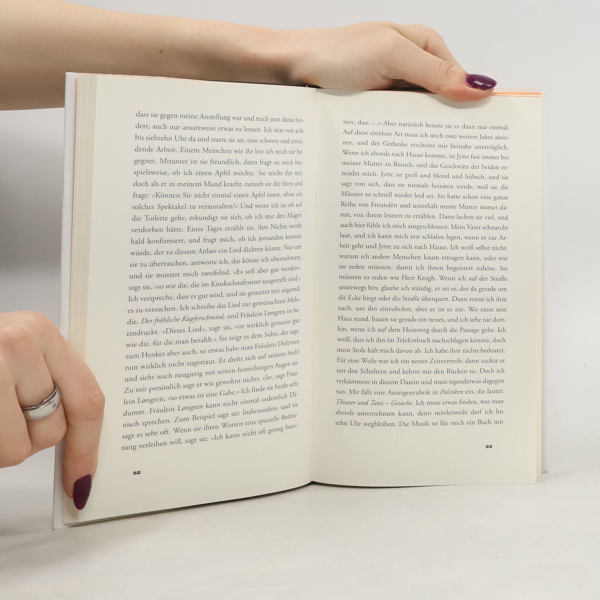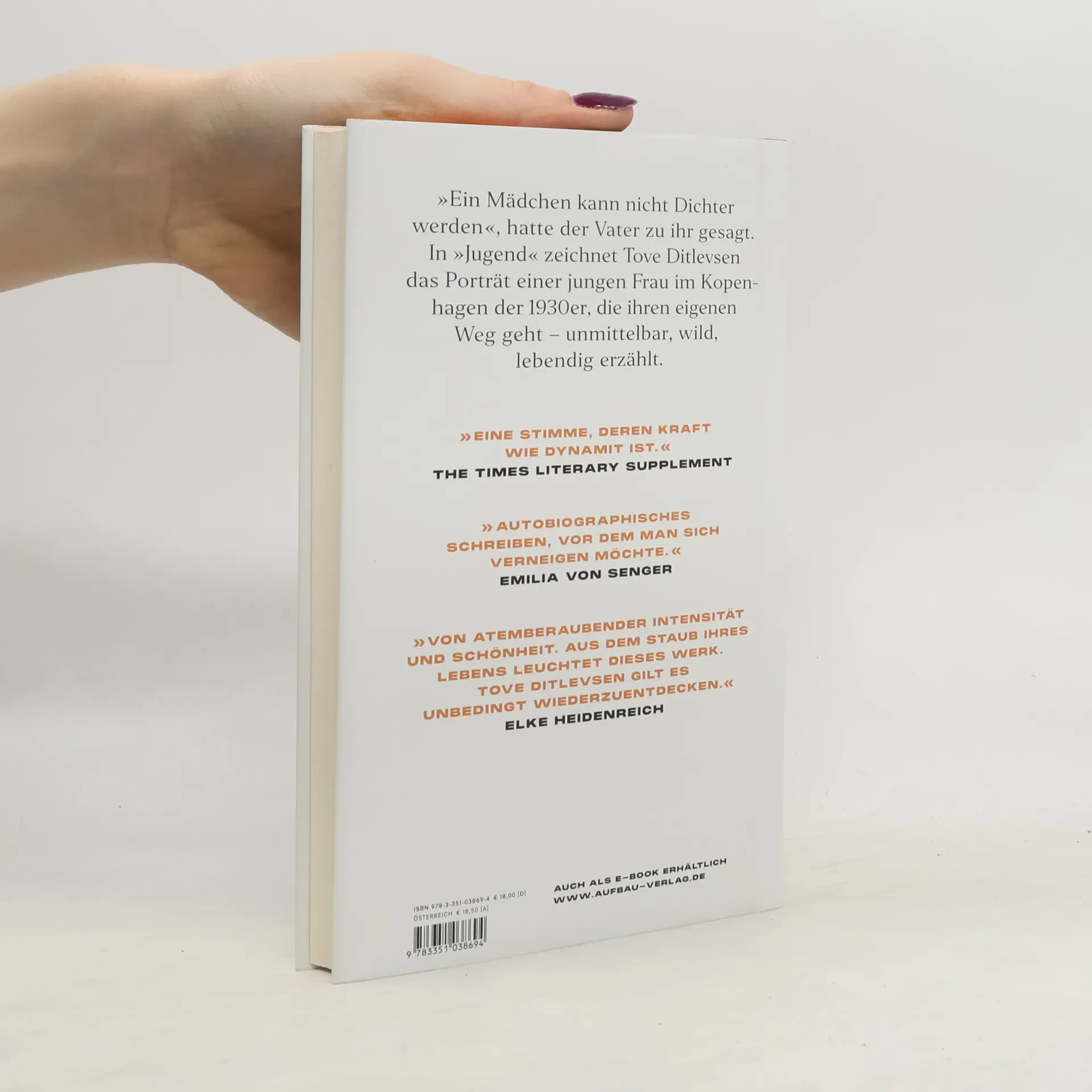 „Von atemberaubender Intensität und Schönheit. Aus dem Staub ihres Lebens leuchtet dieses Werk.“ Elke Heidenreich, Spiegel Online. Tove Ditlevsen erzählt in „Jugend“ von einer jungen Frau, die ihren eigenen Weg geht. Im Kopenhagen der 1930er Jahre stürzt sich Tove voller Energie ins Leben. Mit 14 Jahren verlässt sie die Schule und nimmt ohne Ausbildung verschiedene kleine Jobs an, arbeitet als Dienstmädchen und Bürogehilfin. Sie lernt den älteren Antiquar Herrn Krogh kennen, der ihr Bücher leiht. Mit 17 zieht sie von zu Hause aus, geht tanzen und die Möglichkeit, ein eigenes Buch zu veröffentlichen, rückt näher. Es ist das Porträt einer furchtlosen Frau, die entschlossen ins Leben zieht. „Eine Stimme, deren Kraft wie Dynamit ist.” The Times Literary Supplement. „Das Porträt einer Frau, die ihr Leben entschieden zu ihrem eigenen macht. Ein Leben, so frei und ungestüm, ich bin versunken in Tove Ditlevsens Büchern.“ Nina Hoss. „Eine monumentale Autorin.“ Patti Smith. „Großartig, von hypnotischer Qualität.“ The New York Times. „Tove Ditlevsens Kopenhagen-Trilogie ist eines der großen literarischen Ereignisse des Jahres." Süddeutsche Zeitung. „Was Autorinnen wie Annie Ernaux und Rachel Cusk heute tun, hat Tove Ditlevsen schon vor über 50 Jahren getan. Endlich ist Ditlevsens Trilogie auf Deutsch zu lesen!” Emilia von Senger, She said.