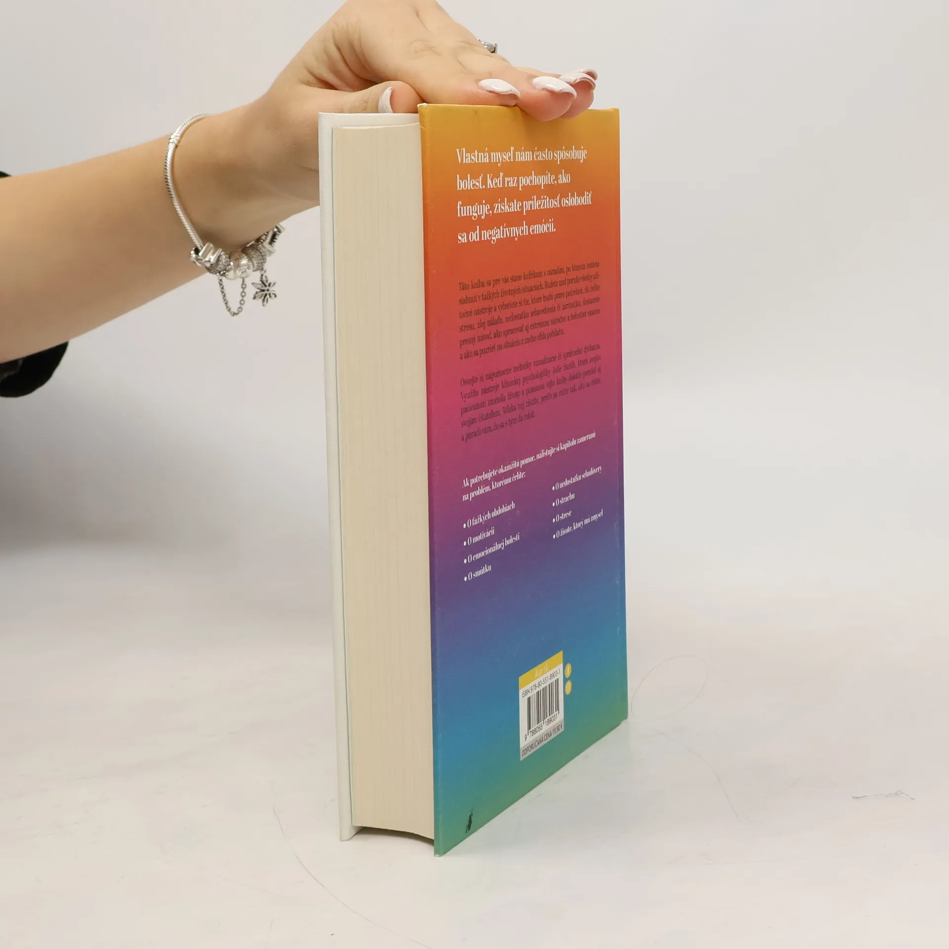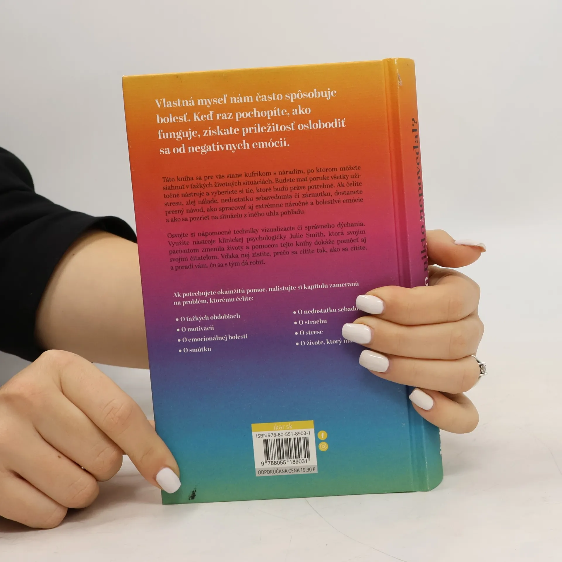 Ak zažívate ťažké obdobie, alebo si neviete dať rady so spracovaním niektorých emócií, klinická psychologička Julie Smith vám touto knihou môže zmeniť život. Vďaka nej zistíte, prečo sa cítite tak, ako sa cítite, a poradí vám, čo sa s tým dá robiť.Vlastná myseľ nám často spôsobuje bolesť. Prehľadné diagramy v knihe vysvetľujú, prečo je to tak a čo s tým môžete urobiť. Keď raz pochopíte, ako myseľ funguje, získate príležitosť oslobodiť sa od negatívnych emócií. Osvojte si nápomocné techniky vizualizácie či správneho dýchania. Táto kniha sa pre vás stane kufríkom s náradím, po ktorom môžete siahnuť v náročných životných situáciách. Budete mať poruke všetky užitočné nástroje a vyberiete si tie, ktoré budú práve potrebné. Ak hľadáte okamžitú pomoc, nalistujte si kapitolu zameranú na problém, ktorému čelíte. Či už je to stres, zlá nálada, nedostatok sebavedomia či zármutok, dostanete presný návod, ako si v danej situácii poradiť a ako sa na všetko pozrieť z iného uhla pohľadu.Máte právo cítiť sa dobre a byť so svojím životom spokojní. Autorka s množstvom skúseností z oblasti psychológie sa preslávila na sociálnych sieťach, na ktorých stúpol počet jej sledovateľov až na milióny. Výstižnými krátkymi videami o duševnom zdraví pomáha aj naďalej tým, ktorí to potrebujú. Je totiž presvedčená, že psychologické rady by nemali byť dostupné iba v odborných ambulanciách a na terapiách. Prístupné musia byť pre všetkých.