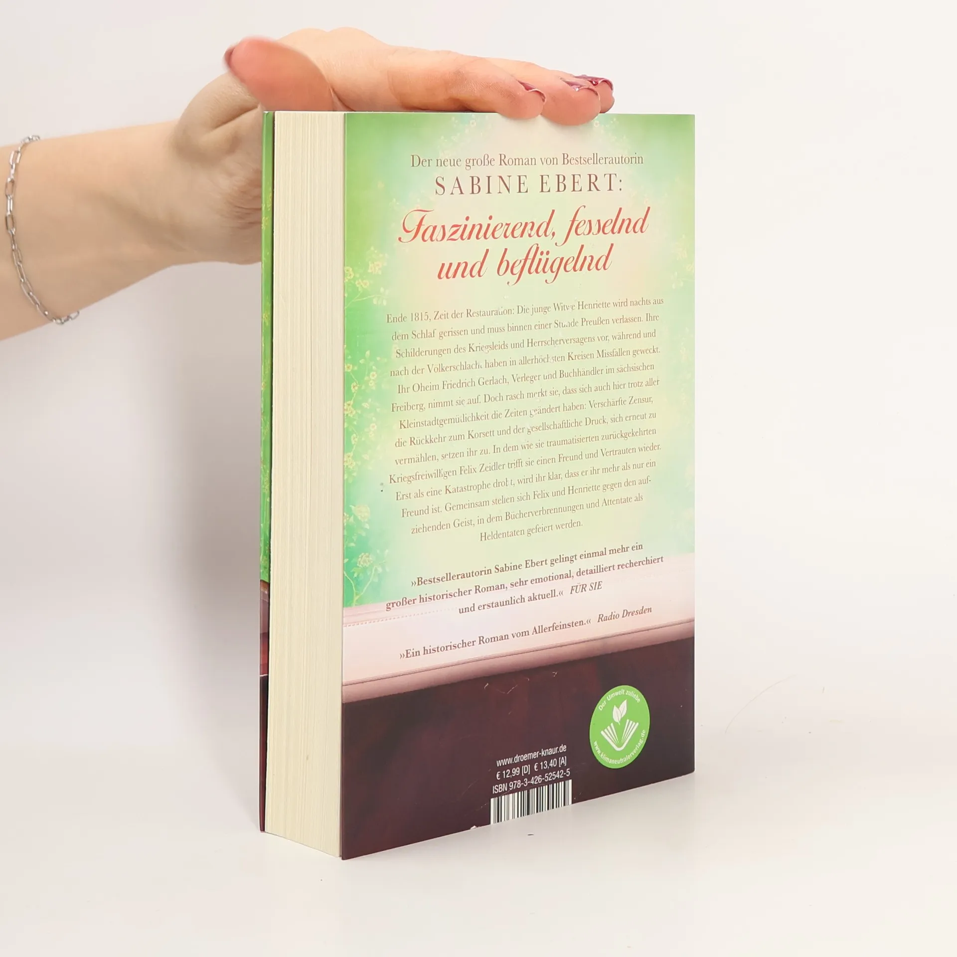 In einem großen historischen Roman entführt die Bestseller-Autorin Sabine Ebert in die bedrückende Zeit der Restauration Ende 1815. Die junge Witwe Henriette wird mitten in der Nacht aus dem Schlaf gerissen und muss Preußen innerhalb einer Stunde verlassen, nachdem ihre Schilderungen über Kriegsleid und Herrscherversagen in hohen Kreisen auf Missfallen stoßen. Ihr Onkel Friedrich Gerlach, ein Verleger in Freiberg, nimmt sie auf, doch die veränderten Zeiten mit verschärfter Zensur, gesellschaftlichem Druck und der Erwartung, sich wieder zu vermählen, setzen ihr zu. Als der traumatisierte Kriegsfreiwillige Felix Zeidler zurückkehrt, findet sie in ihm einen Freund und Vertrauten. Nach einer drohenden Katastrophe wird ihr klar, dass ihre Gefühle für ihn tiefer gehen. Gemeinsam stellen sie sich dem aufkommenden Geist, in dem Bücherverbrennungen und Attentate als Heldentaten gefeiert werden. Ebert schafft ein hochemotionales und perfekt recherchiertes Sittengemälde, das trotz der historischen Kulisse erstaunliche Aktualität aufweist. „Die zerbrochene Feder“ ist Eberts persönlichstes Werk, in dem das Thema Zensur eine zentrale Rolle spielt und viele Bezüge zur jüngeren Geschichte aufweist.