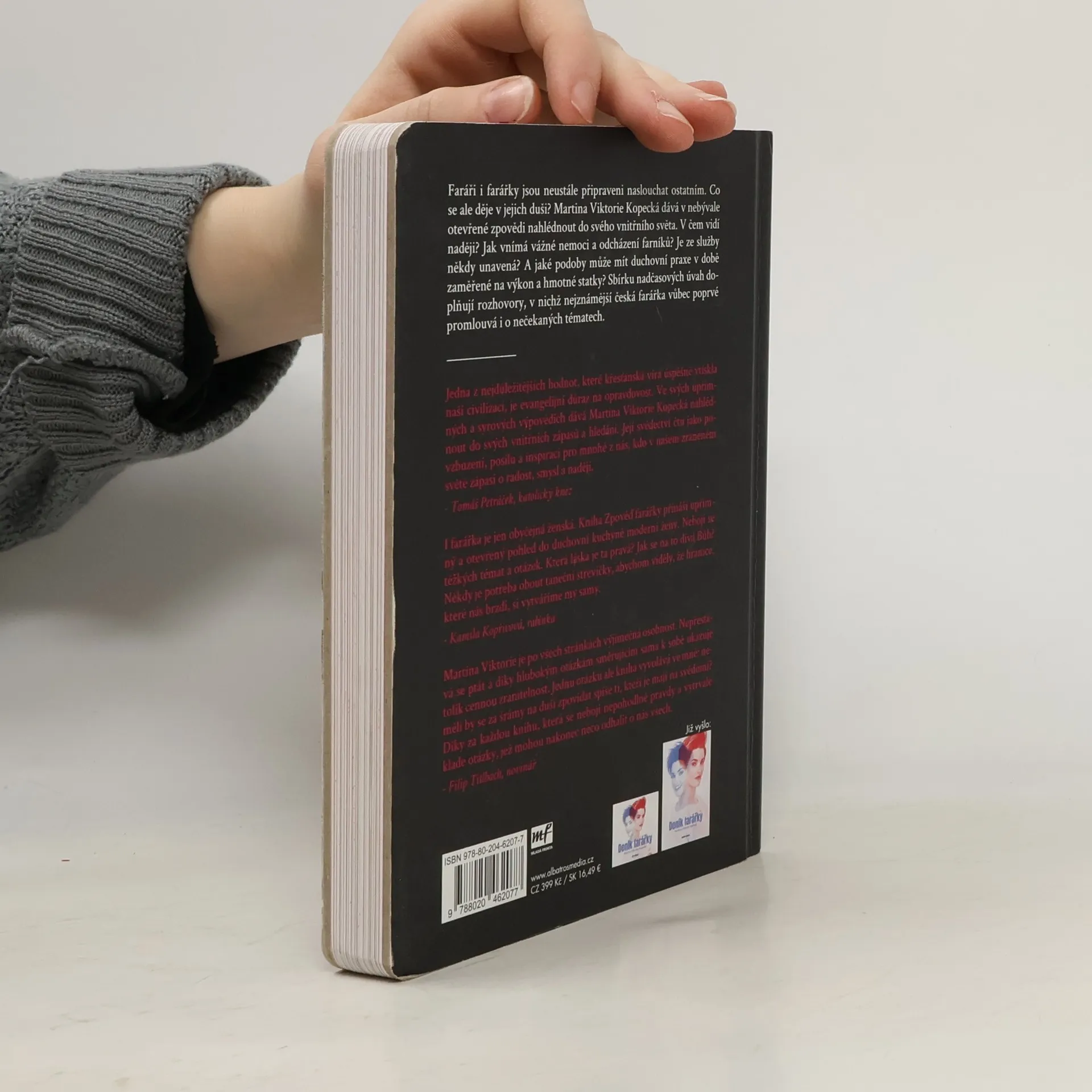 O životě farářky už jste četli. Teď se připravte na cestu do jejího nitra. Faráři i farářky jsou neustále připraveni naslouchat ostatním. Co se ale děje v jejich duši? Martina Viktorie Kopecká dává v nebývale otevřené zpovědi nahlédnout do svého vnitřního světa. Co si myslí o celibátu a založení rodiny? Jak vnímá vážné nemoci a odcházení svých farníků? Je ze služby někdy unavená? A jaké podoby může mít duchovní praxe v době zaměřené na výkon a hmotné statky? Sbírku nadčasových úvah doplňují rozhovory, v nichž nejznámější česká farářka vůbec poprvé promlouvá i o nečekaných tématech.