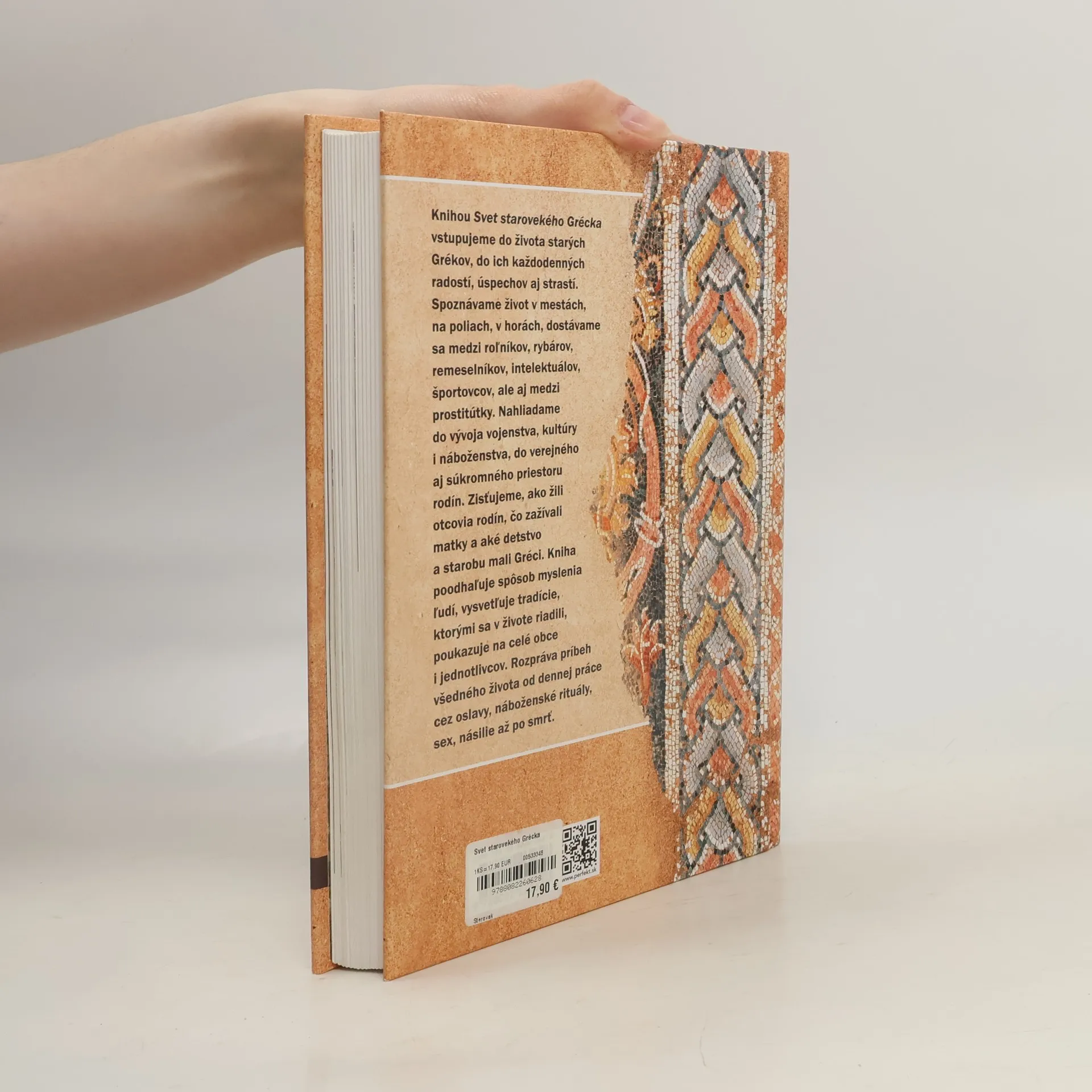 Knihou Svet starovekého Grécka vstupujeme do života starých Grékov, do ich každodenných radostí, úspechov aj strastí. Spoznávame život v mestách, na poliach, v horách, dostávame sa medzi roľníkov, rybárov, remeselníkov, intelektuálov, športovcov, ale aj medzi prostitútky. Nahliadame do vývoja vojenstva, kultúry i náboženstva, do verejného aj súkromného priestoru rodín. Zisťujeme, ako žili otcovia rodín, čo zažívali matky a aké detstvo a starobu mali Gréci. Kniha poodhaľuje spôsob myslenia ľudí, vysvetľuje tradície, ktorými sa v živote riadili, poukazuje na celé obce i jednotlivcov. Rozpráva príbeh všedného života od dennej práce cez oslavy, náboženské rituály, sex, násilie až po smrť.