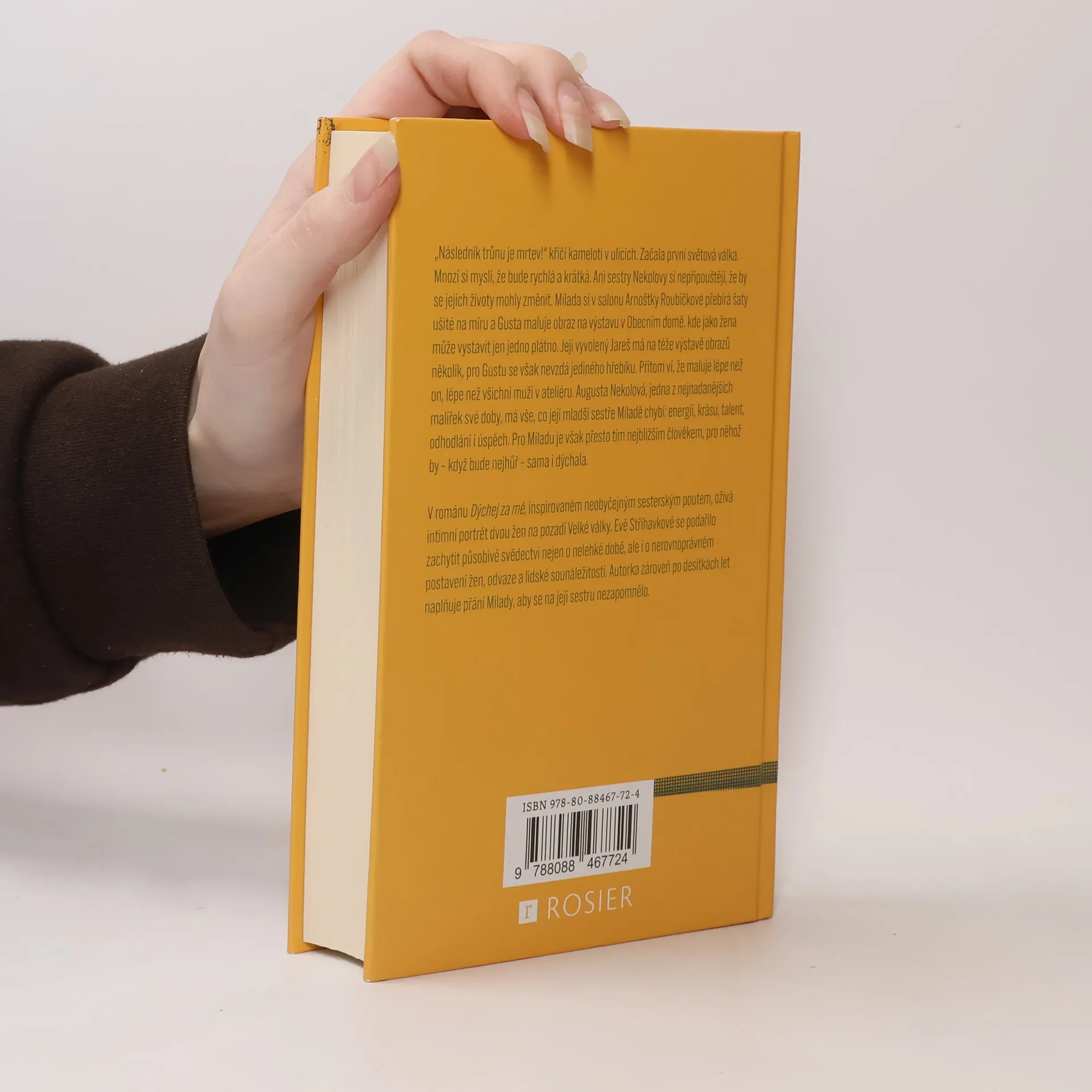 Podle skutečného příběhu české malířky, jejíž talent byl zastíněn válkou . „Následník trůnu je mrtev!“ křičí kameloti v ulicích. Začala první světová válka. Mnozí si myslí, že bude rychlá a krátká. Ani sestry Nekolovy si nepřipouštějí, že by se jejich životy mohly změnit. Milada si v salonu Arnoštky Roubíčkové přebírá šaty ušité na míru a Gusta maluje obraz na výstavu v Obecním domě, kde jako žena může vystavit jen jedno plátno. Její vyvolený Jareš má na téže výstavě obrazů několik, pro Gustu se však nevzdá jediného hřebíku. Přitom ví, že maluje lépe než on, lépe než všichni muži v ateliéru. Augusta Nekolová, jedna z nejnadanějších malířek své doby, má vše, co její mladší sestře Miladě chybí: energii, krásu, talent, odhodlání i úspěch. Pro Miladu je však přesto tím nejbližším člověkem, pro něhož by – když bude nejhůř – sama i dýchala. V románu Dýchej za mě, inspirovaném neobyčejným sesterským poutem, ožívá intimní portrét dvou žen na pozadí Velké války. Evě Střihavkové se podařilo zachytit působivé svědectví nejen o nelehké době, ale i o nerovnoprávném postavení žen, odvaze a lidské sounáležitosti. Autorka zároveň po desítkách let naplňuje přání Milady, aby se na její sestru nezapomnělo.