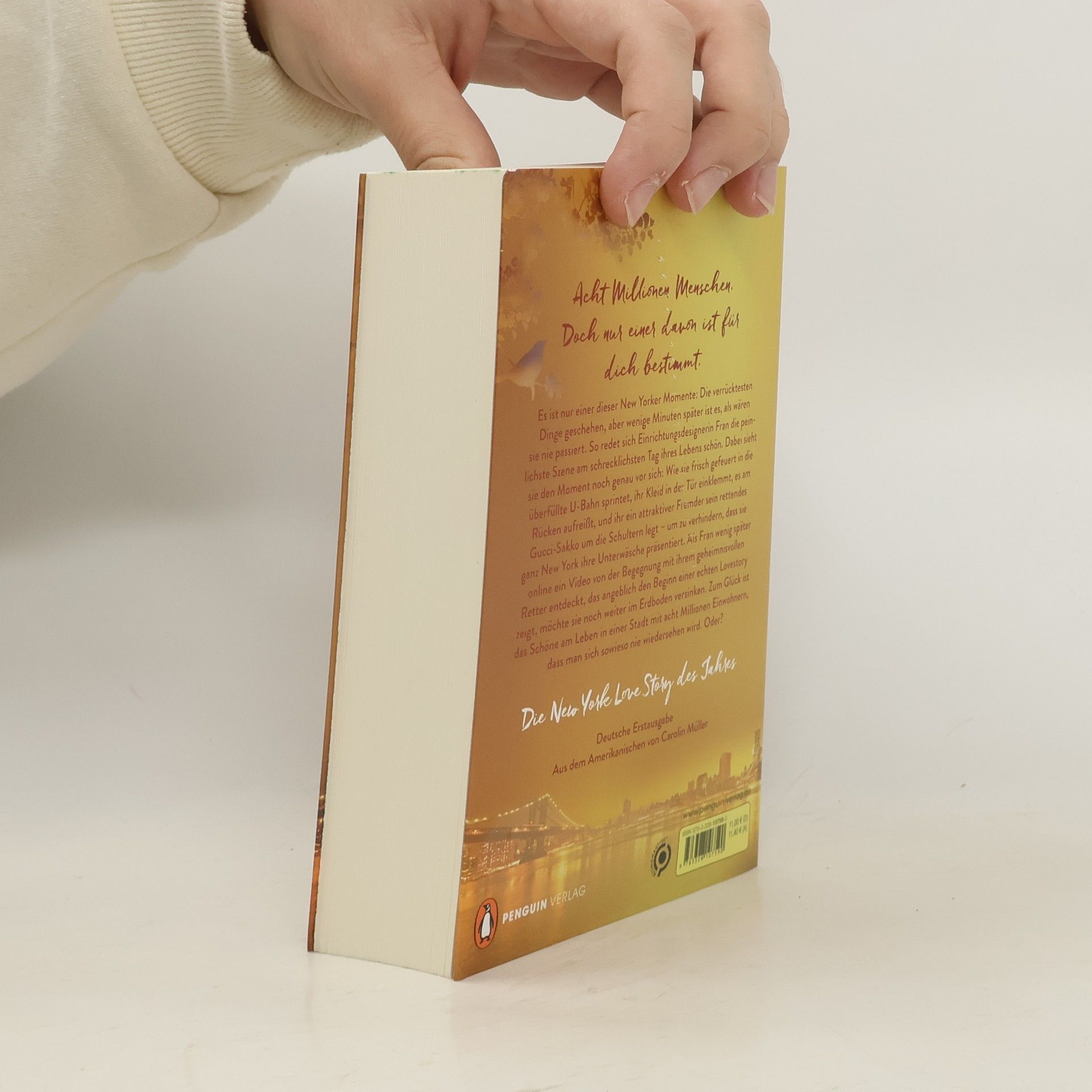 Acht Millionen Menschen. Doch nur einer davon ist für dich bestimmt. Es ist nur einer dieser New Yorker Momente: Die verrücktesten Dinge geschehen, aber wenige Minuten später ist es, als wären sie nie passiert. So redet sich Einrichtungsdesignerin Fran die peinlichste Szene am schrecklichsten Tag ihres Lebens schön. Dabei sieht sie den Moment noch genau vor sich: Wie sie frisch gefeuert und schwitzend in die überfüllte U-Bahn sprintet, ihr Kleid in der Tür einklemmt, es am Rücken aufreißt, und ihr ein attraktiver Fremder sein rettendes Gucci-Sakko um die Schultern legt – um zu verhindern, dass sie ganz New York ihre Unterwäsche präsentiert. Als Fran wenig später online ein Video von der Begegnung mit ihrem geheimnisvollen Retter entdeckt, das angeblich den Beginn einer echten Lovestory zeigt, möchte sie noch weiter im Erdboden versinken. Zum Glück ist das Schöne am Leben in einer Stadt mit acht Millionen Einwohnern, dass man sich sowieso nie wiedersehen wird. Oder? Spaziergänge im Central Park, Sonnenuntergänge auf der Brooklyn Bridge und romantische Stunden zu zweit: Die schönste New York Love Story des Jahres! Hochwertig veredelt – ein Buch, das funkelt wie die Lichter am Broadway