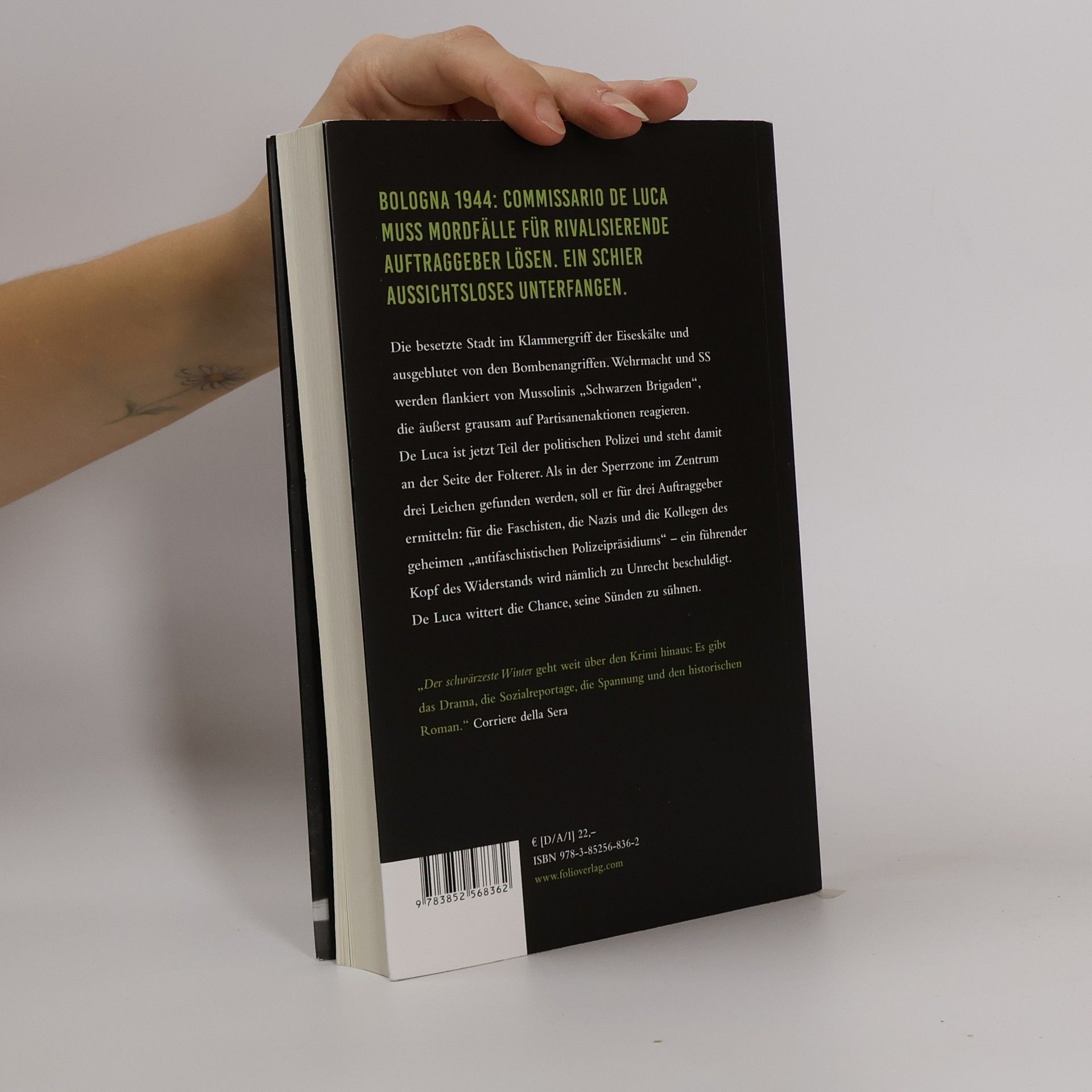 Bologna 1944: Commissario De Luca muss Mordfälle für rivalisierende Auftraggeber lösen. Ein schier aussichtsloses Unterfangen. Die besetzte Stadt im Klammergriff der Eiseskälte und ausgeblutet von den Bombenangriffen. Wehrmacht und SS werden flankiert von Mussolinis „Schwarzen Brigaden“, die äußerst grausam auf Partisanenaktionen reagieren. De Luca ist jetzt Teil der politischen Polizei und steht damit an der Seite der Folterer. Als in der Sperrzone im Zentrum drei Leichen gefunden werden, soll er für drei Auftraggeber ermitteln: für die Faschisten, die Nazis und die Kollegen des geheimen „antifaschistischen Polizeipräsidiums“ – ein führender Kopf des Widerstands wird nämlich zu Unrecht beschuldigt. De Luca wittert die Chance, seine Sünden zu sühnen.