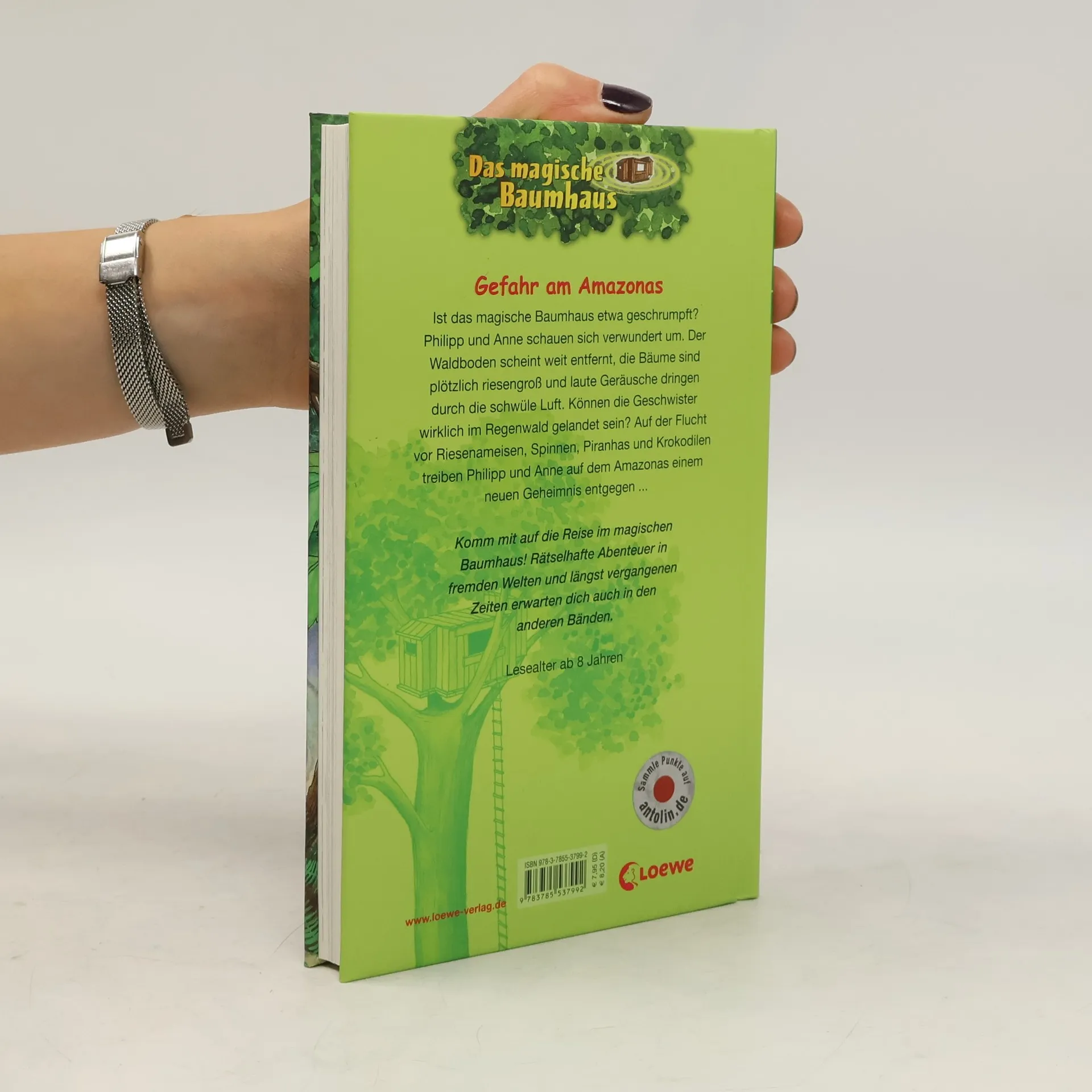Das Buch ist bei deiner Buchhandlung vor Ort und bei vielen Online-Buchshops erhältlich! + Bücher, die Kinder gerne lesen wollen + Beliebte Themen: Abenteuer, Tiere und fremde Länder + Hochwertiges Hardcover + Mit vielen Illustrationen + Bereits über 10 Millionen verkaufte Bücher der Baumhaus-Reihe + Ausgewogenes Text-Bild-Verhältnis + Große Schrift + Kurze Kapitel + Ist das magische Baumhaus etwa geschrumpft? Philipp und Anne schauen sich verwundert um. Der Waldboden scheint so weit entfernt, die Bäume sind plötzlich riesengroß, und laute Geräusche dringen durch die schwüle Luft. Können sie wirklich im Regenwald gelandet sein? Auf der Flucht vor Killer-Ameisen, Spinnen, Piranhas und Krokodilen treiben Philipp und Anne auf dem Amazonas einem neuen Geheimnis entgegen ... Komm mit auf die Reise im magischen Baumhaus! Rätselhafte Abenteuer in fremden Welten und längst vergangenen Zeiten erwarten dich auch in den anderen Bänden. Die beliebte Kinderbuch-Reihe von Bestsellerautorin Mary Pope Osborne! Die Geschwister Anne und Philipp reisen mit dem magischen Baumhaus durch die Zeit. Sie erleben spannende Abenteuer, entdecken ferne Länder und lernen viele berühmte Persönlichkeiten kennen. Mehr Infos zur Reihe und tolle Extras unter: www. MagischesBaumhaus. de