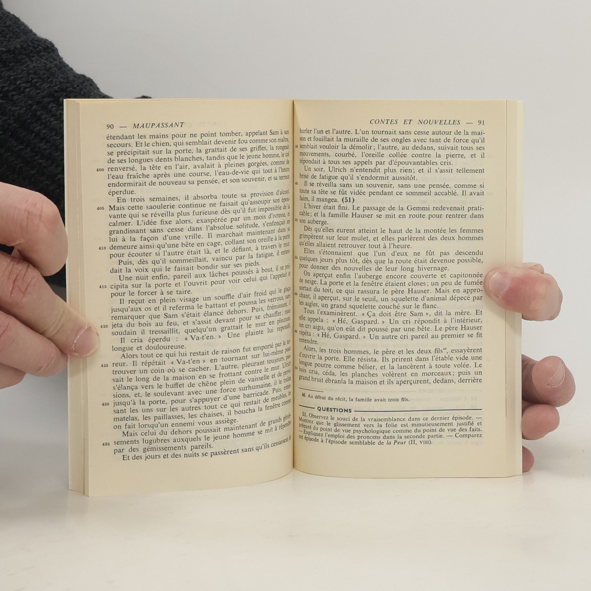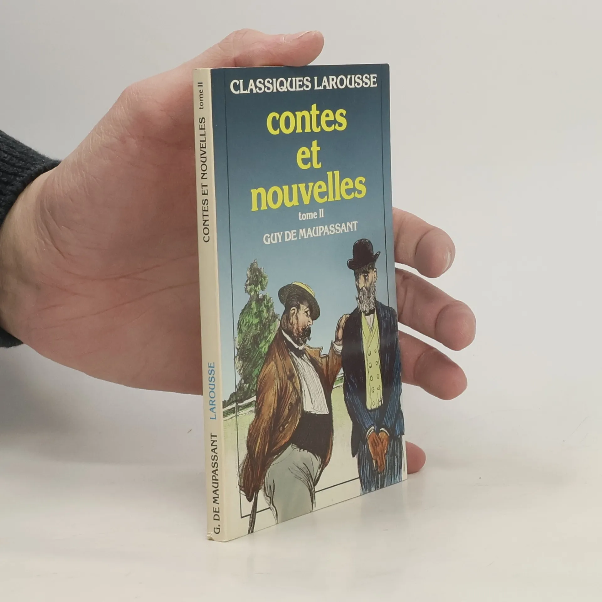This is a tiny hardcopy book written in French about 4 ½” x 3 ¼”. The spine says "Maupassant Conte et Nouvelles." The cover page says "Conte et Nouvelles par Guy de Maupassant."