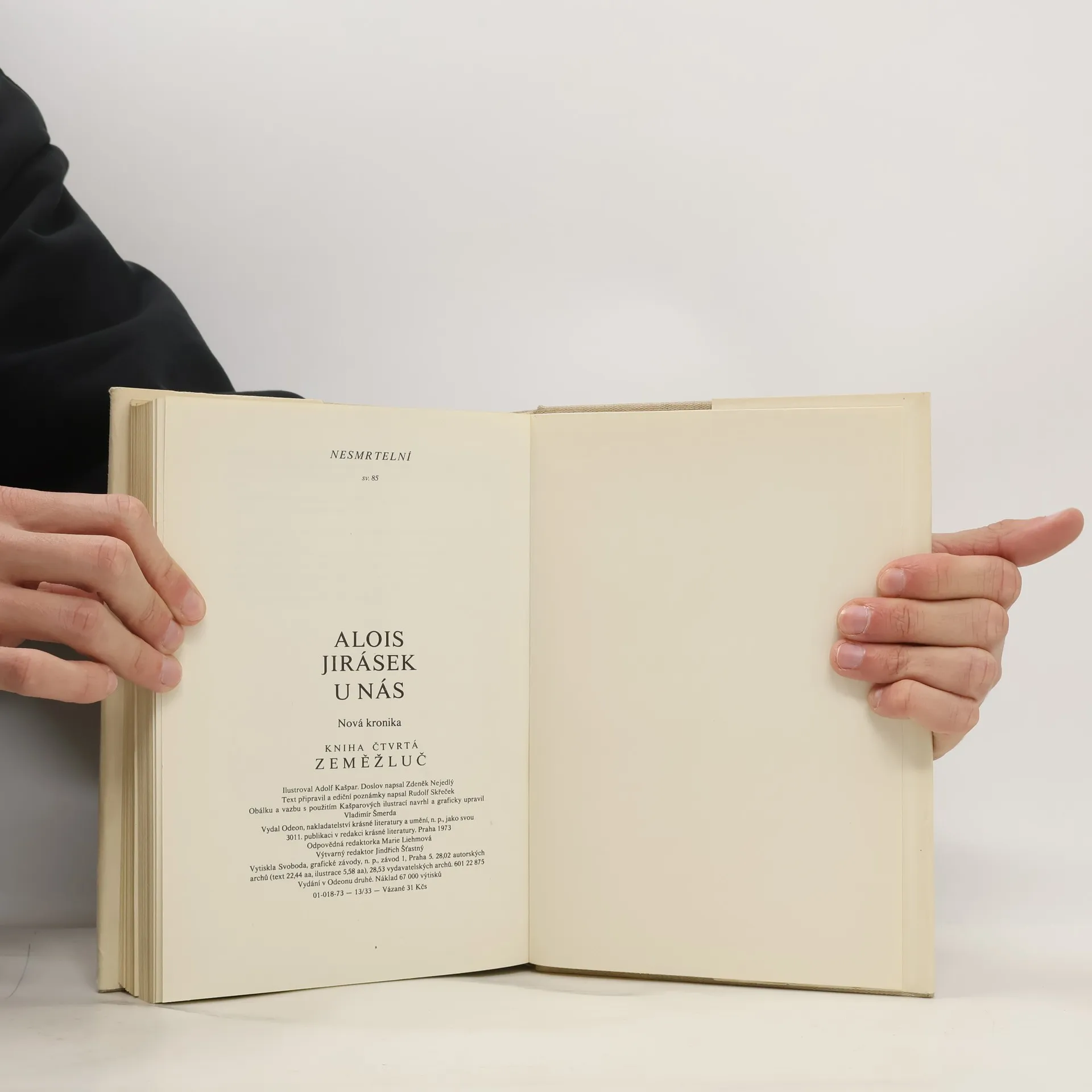 Alois Jirásek: U NÁS. Románová čtyřdílná kronika. Kniha čtvrtá - ZEMĚŽLUČ. Psáno roku 1901 - 1902. Druhé vydání v roce 1927. Nakladatelství J. Otto, spol. s r.o. v Praze, edice: Nová kronika. Tiskem České grafické unie, a.s. v Praze. Vazba celoplátěná nakladatelská s barevným popisem na hřbetu, stužková záložka.