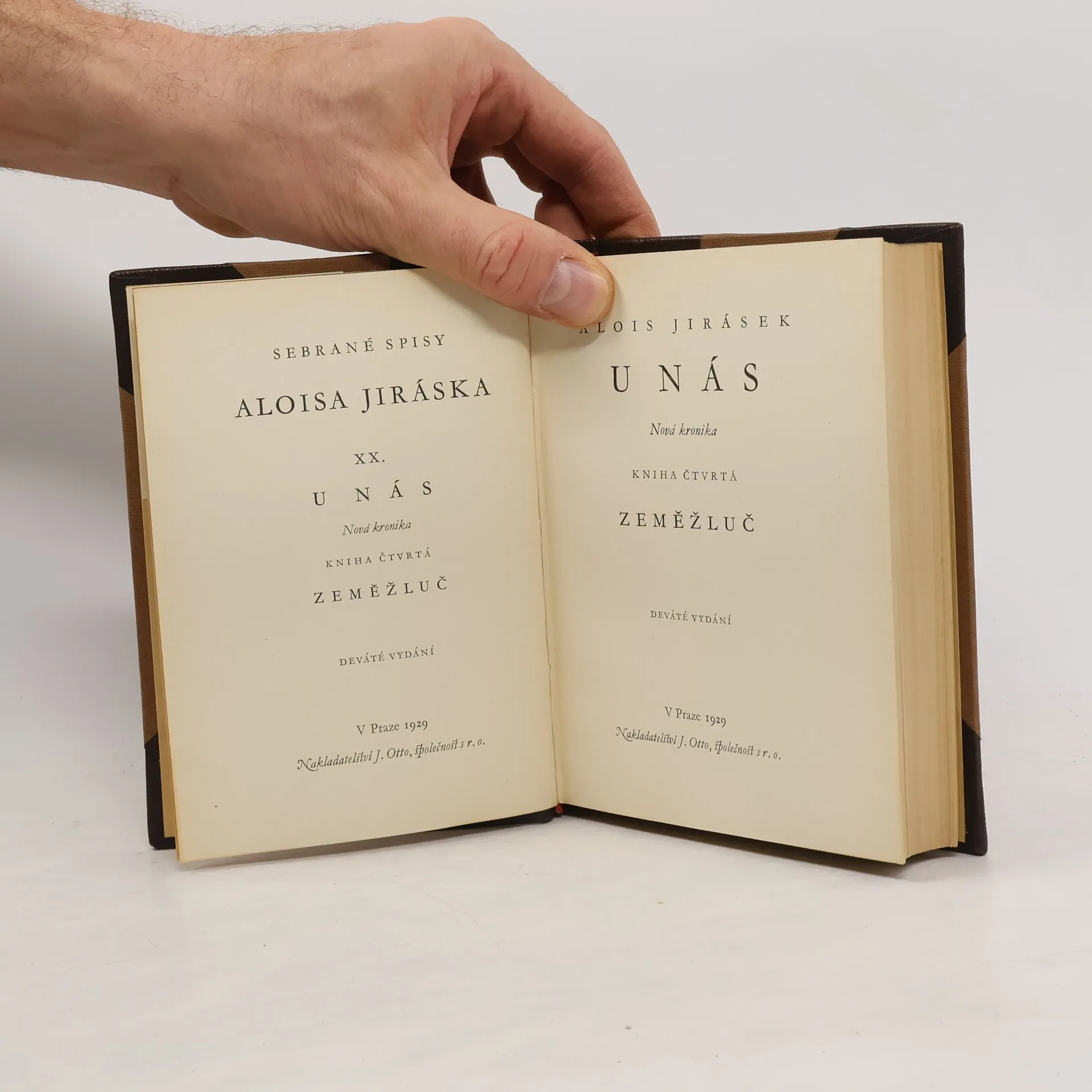 Alois Jirásek: U NÁS. Románová čtyřdílná kronika. Kniha čtvrtá - ZEMĚŽLUČ. Psáno roku 1901 - 1902. Druhé vydání v roce 1927. Nakladatelství J. Otto, spol. s r.o. v Praze, edice: Nová kronika. Tiskem České grafické unie, a.s. v Praze. Vazba celoplátěná nakladatelská s barevným popisem na hřbetu, stužková záložka.