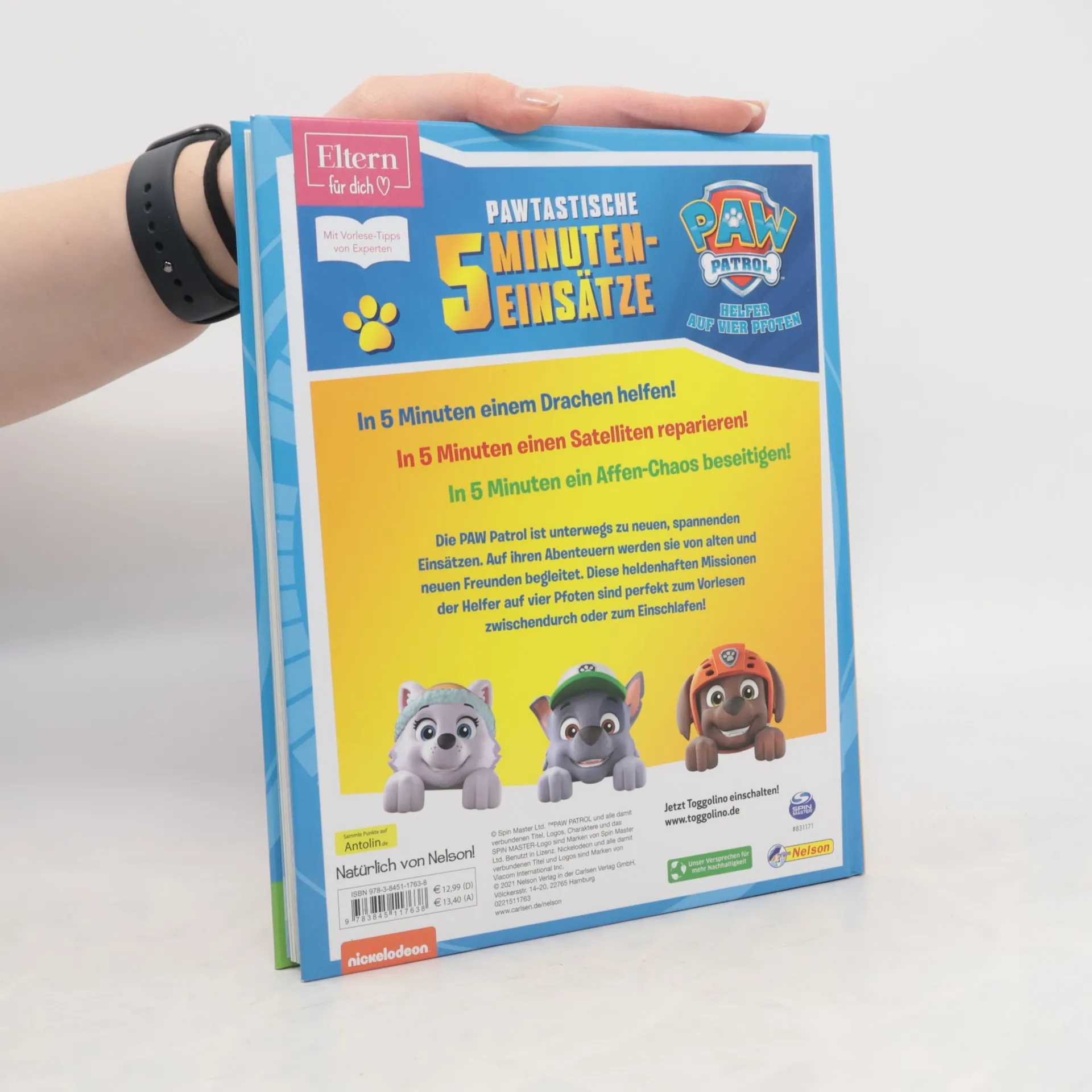 In 5 Minuten einem Drachen helfen! In 5 Minuten einen Satelliten reparieren! In 5 Minuten ein Affen-Chaos beseitigen! Die PAW Patrol ist unterwegs zu neuen, spannenden Einsätzen. Auf ihren Abenteuern werden sie von alten und neuen Freunden begleitet. Diese heldenhaften Missionen der Helfer auf vier Pfoten sind perfekt zum Vorlesen zwischendurch oder zum Einschlafen! Als ELTERN-Vorlesebuch ergänzt durch wertvolle, fundierte Vorlese-Tipps aus der Redaktion. Der Sammelband beinhaltet die Geschichten zu diesen TV-Folgen : Außer Kontrolle Der Satellitenabsturz Die Riesenpflanze Der neue Sportplatz Auf Safari Der verspielte Drache Affen-Alarm In diesem Buch werden 7 spannenden Einsätze der Helfer auf vier Pfoten auf 144 Seiten nacherzählt. PAW-Patrol-Fans ab 3 Jahren tauchen in die Rettungsmissionen ein und bekommen wichtige Werte wie Hilfsbereitschaft, Freundschaft und Mut vermittelt.