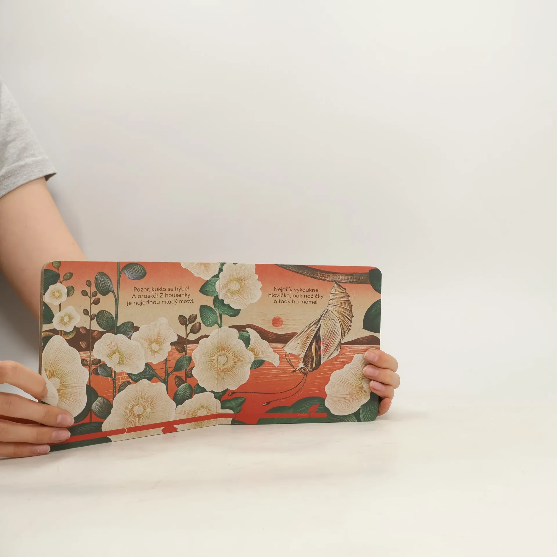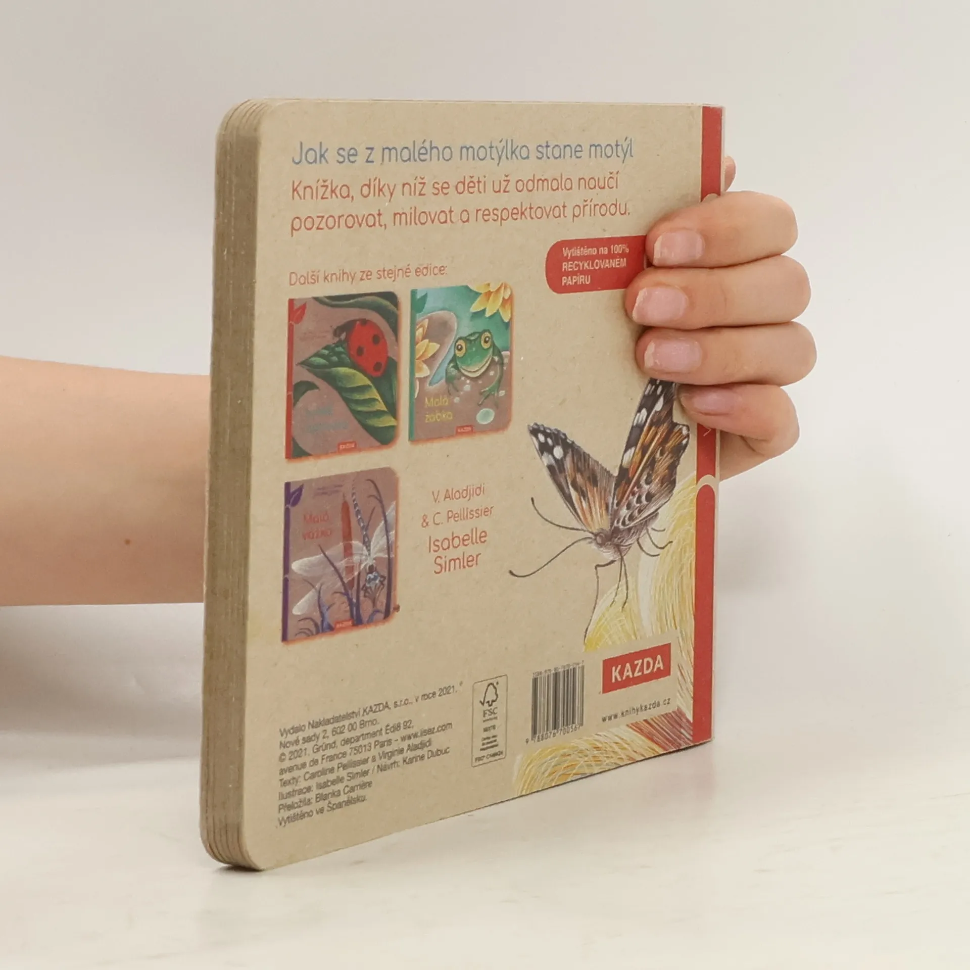 Knížka z recyklovaného neběleného kartonu ukazuje proměnu housenky v krásného motýla.