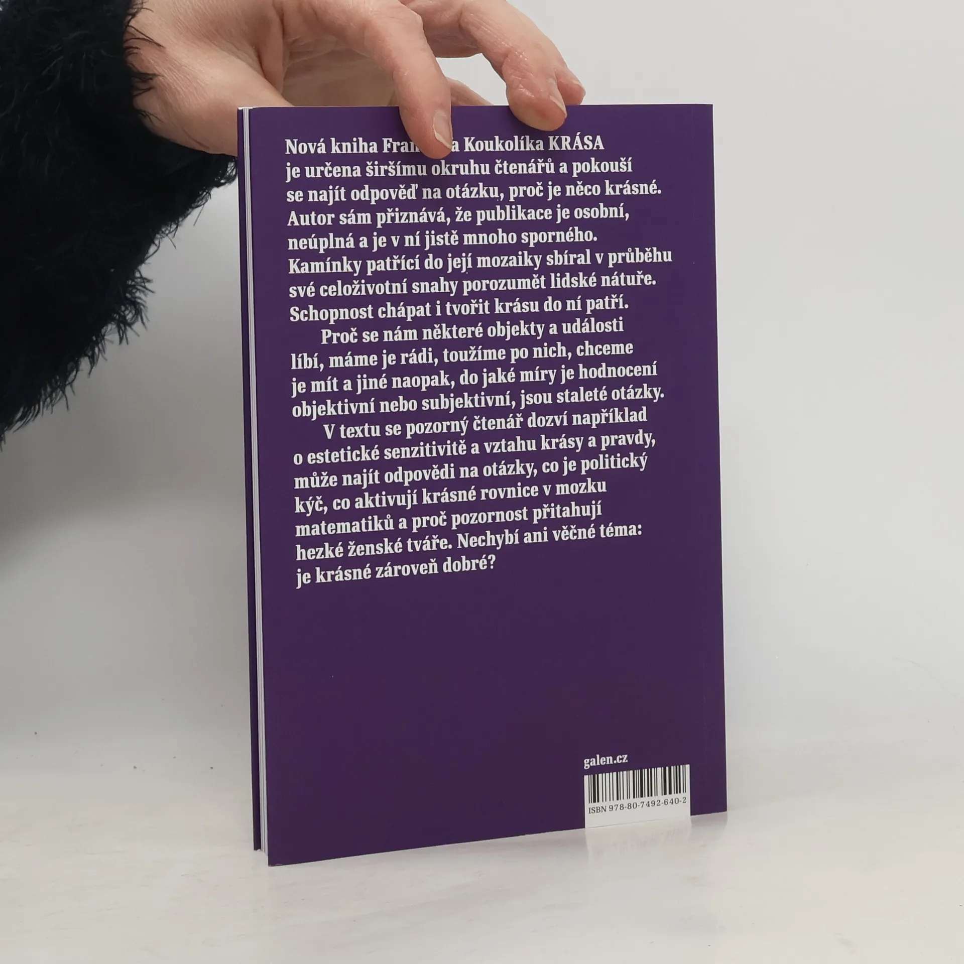 Kniha Františka Koukolíka Krása je určena širšímu okruhu čtenářů a pokouší se najít odpověď na otázku, proč je něco krásné. Autor sám přiznává, že publikace je osobní, neúplná a je v ní jistě mnoho sporného. Kamínky patřící do její mozaiky sbíral v průběhu své celoživotní snahy porozumět lidské nátuře. Schopnost chápat i tvořit krásu do ní patří.Proč se nám některé objekty a události líbí, máme je rádi, toužíme po nich, chceme je mít a jiné naopak, do jaké míry je hodnocení objektivní nebo subjektivní, jsou staleté otázky.V textu se pozorný čtenář dozví například o estetické senzitivitě a vztahu krásy a pravdy, může najít odpovědi na otázky, co je politický kýč, co aktivují krásné rovnice v mozku matematiků a proč pozornost přitahují hezké ženské tváře. Nechybí ani věčné téma: je krásné zároveň dobré?