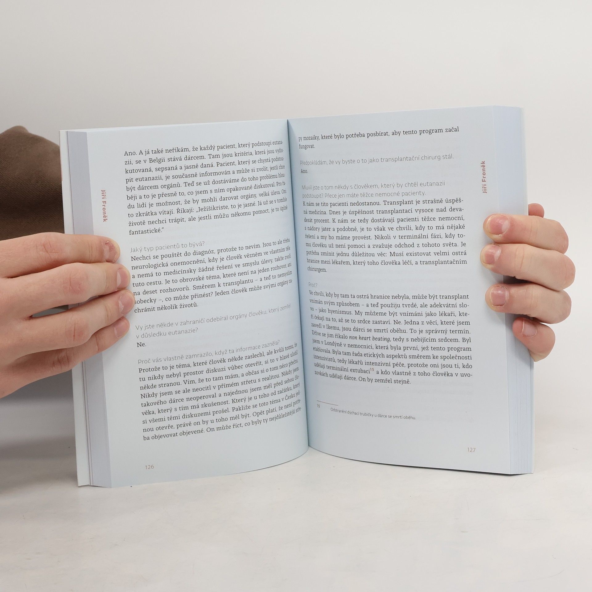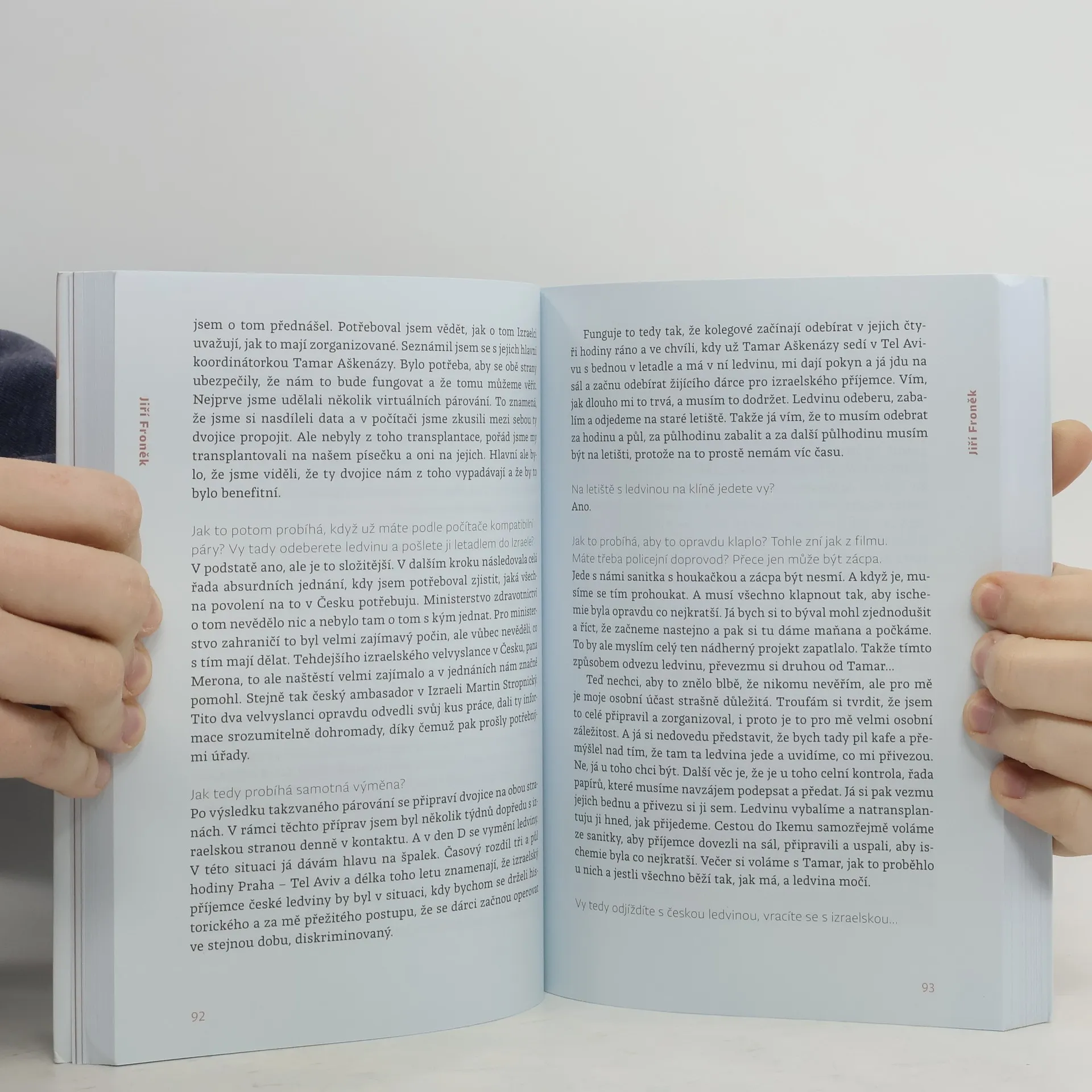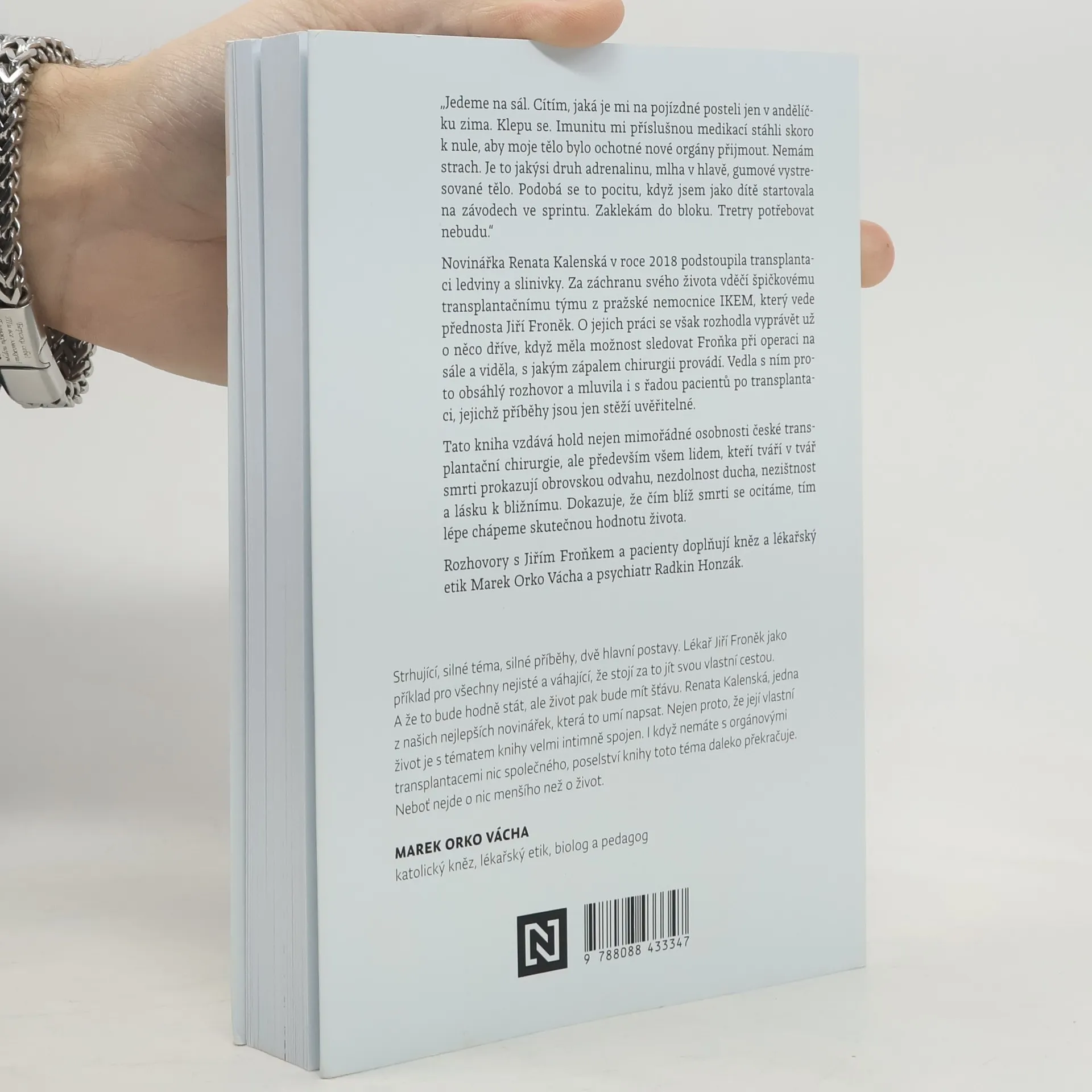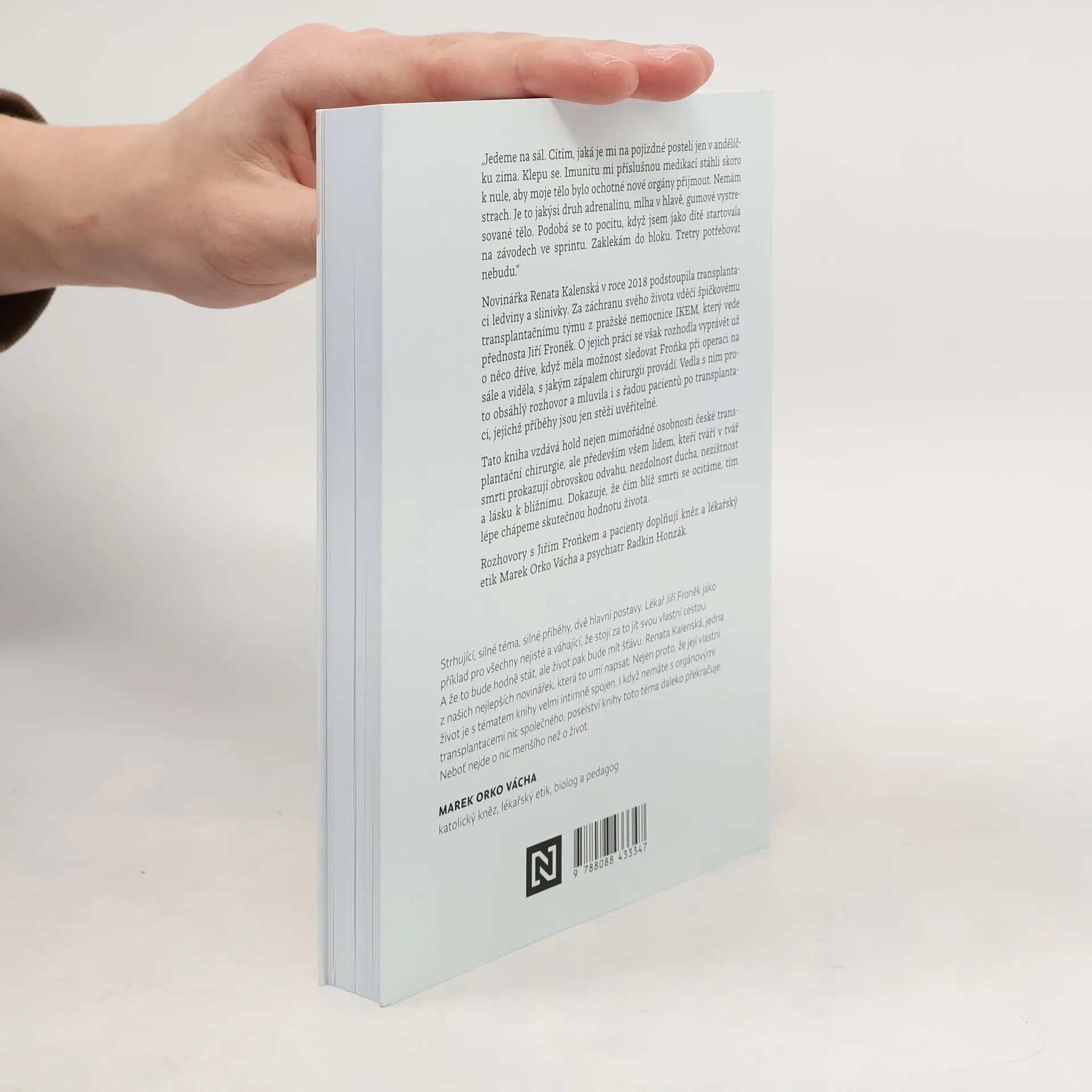 Příběhy české transplantační chirurgie. „Jedeme na sál. Cítím, jaká je mi na pojízdné posteli jen v andělíčku zima. Klepu se. Imunitu mi příslušnou medikací stáhli skoro k nule, aby moje tělo bylo ochotné nové orgány přijmout. Nemám strach. Je to jakýsi druh adrenalinu, mlha v hlavě, gumové vystresované tělo. Podobá se to pocitu, když jsem jako dítě startovala na závodech ve sprintu. Zaklekám do bloku. Tretry potřebovat nebudu.“Novinářka Renata Kalenská v roce 2018 podstoupila transplantaci ledviny a slinivky. Za záchranu svého života vděčí špičkovému transplantačnímu týmu z pražské nemocnice IKEM, který vede přednosta Jiří Froněk. O jejich práci se však rozhodla vyprávět už o něco dříve, když měla možnost sledovat Froňka při operaci na sále a viděla, s jakým zápalem chirurgii provádí. Vedla s ním proto obsáhlý rozhovor a mluvila také s řadou pacientů po transplantaci, jejichž příběhy jsou jen stěží uvěřitelné.Tato kniha vzdává hold nejen mimořádné osobnosti české transplantační chirurgie, ale především všem lidem, kteří tváří v tvář smrti prokazují obrovskou odvahu, nezdolnost ducha, nezištnost a lásku k bližnímu. Dokazuje, že čím blíž smrti se ocitáme, tím lépe chápeme skutečnou hodnotu života.Rozhovory s Jiřím Froňkem a pacienty doplňují kněz a lékařský etik Marek Orko Vácha a psychiatr Radkin Honzák.