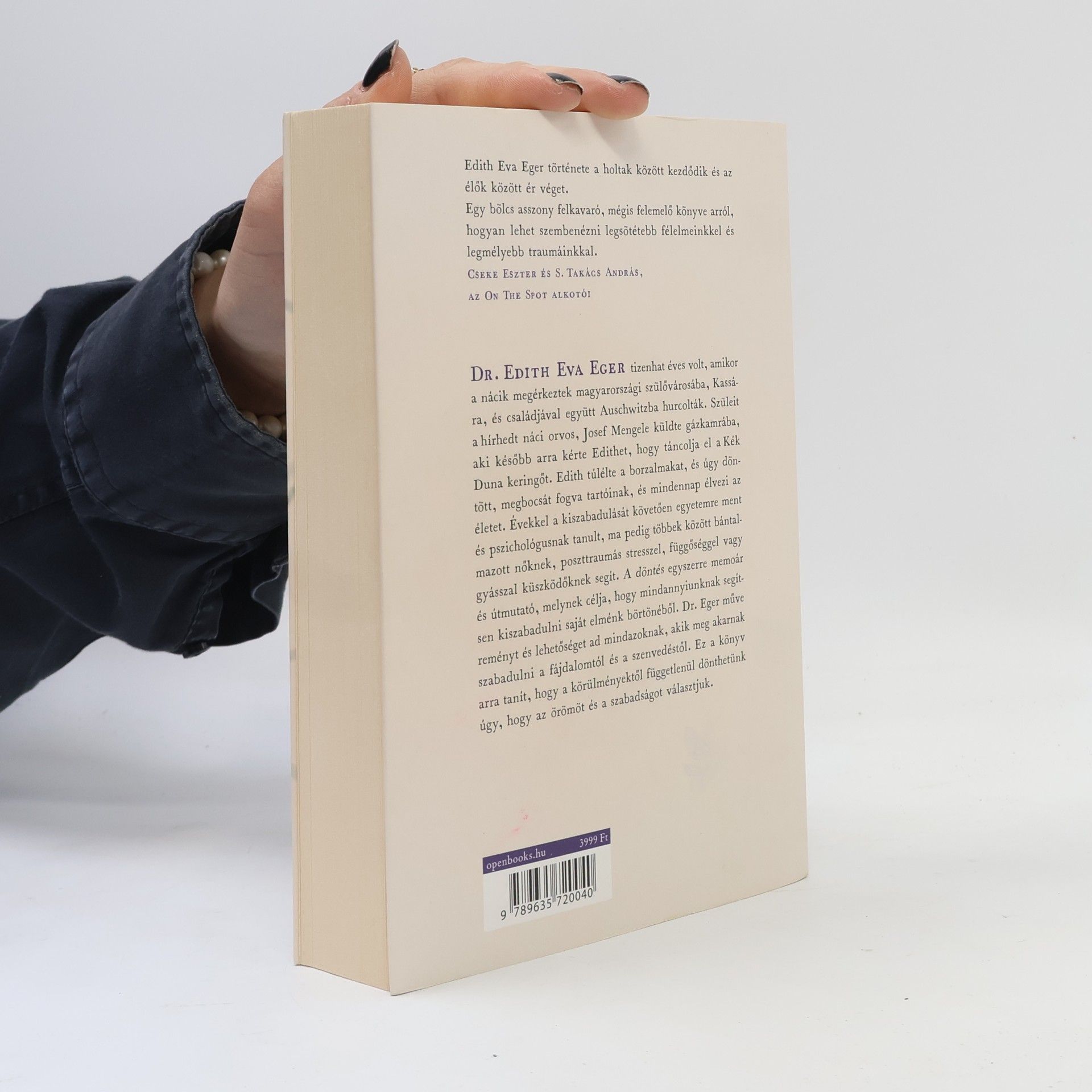 A célom, hogy olvasóim felfedezzék, hogyan szökhetnek meg saját elméjük koncentrációs táborából, és válhatnak azzá, akinek lenniük kellene. Segíteni szeretnék nekik megszabadulni a múltjuktól, kudarcaiktól, félelmeiktől, dühüktől és megbánásaiktól, hogy átélhessék a szabadságot, amely lehetővé teszi számukra, hogy az életet teljes mivoltában élvezzék. Nem választhatunk fájdalom nélküli életet, de választhatjuk a szabadságot, hogy megszökjünk a múltunktól, bármi is történjék. Dr. Edith Eva Eger, aki 1944-ben Auschwitzba deportálták családjával, ma klinikai pszichológus és a Kaliforniai Egyetem oktatója. Tanácsadóként segíti a katonákat a poszttraumás stressz leküzdésében, és számos médiában szerepelt. Tizenhat évesen élte át a borzalmakat, szüleit a hírhedt orvos, Joseph Mengele küldte a gázkamrába. Edith a nővérével túlélte a borzalmakat, és úgy döntött, megbocsát fogva tartóinak. Évekkel később pszichológus lett, és ma bántalmazott nőknek, poszttraumás stresszeseknek és másoknak segít. Ez a mű egyszerre memoár és útmutató, amely reményt ad mindazoknak, akik meg akarnak szabadulni a fájdalomtól és szenvedéstől, bármilyen körülmények között.