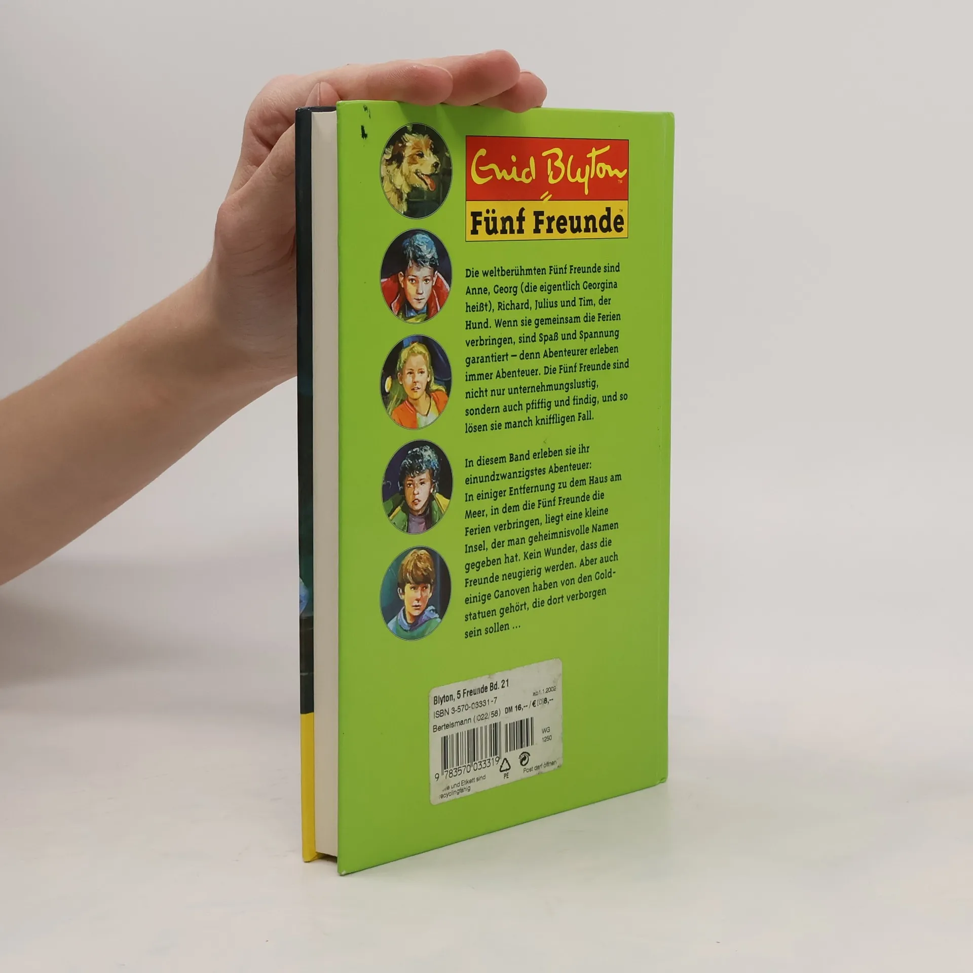 Die weltberühmten fünf Freunde: Anne, Georg (die eigentlich Georgina heißt), Richard, Julius und Tim, der Hund. Alle 21 Bände der erfolgreichsten Serie von Enid Blyton, neu bearbeitet von Elisabeth Lang. Die fünf Freunde verbringen ihre Ferien in einem kleinen Anwesen mit freiem Blick auf die See. In einiger Entfernung liegt eine kleine Insel, der man geheimnisvolle Namen gegeben hat. Man nennt sie „die klagende Insel“, „die flüsternde“, aber auch die „verbotene Insel“. Kein Wunder, dass die fünf Freunde neugierig werden. Aber auch ein paar Gauner haben von den Goldstatuen gehört, die dort verborgen sein sollen...