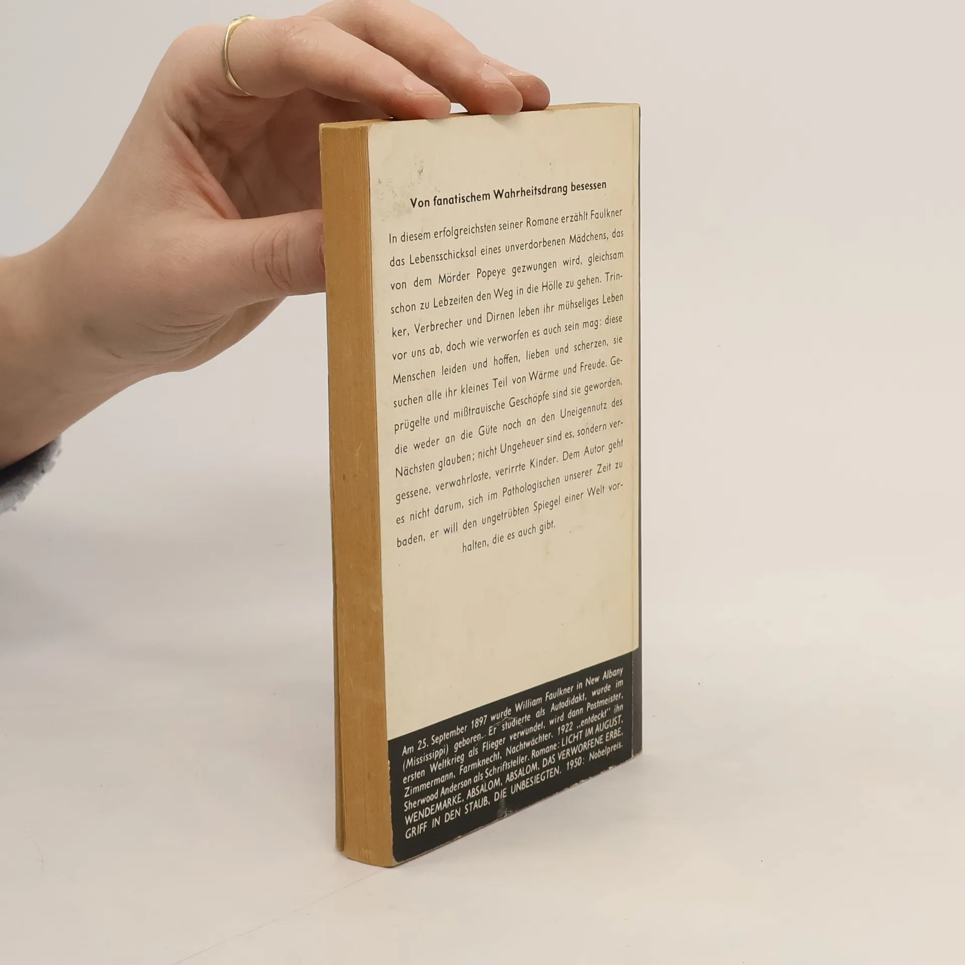 Die reiche und verwöhnte Studentin Temple Drake gerät nach einem Autounfall mit ihrem betrunkenen Galan in die Hände von Schwarzbrennern und Gangstern. William Faulkner gelingt es, die Faszination des Bösen mit unheimlicher Unmittelbarkeit darzustellen. Eine vernichtende Gesellschaftskritik.