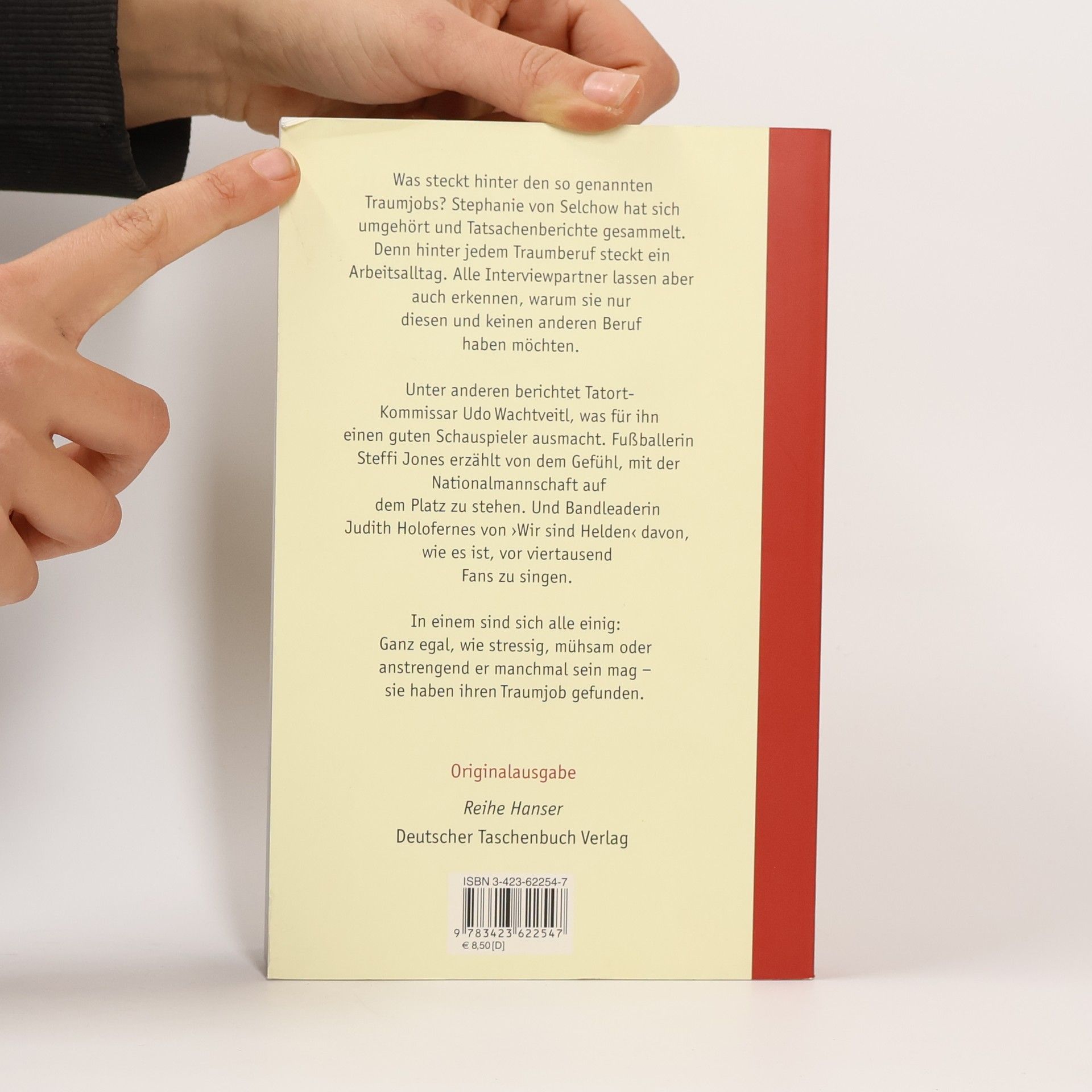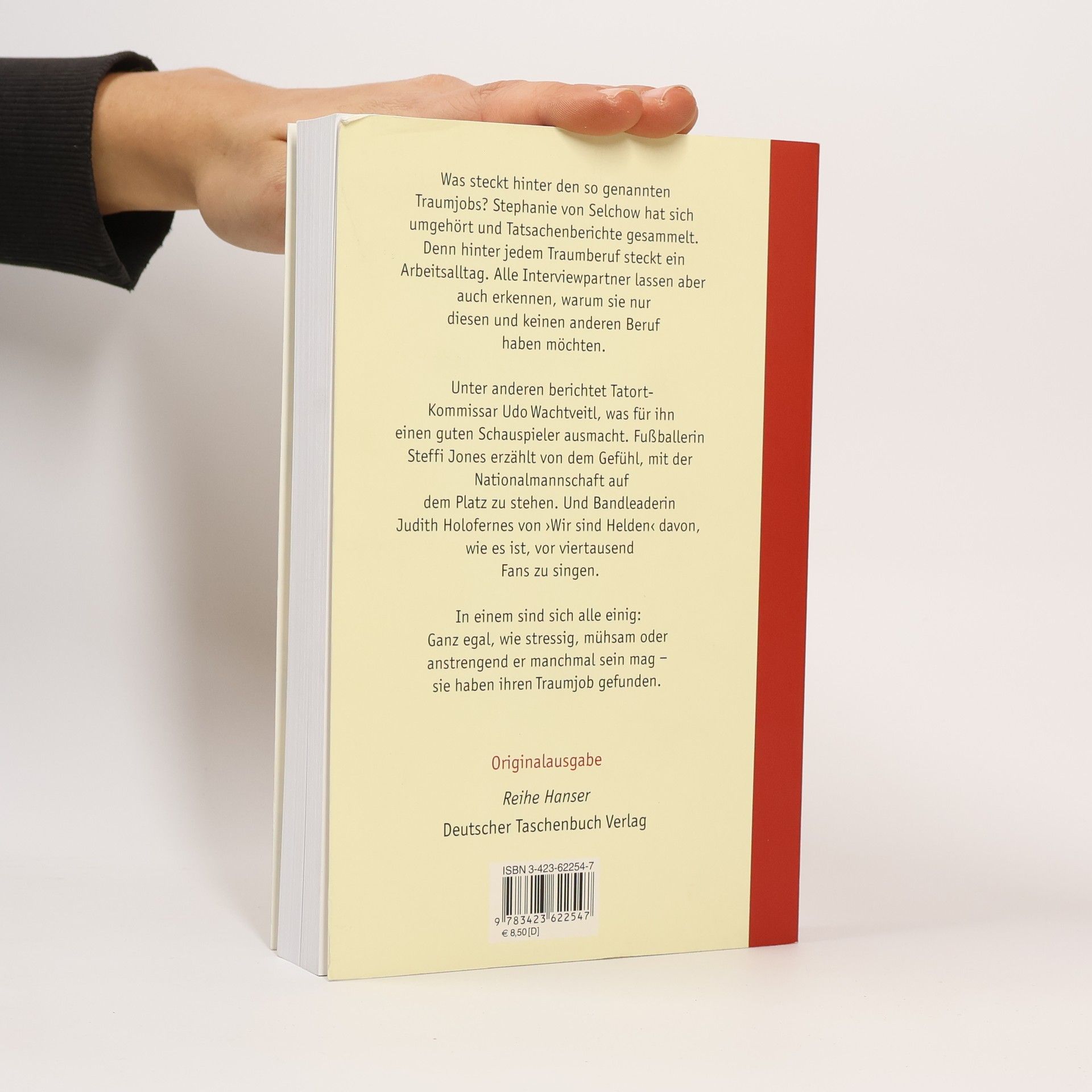 Was steckt hinter den so genannten Traumjobs? Stephanie von Selchow hat sich umgehört und Tatsachenberichte aus der Wirklichkeit gesammelt. Denn hinter jedem Traumberuf steckt ein Arbeitsalltag, eine nicht so glänzende Seite. Alle Interviewpartner lassen aber auch erkennen, warum sie nur diesen und keinen anderen Beruf haben möchten. Unter anderen berichtet Tatort-Kommissar Udo Wachtveitl, was für ihn einen guten Schauspieler ausmacht. Fußballerin Steffi Jones erzählt von dem Gefühl, mit der Nationalmannschaft auf dem Platz zu stehen. Und Bandleaderin Judith Holofernes von ›Wir sind Helden‹ davon, wie es ist, vor viertausend Fans zu singen. In einem sind sich alle einig: Ganz egal, wie stressig, mühsam oder anstrengend ihr Tag auch manchmal sein mag - sie haben ihren Traumjob gefunden.