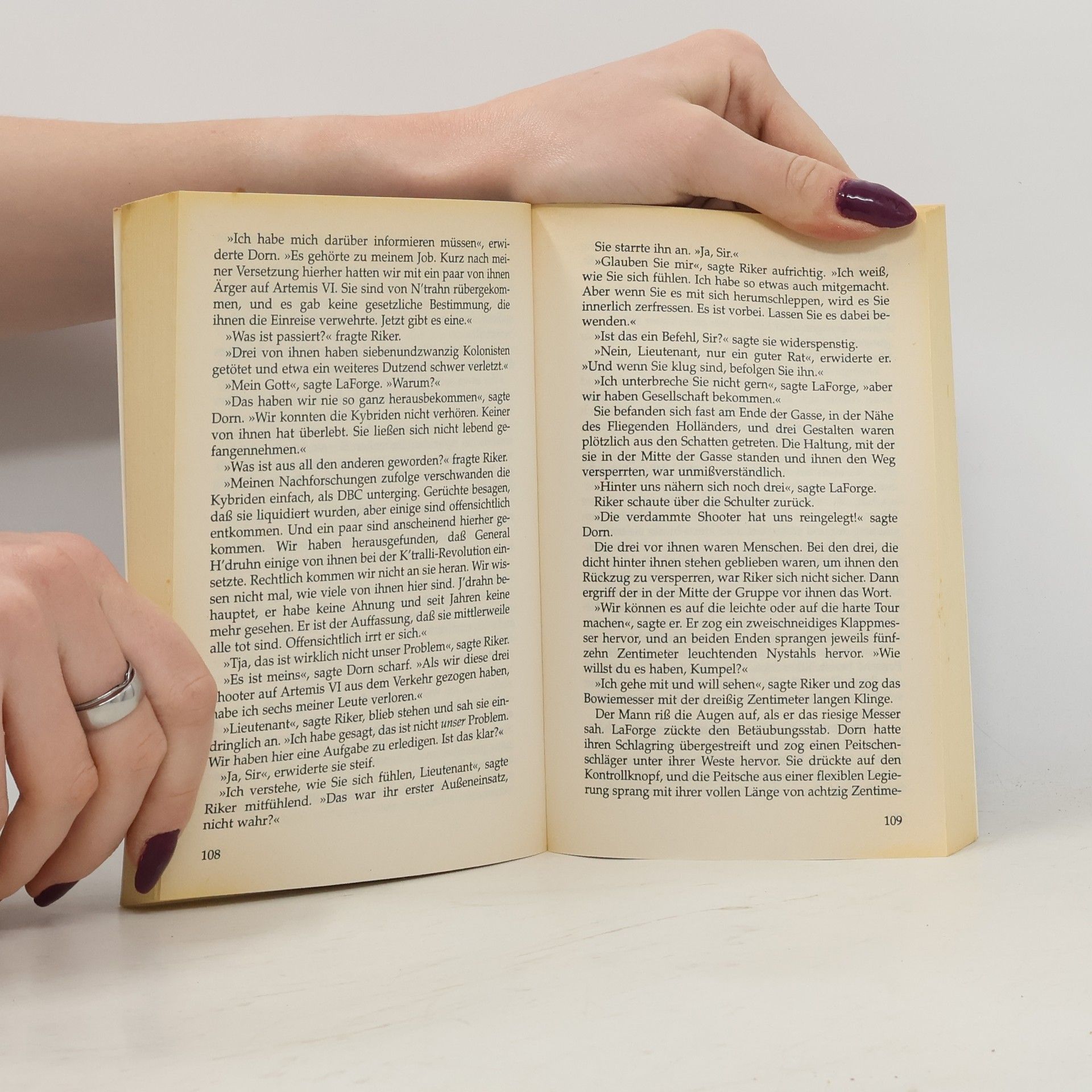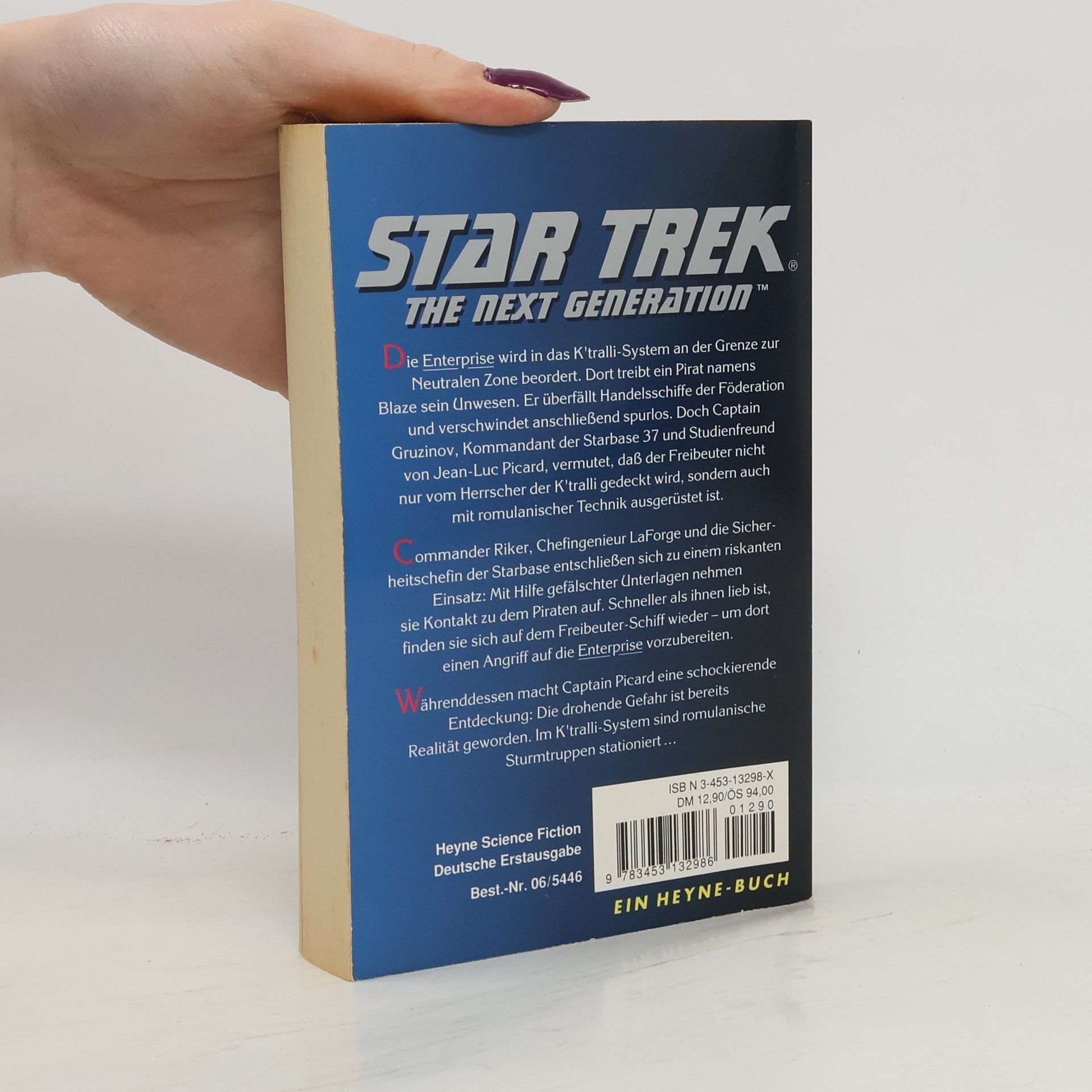 Die Enterprise wird in das Ktralli-System an der Grenze zur Neutralen Zone beordert. Dort treibt ein Pirat namens Blaze sein Unwesen. Er überfällt Handelsschiffe der Föderation und verschwindet anschließend spurlos. Doch Captain Gruzinov, Kommandant der Starbase 37 und Studienfreund von Jean-Luc Picard, vermutet, daß der Freibeuter nicht nur vom Herrscher der K'tralli gedeckt wird, sondern auch mit romulanischer Technik ausgerüstet ist. Commander Riker, Chefingenieur LaForge und die Sicherheitschefin der Starbase entschließen sich zu einem riskanten Einsatz: Mit Hilfe gefälschter Unterlagen nehmen sie Kontakt zu dem Piraten auf. Schneller als ihnen lieb ist, finden sie sich auf dem Freibeuter-Schiff wieder - um dort einen Angriff auf die Enterprise vorzubereiten. Währenddessen macht Captain Picard eine schockierende Entdeckung: Die drohende Gefahr ist bereits Realität geworden. Im K'tralli-System sind romulanische Sturmtruppen stationiert... Heyne Science Fiction Deutsche Erstausgabe