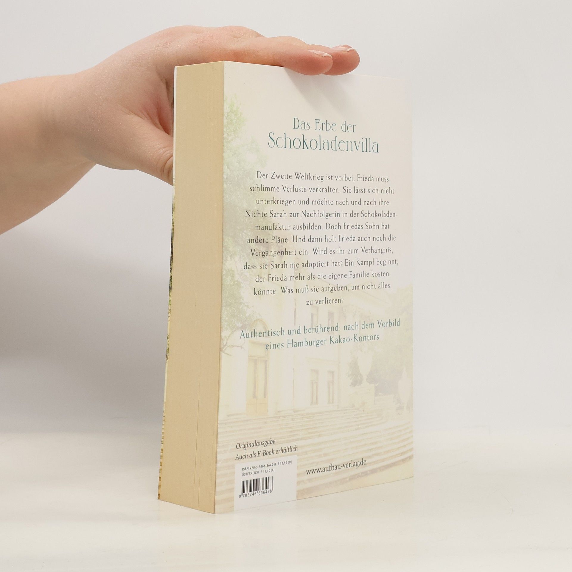 Das Erbe der Schokoladenvilla. Der Zweite Weltkrieg ist vorbei, Frieda muss schlimme Verluste verkraften. Sie lässt sich nicht unterkriegen und möchte nach und nach ihre Nichte Sarah zur Nachfolgerin in der Schokoladenmanufaktur ausbilden. Doch Friedas Sohn hat andere Pläne. Und dann holt Frieda auch noch die Vergangenheit ein. Wird es ihr zum Verhängnis, dass sie Sarah nie adoptiert hat? Ein Kampf beginnt, der Frieda mehr als die eigene Familie kosten könnte. Kann sie diesen Kampf gewinnen? Authentisch und berührend: nach dem Vorbild eines Hamburger Kakao-Kontors