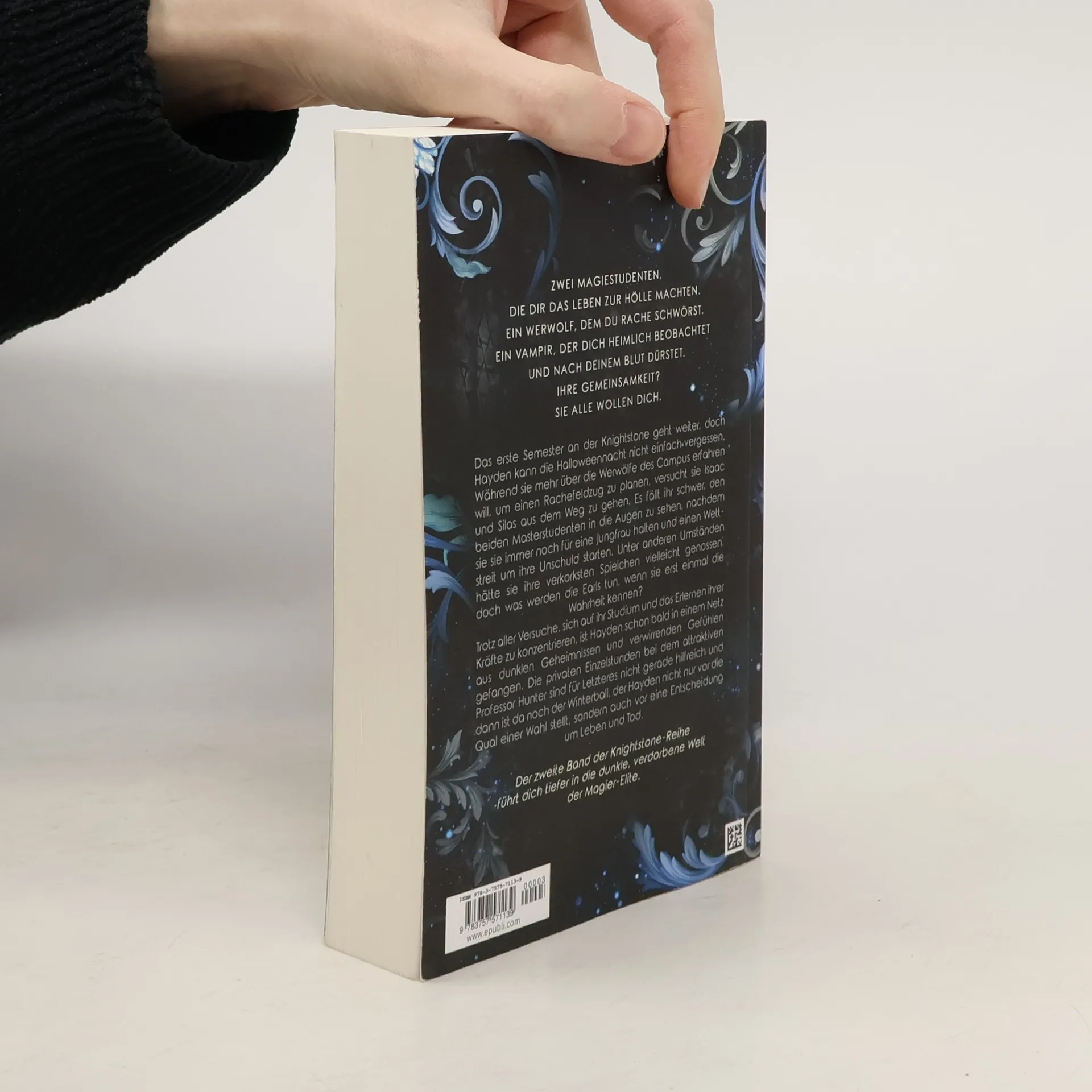 Zwei Magiestudenten machen dir das Leben zur Hölle. Ein Werwolf, dem du Rache schwörst, und ein Vampir, der dich heimlich beobachtet und nach deinem Blut dürstet. Alle wollen dich. Das erste Semester an der Knightstone geht weiter, doch Hayden kann die Halloweennacht nicht vergessen. Während sie mehr über die Werwölfe des Campus erfahren will, um einen Rachefeldzug zu planen, versucht sie, Isaac und Silas zu meiden. Es fällt ihr schwer, den beiden Masterstudenten in die Augen zu sehen, da sie sie immer noch für eine Jungfrau halten und einen Wettstreit um ihre Unschuld starten. Unter anderen Umständen hätte sie diese Aufmerksamkeit vielleicht genossen, doch was werden die beiden Earls tun, wenn sie die Wahrheit erfahren? Trotz ihrer Bemühungen, sich auf ihr Studium und das Erlernen ihrer frisch entdeckten Kräfte zu konzentrieren, gerät Hayden bald in ein Netz aus Geheimnissen, dunklen Machenschaften und verwirrenden Gefühlen. Die privaten Einzelstunden bei dem attraktiven Professor Hunter helfen dabei nicht, und der Winterball stellt sie vor die Qual der Wahl sowie eine Entscheidung um Leben und Tod. Der zweite Band der Knightstone-Reihe führt dich tiefer in die dunkle Welt der Magier-Elite. Achtung: Es handelt sich um Dark Romance, Reverse Harem und Bully Romance. Niedliche Romantasygeschichten sind hier nicht zu erwarten. Enthält direkte Sprache und explizite Szenen.