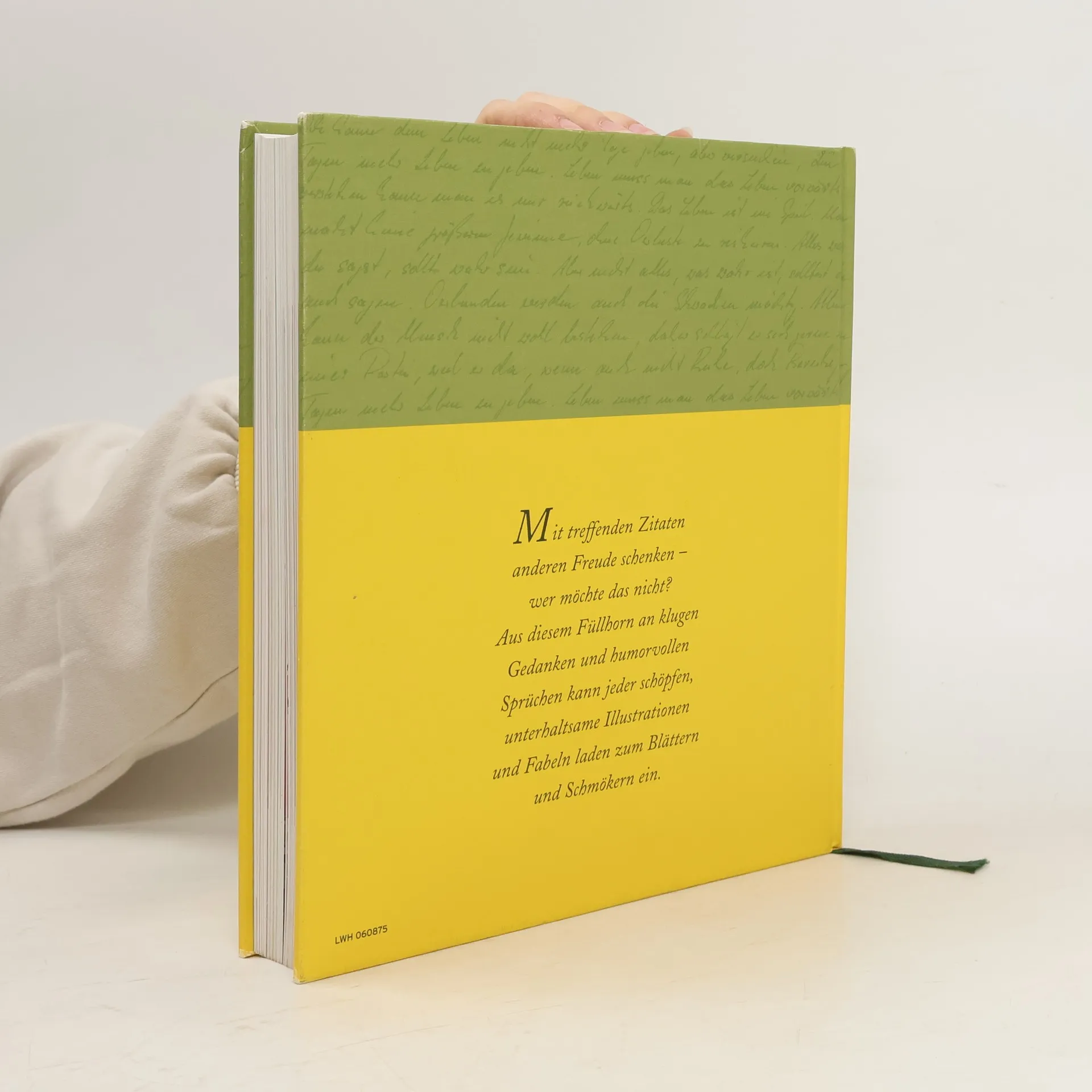 Die passenden Worte zu finden, ist nicht immer einfach. Oft fehlt einem nur die gute Idee für den Anfang oder ein Motto. Mit mehr als 2000 Lebensweisheiten hilft dieses Buch weiter: Die sorgfältig ausgewählten Zitate reichen von der Antike bis zur Gegenwart, stammen von Dichtern, Denkern und Menschen der Zeitgeschichte. Sie sind so übersichtlich gegliedert, dass man schnell das richtige Zitat für jeden Zweck findet. Reichhaltig illustriert und mit Fabeln angereichert, lädt das Buch auch zum Blättern und Schmökern, Innehalten und Schmunzeln ein - so nimmt man es immer wieder gern in die Hand, sei es für zwei Stunden oder auch nur fünf Minuten. Man wird in jedem Fall Gewinn daraus ziehen.