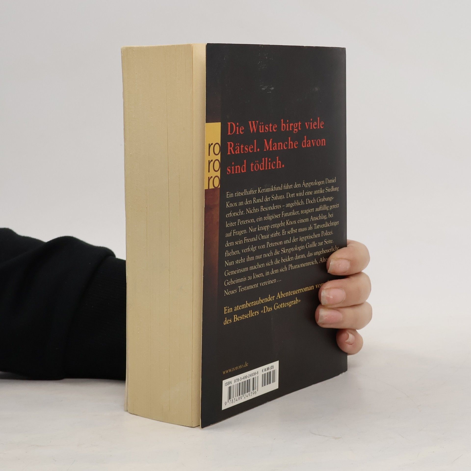 Die Wüste birgt viele Rätsel. Manche davon sind tödlich.Ein rätselhafter Keramikfund führt den Ägyptologen Daniel Knox an den Rand der Sahara. Dort wird eine antike Siedlung erforscht. Nichts Besonderes – angeblich. Doch Grabungsleiter Peterson, ein religiöser Fanatiker, reagiert auffällig gereizt auf Fragen. Nur knapp entgeht Knox einem Anschlag, bei dem sein Freund Omar stirbt. Er selbst muss als Tatverdächtiger fliehen, verfolgt von Peterson und der ägyptischen Polizei. Nun steht ihm nur noch die Skryptologin Gaille zur Seite. Gemeinsam machen sich die beiden daran, das ungeheuerliche Geheimnis zu lösen, in dem sich Pharaonenreich, Altes und Neues Testament vereinen....Ein atemberaubender Abenteuerroman vom Autor des Bestsellers «Das Gottesgrab»