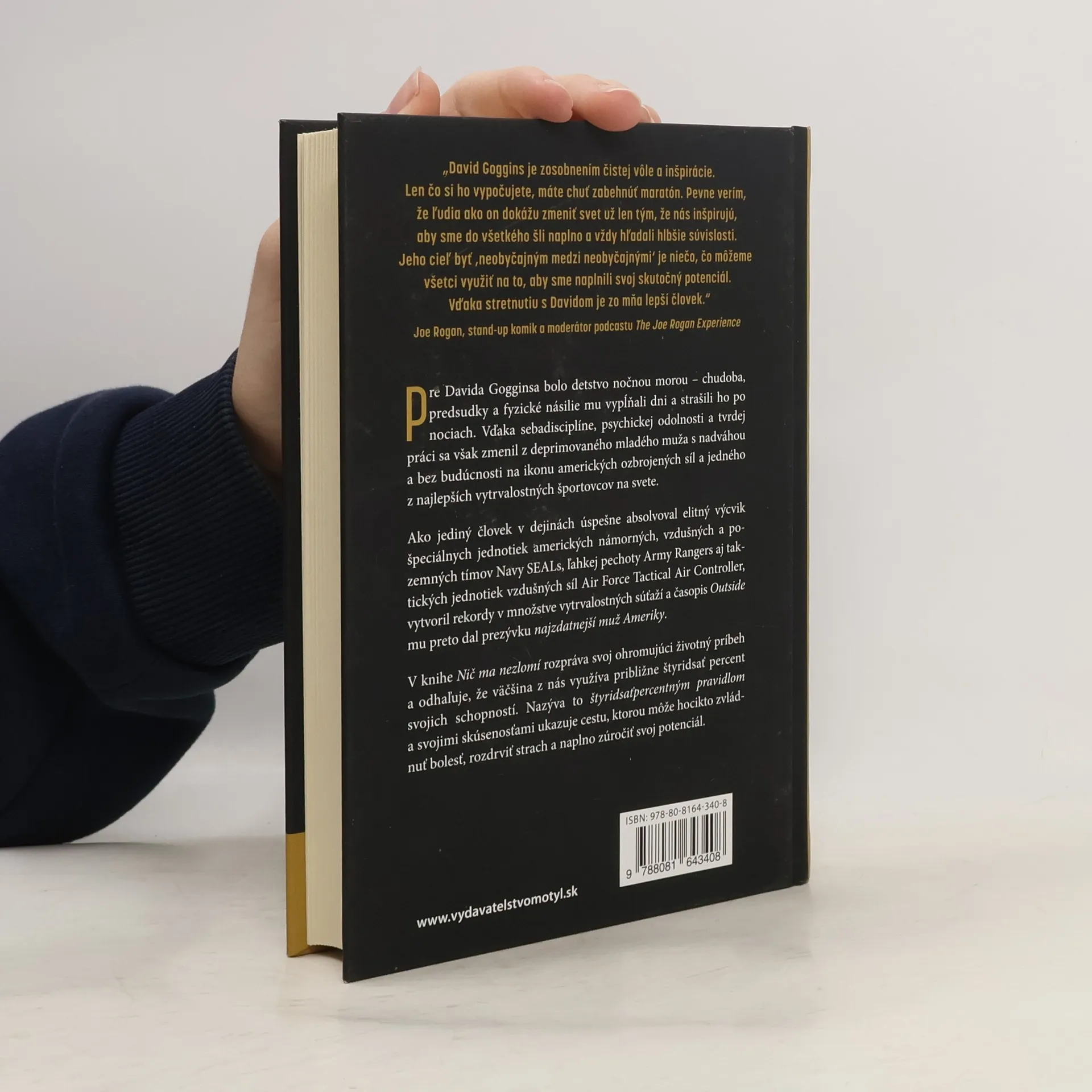 V knihe Nič ma nezlomí rozpráva David svoj ohromujúci životný príbeh a odhaľuje, že väčšina z nás využíva približne štyridsať percent svojich schopností. Nazýva to štyridsaťpercentným pravidlom a svojimi skúsenosťami ukazuje cestu, ktorou môže hocikto zvládnuť bolesť, rozdrviť strach a naplno zúročiť svoj potenciál.Pre Davida Gogginsa bolo detstvo nočnou morou - chudoba, predsudky a fyzické násilie mu vypĺňali dni a strašili ho po nociach. Vďaka sebadisciplíne, psychickej odolnosti a tvrdej práci sa však zmenil z deprimovaného mladého muža s nadváhou a bez budúcnosti na ikonu amerických ozbrojených síl a jedného z najlepších vytrvalostných športovcov na svete.