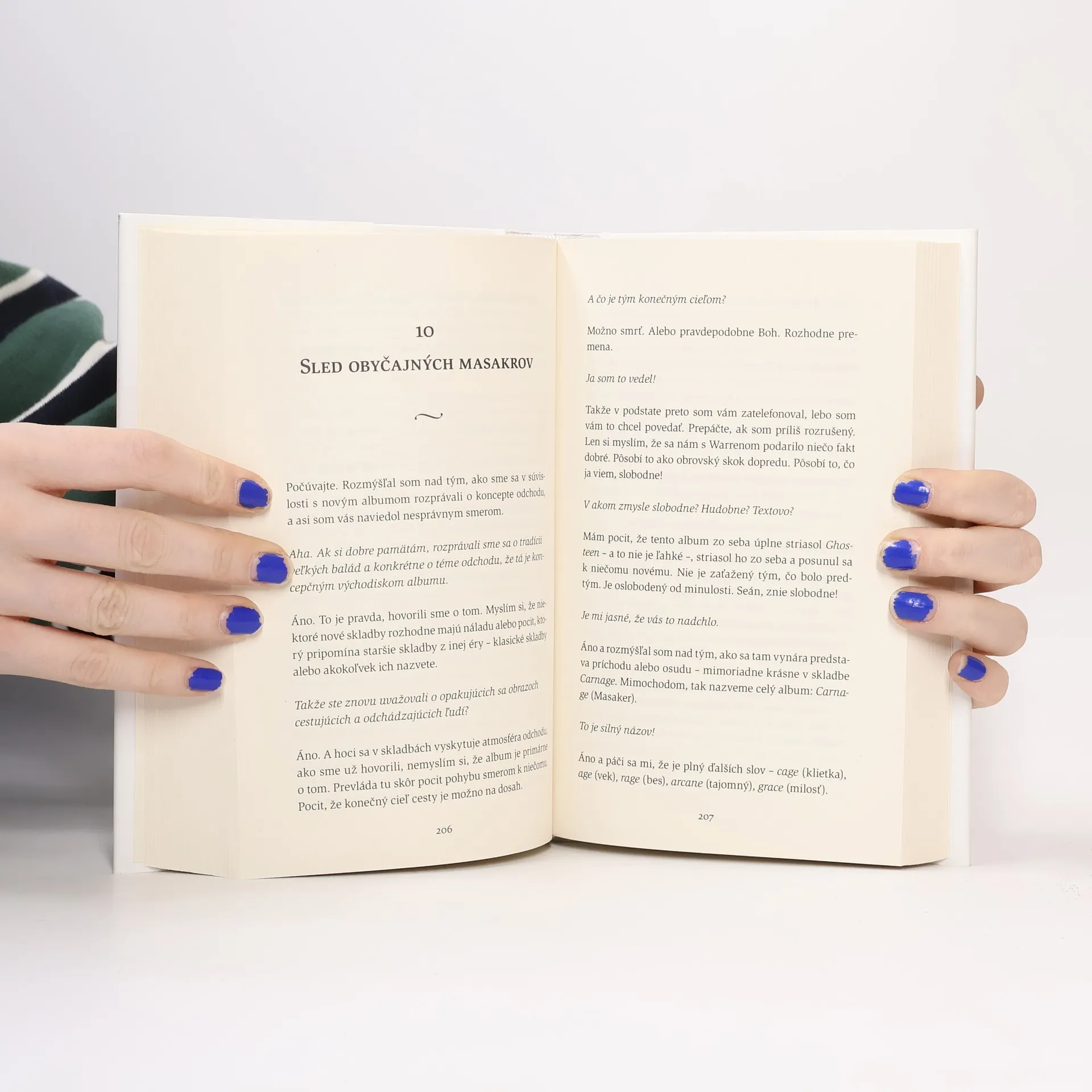 Viera, nádej a masaker je kniha o vnútornom živote Nicka Cava. Vznikla na základe vyše štyridsiatich hodín dôverných rozhovorov s novinárom Seánom O'Haganom a poctivo hľadá odpovede na otázku, čo je skutočnou hnacou silou Cavovho života a tvorby. Rozhovory sa dotýkajú tém ako viera, umenie, hudba, sloboda, žiaľ či láska. Otvorene rozoberajú život Nicka Cava od detstva až po súčasnosť, jeho lásky, pracovnú etiku aj dramatickú premenu, ktorou v posledných rokoch prešiel. Kniha Viera, nádej a masaker sa nevyhýba neprebádaným územiam a temným hlbinám, no zároveň ponúka nádej a inšpiráciu od skutočného tvorivého génia.