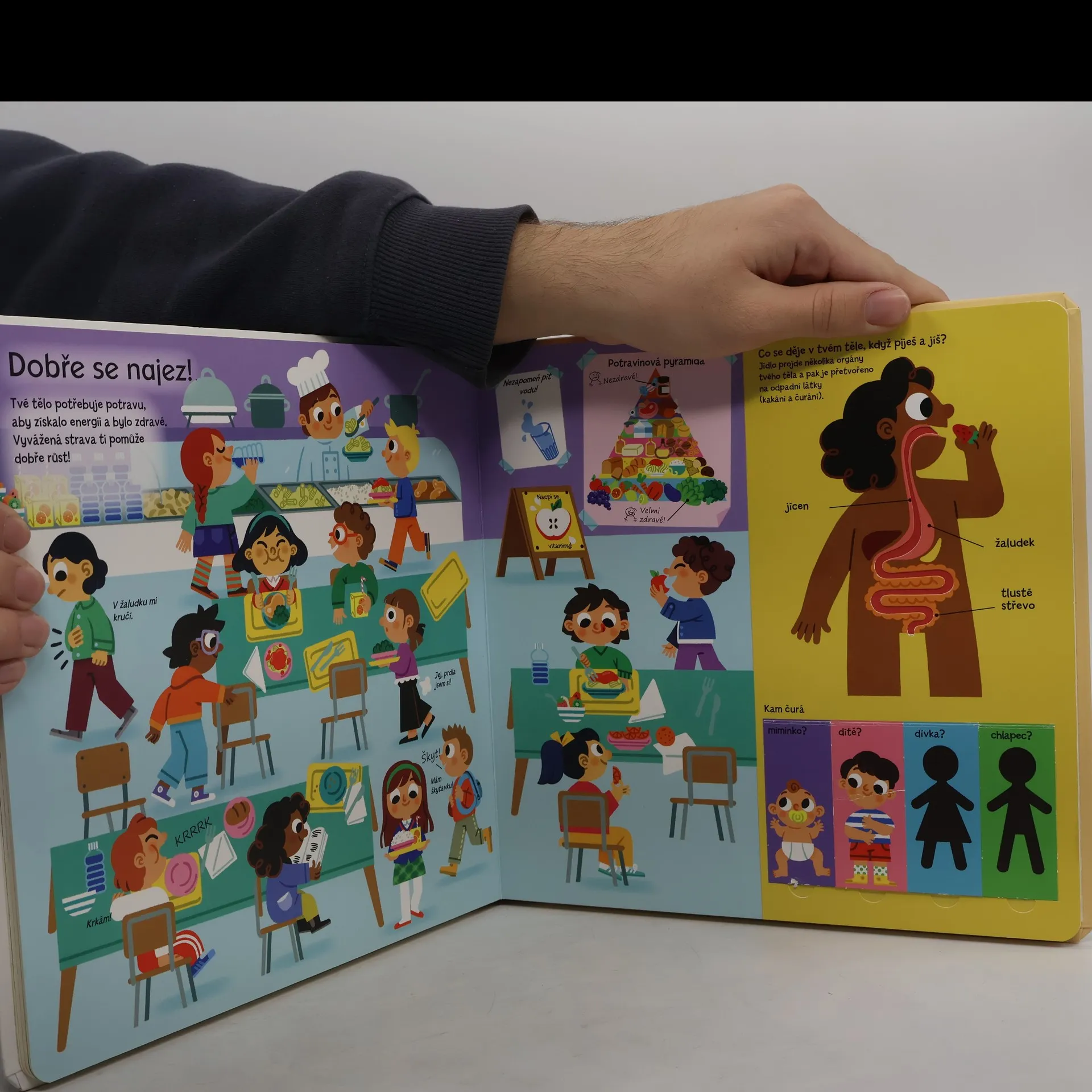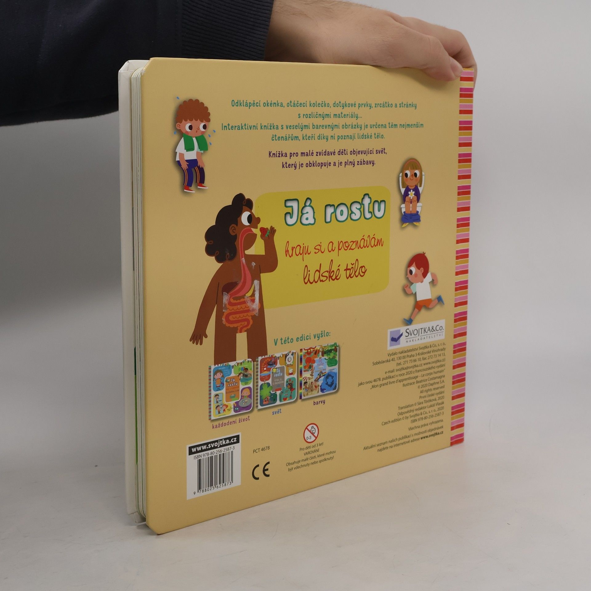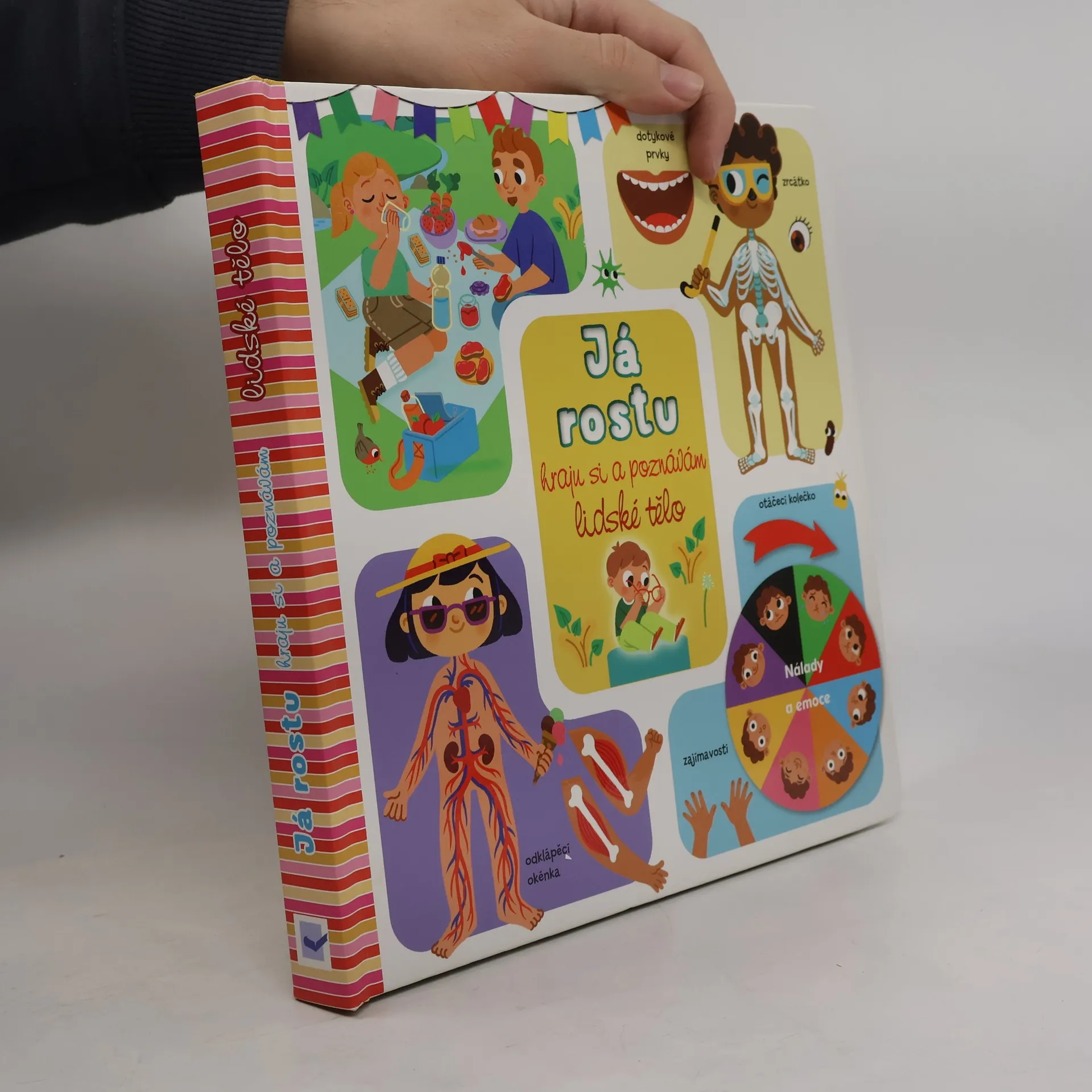 Otevři odklápěcí okénka a podívej se pod obrázky. Vyzkoušej si stránky s různými materiály a zatoč si kolečkem, které ti odhalí spoustu zajímavostí. Užij si zábavu se všemi interaktivními prvky - vytahování obrázků, otáčecí kolečko, odklápěcí okénka či zábavné zrcátko. Tato knížka je určena nejmenším dětem, které se díky ní blíže seznámí s vlastním tělem a procvičí si také jemnou motoriku. Lidské tělo je rozhodně zajímavý objekt hodný zkoumání, který dokáže spoustu věcí. Zjisti, jak se s věkem měníš, co se s tebou děje, když ti není dobře nebo onemocníš. Prozkoumej, z čeho se skládá tvé tělo a hlavně co máš všechno uvnitř! Objev všech pět smyslů a pořádně probádej emoce a nálady. Krásné ilustrace, zajímavé informace a hravá forma knížky rozhodně udrží pozornost a zájem dětí.