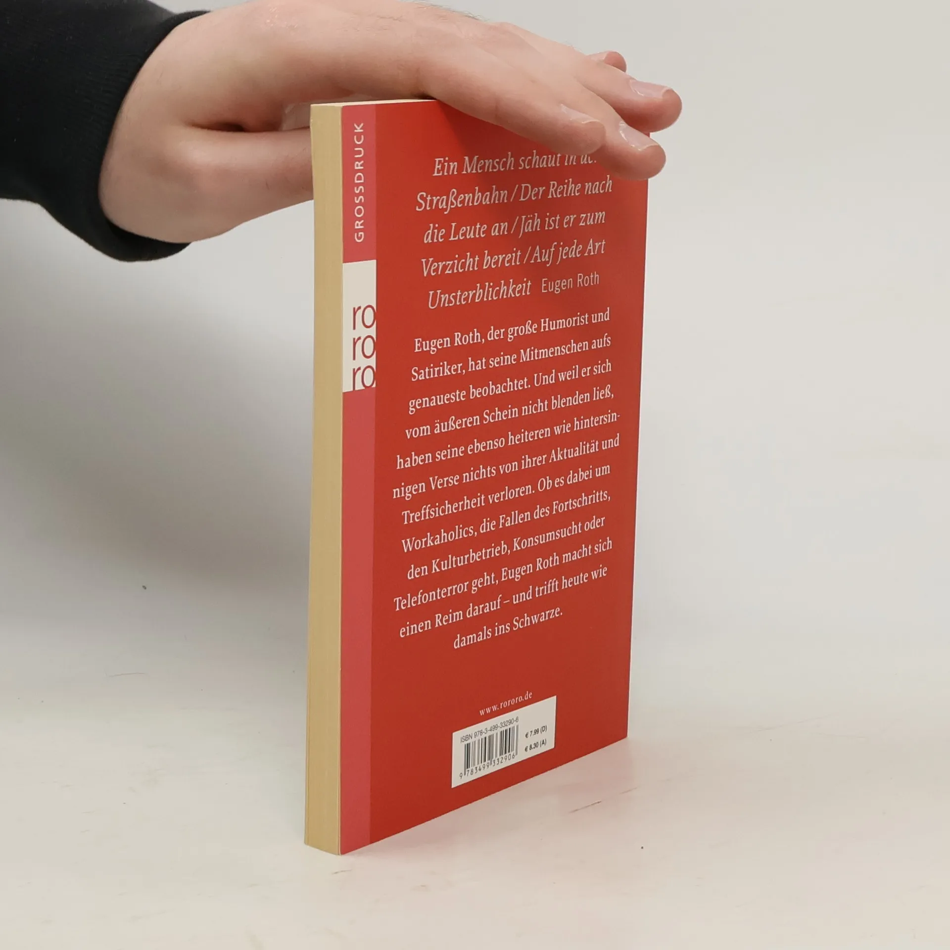 Ein Mensch schaut in der Straßenbahn / Der Reihe nach die Leute an / Jäh ist er zum Verzicht bereit /Auf jede Art Unsterblichkeit Eugen Roth Eugen Roth, der große Humorist und Satiriker, hat seine Mitmenschen aufs genaueste beobachtet. Und weil er sich vom äußeren Schein nicht blenden ließ, haben seine ebenso heiteren wie hintersinnigen Verse nichts von ihrer Aktualität und Treffsicherheit verloren. Ob es dabei um Workaholics, die Fallen des Fortschritts, den Kulturbetrieb, Konsumsucht oder Telefonterror geht, Eugen Roth macht sich einen Reim darauf – und trifft heute wie damals ins Schwarze.