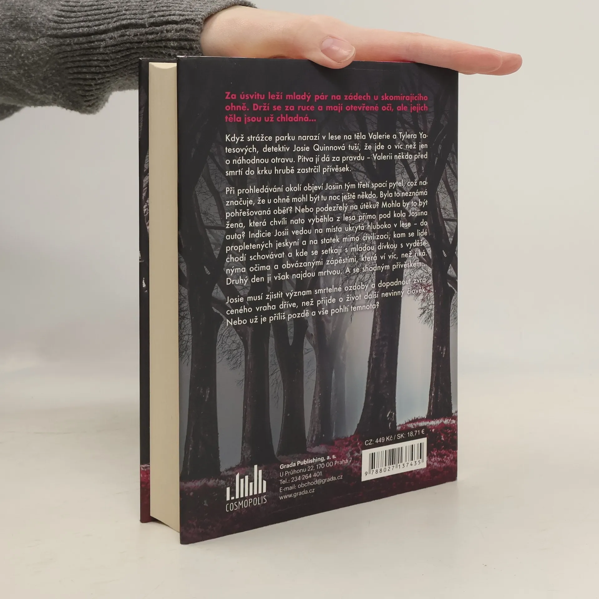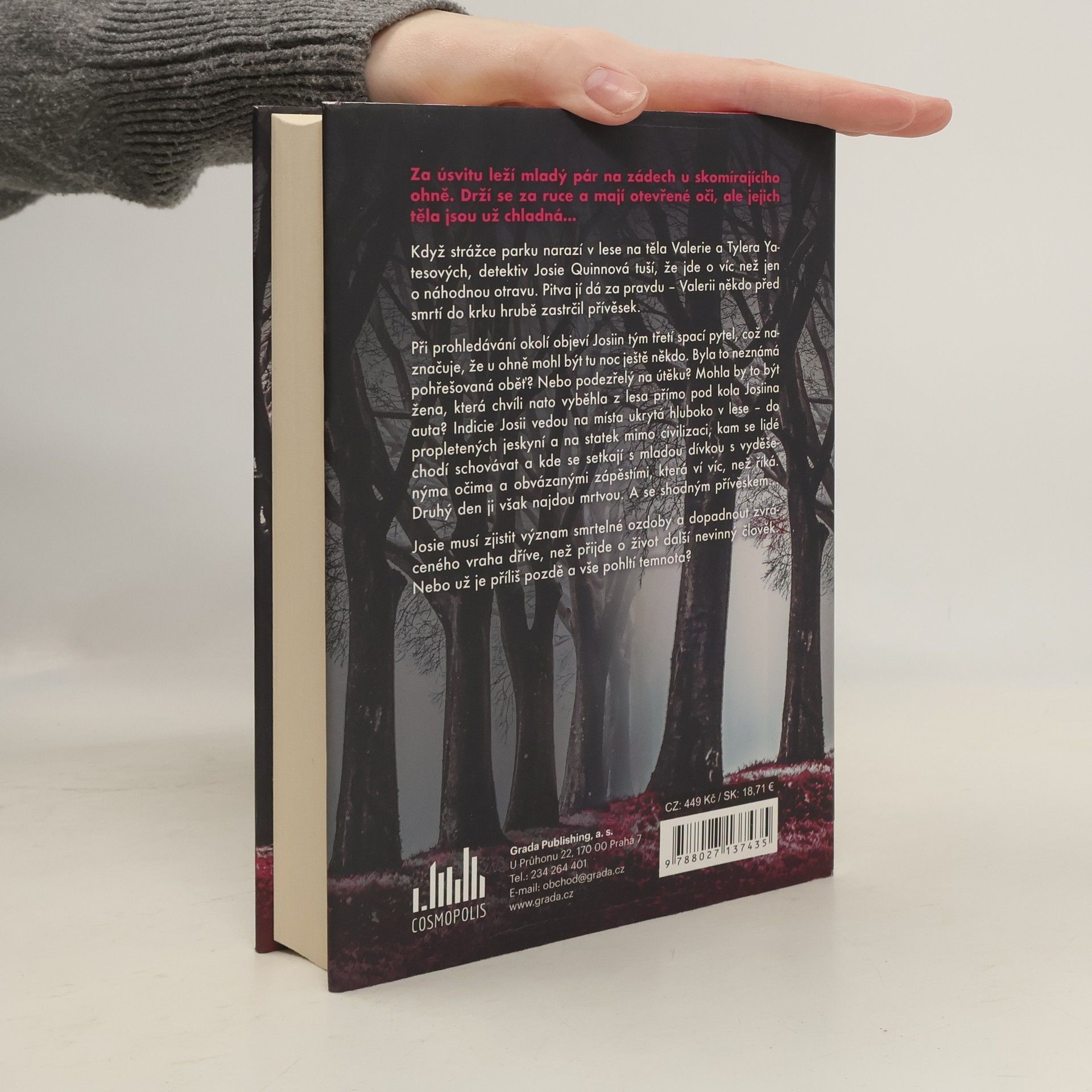 Za úsvitu leží mladý pár na zádech u skomírajícího ohně. Drží se za ruce a mají otevřené oči, ale jejich těla jsou už chladná...Když strážce parku narazí v lese na těla Valerie a Tylera Yatesových, detektiv Josie Quinnová tuší, že jde o víc než jen o náhodnou otravu. Pitva jí dá za pravdu – Valerii někdo před smrtí do krku hrubě zastrčil přívěsek.Při prohledávání okolí objeví Josiin tým třetí spací pytel, což naznačuje, že u ohně mohl být tu noc ještě někdo. Byla to neznámá pohřešovaná oběť? Nebo podezřelý na útěku? Mohla by to být žena, která chvíli nato vyběhla z lesa přímo pod kola Josiina auta? Indicie Josii vedou na místa ukrytá hluboko v lese – do propletených jeskyní a na statek mimo civilizaci, kam se lidé chodí schovávat a kde se setkají s mladou dívkou s vyděšenýma očima a obvázanými zápěstími, která ví víc, než říká. Druhý den ji však najdou mrtvou. A se shodným přívěskemJosie musí zjistit význam smrtelné ozdoby a dopadnout zvráceného vraha dříve, než přijde o život další nevinný člověk. Nebo už je příliš pozdě a vše pohltí temnota?