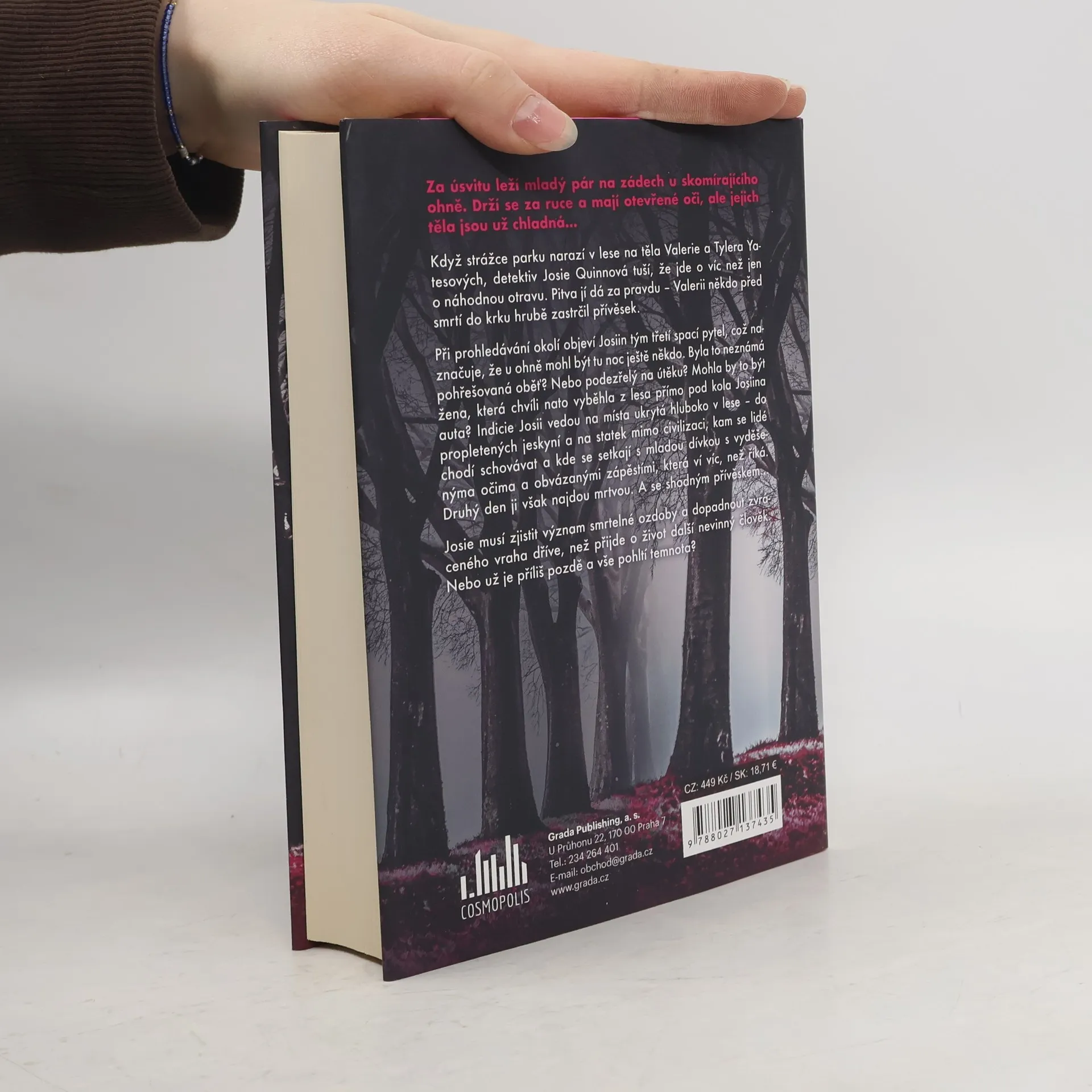 Za úsvitu leží mladý pár na zádech u skomírajícího ohně. Drží se za ruce a mají otevřené oči, ale jejich těla jsou už chladná...Když strážce parku narazí v lese na těla Valerie a Tylera Yatesových, detektiv Josie Quinnová tuší, že jde o víc než jen o náhodnou otravu. Pitva jí dá za pravdu – Valerii někdo před smrtí do krku hrubě zastrčil přívěsek.Při prohledávání okolí objeví Josiin tým třetí spací pytel, což naznačuje, že u ohně mohl být tu noc ještě někdo. Byla to neznámá pohřešovaná oběť? Nebo podezřelý na útěku? Mohla by to být žena, která chvíli nato vyběhla z lesa přímo pod kola Josiina auta? Indicie Josii vedou na místa ukrytá hluboko v lese – do propletených jeskyní a na statek mimo civilizaci, kam se lidé chodí schovávat a kde se setkají s mladou dívkou s vyděšenýma očima a obvázanými zápěstími, která ví víc, než říká. Druhý den ji však najdou mrtvou. A se shodným přívěskemJosie musí zjistit význam smrtelné ozdoby a dopadnout zvráceného vraha dříve, než přijde o život další nevinný člověk. Nebo už je příliš pozdě a vše pohltí temnota?