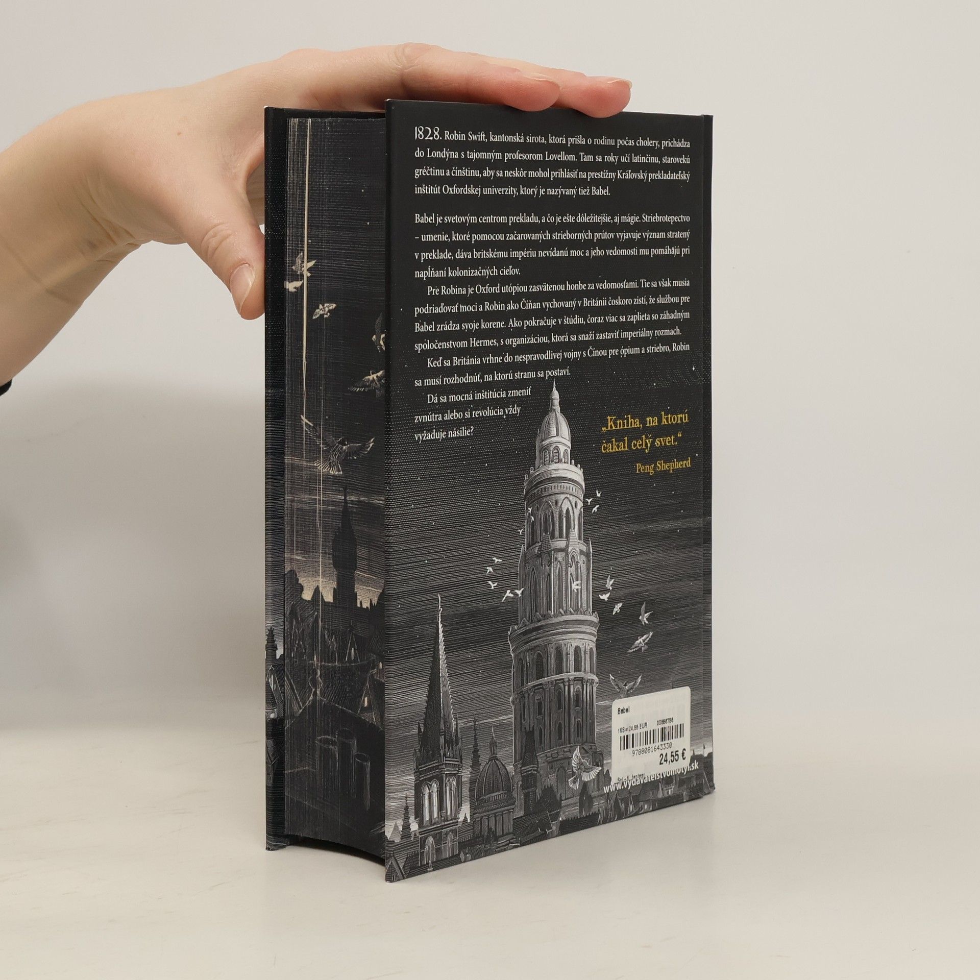 Traduttore, traditore: akt prekladu je vždy aktom zrady. 1828. Robin Swift, kantonská sirota, ktorá prišla o rodinu počas cholery, prichádza do Londýna s tajomným profesorom Lovellom. Tam sa roky učí latinčinu, starovekú gréčtinu a čínštinu, aby sa neskôr mohol prihlásiť na prestížny Kráľovský prekladateľský inštitút Oxfordskej univerzity, ktorý je nazývaný tiež Babel. Babel je svetovým centrom prekladu, a čo je ešte dôležitejšie, aj mágie. Striebrotepectvo – umenie, ktoré pomocou začarovaných strieborných paličiek vyjavuje význam stratený v preklade, dáva britskému impériu nevídanú moc a jeho vedomosti mu pomáhajú pri napĺňaní kolonizačných cieľov. Pre Robina je Oxford utópiou zasvätenou honbe za vedomosťami. Tie sa však musia podriaďovať moci a Robin ako Číňan vychovaný v Británii čoskoro zistí, že službou pre Babel zrádza svoje korene. Ako pokračuje v štúdiu, čoraz viac sa zaplieta so záhadným Hermesovým spolkom, s organizáciou, ktorá sa snaží zastaviť imperiálny rozmach. Keď sa Británia vrhne do nespravodlivej vojny s Čínou pre ópium a striebro, Robin sa musí rozhodnúť, na ktorú stranu sa postaví. Dá sa mocná inštitúcia zmeniť zvnútra, alebo revolúcia vždy vyžaduje násilie?