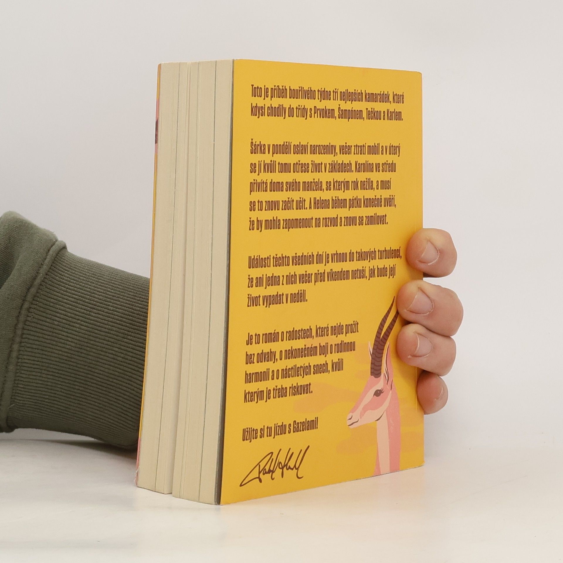Gazely vypráví příběh jednoho bouřlivého týdne tří blízkých kamarádek, které kdysi chodily do školy s Prvokem, Šampónem, Tečkou a Karlem. Šárka začíná týden narozeninovou oslavou, ale ztráta mobilu jí už v úterý převrátí život naruby. Karolína se ve středu setkává se svým manželem, se kterým po roce odloučení zkouší obnovit vztah. Helena v pátek zjišťuje, že by mohla nechat rozvod za sebou a znovu najít lásku. Během těchto několika dní se jejich životy ocitnou ve víru změn, takže ani jedna z nich nemá tušení, jaké překvapení je čeká do neděle. Tento román je o radosti, která vyžaduje odvahu, o neustálém úsilí najít rovnováhu v rodině a o snech z mládí, kvůli kterým stojí za to riskovat.