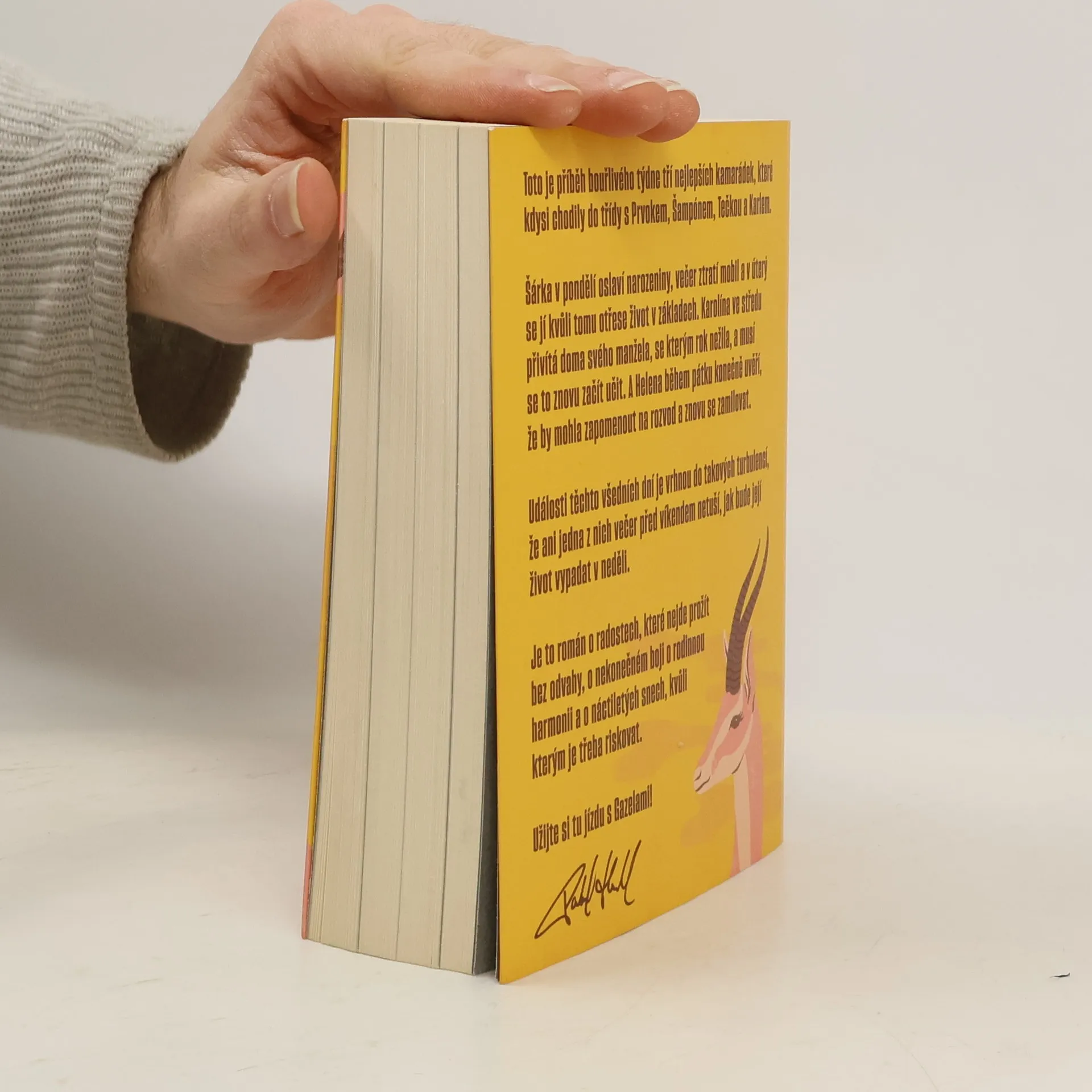 Gazely vypráví příběh jednoho bouřlivého týdne tří blízkých kamarádek, které kdysi chodily do školy s Prvokem, Šampónem, Tečkou a Karlem. Šárka začíná týden narozeninovou oslavou, ale ztráta mobilu jí už v úterý převrátí život naruby. Karolína se ve středu setkává se svým manželem, se kterým po roce odloučení zkouší obnovit vztah. Helena v pátek zjišťuje, že by mohla nechat rozvod za sebou a znovu najít lásku. Během těchto několika dní se jejich životy ocitnou ve víru změn, takže ani jedna z nich nemá tušení, jaké překvapení je čeká do neděle. Tento román je o radosti, která vyžaduje odvahu, o neustálém úsilí najít rovnováhu v rodině a o snech z mládí, kvůli kterým stojí za to riskovat.